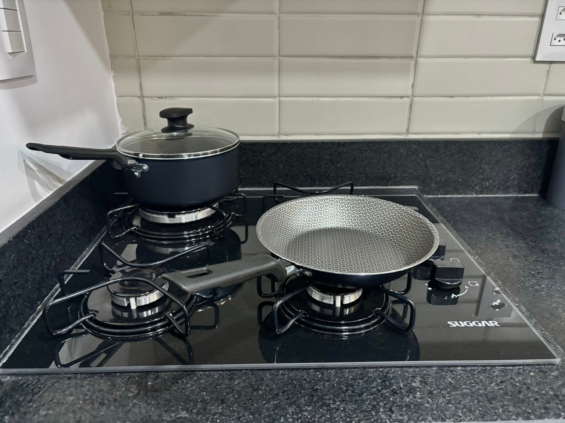 • Geladeira, micro-ondas, fogão a gás, liquidificador, cafeteira, sanduicheira, panelas, utensílios e louças.