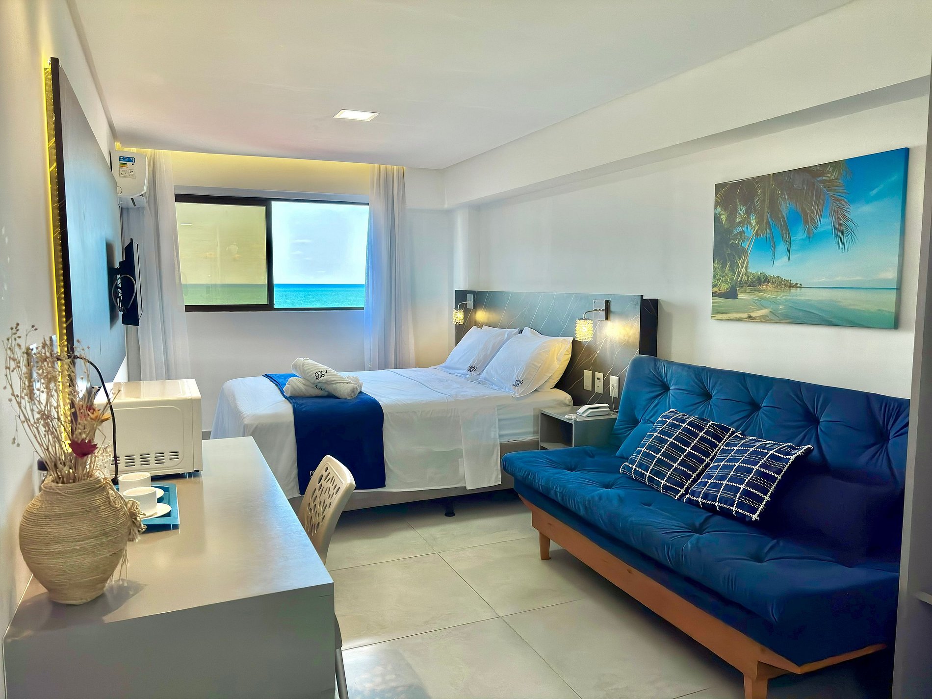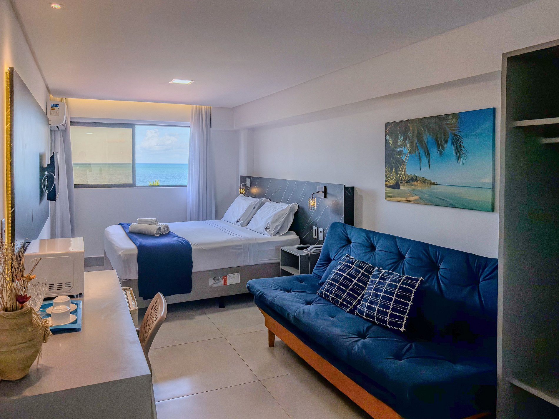 Suíte confortável de no 5º andar de um moderno hotel à beira mar da Praia de Manaíra. Acomoda até 3 pessoas, com cama queen, sofá-cama, smart TV, espaço para trabalho com Wi-Fi. O hotel conta com piscina na cobertura com vista para o mar, bar, academia, restaurante, e recepção 24h. Localização privilegiada, perto de restaurantes, farmácias, mercados e shoppings próximos. Ideal para quem busca conforto e ótima localização.