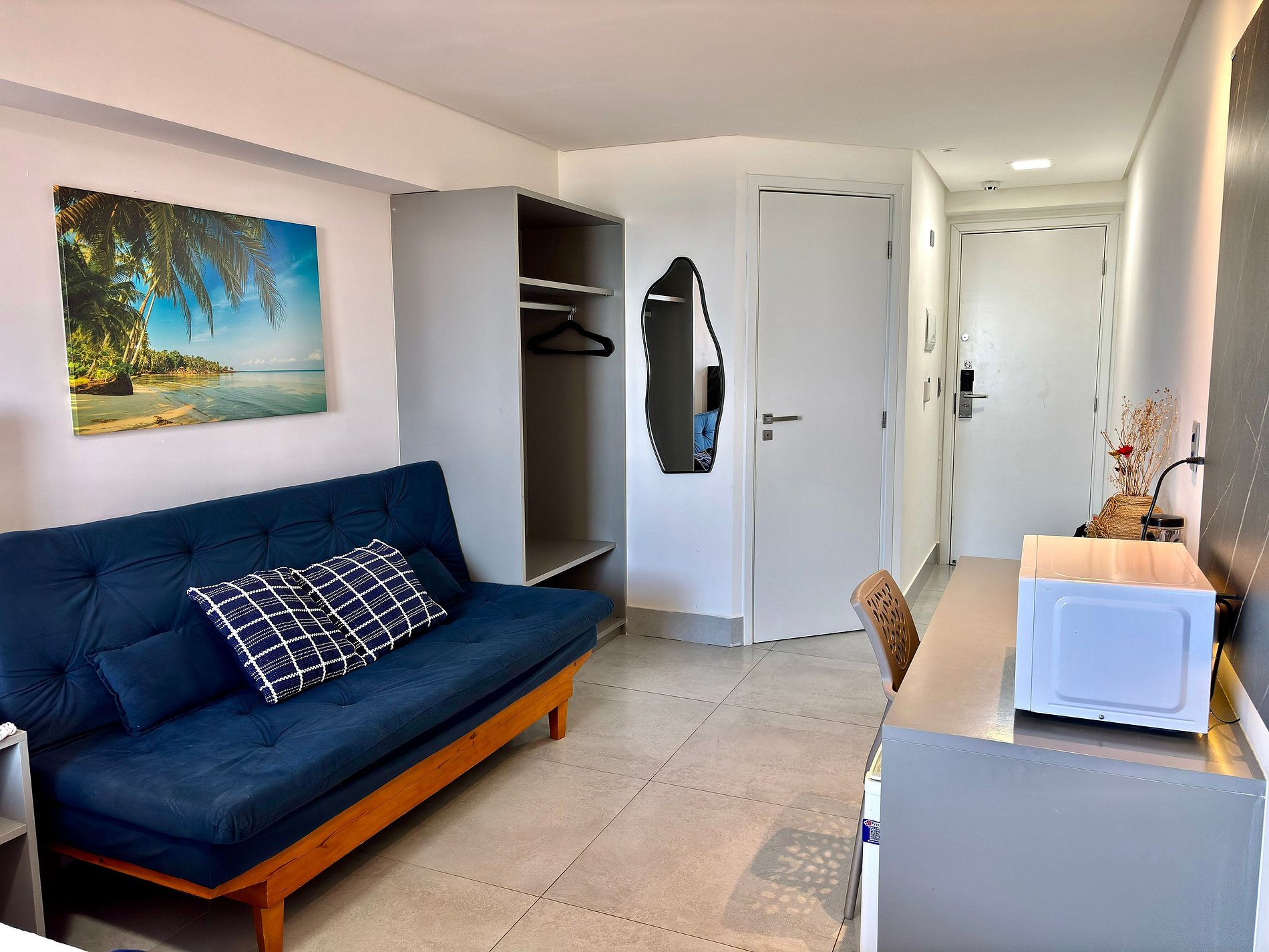 Desfrute de um estúdio novo de 20m² em um hotel à beira-mar. Ideal para até 3 pessoas que buscam momentos de descanso e lazer.