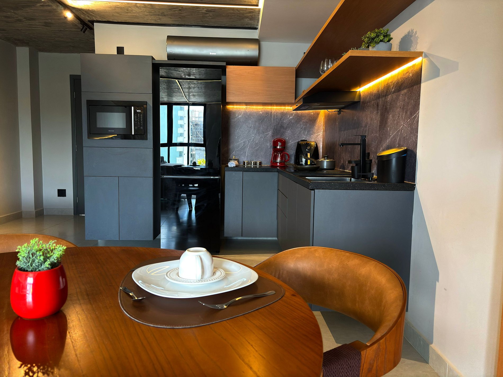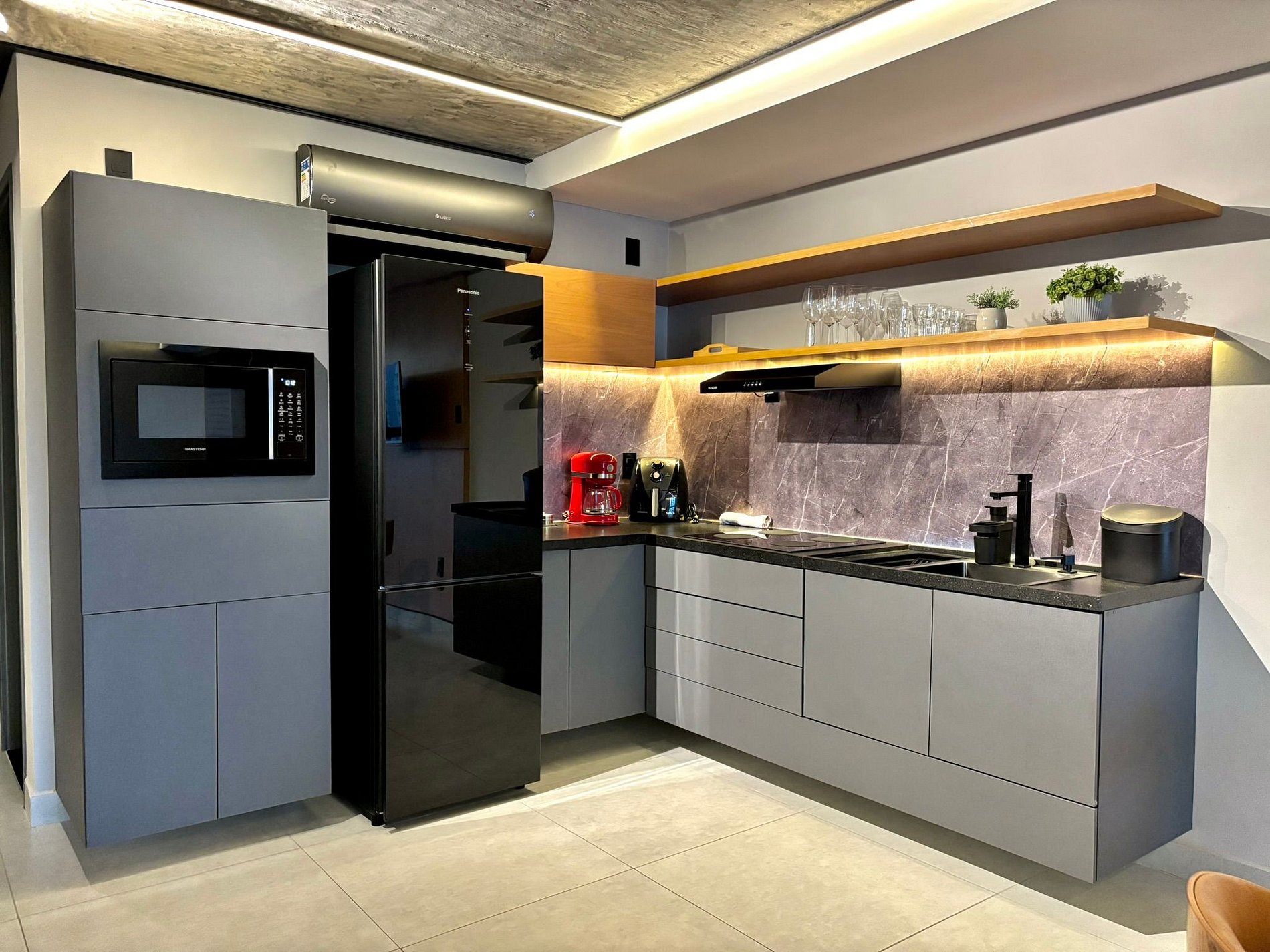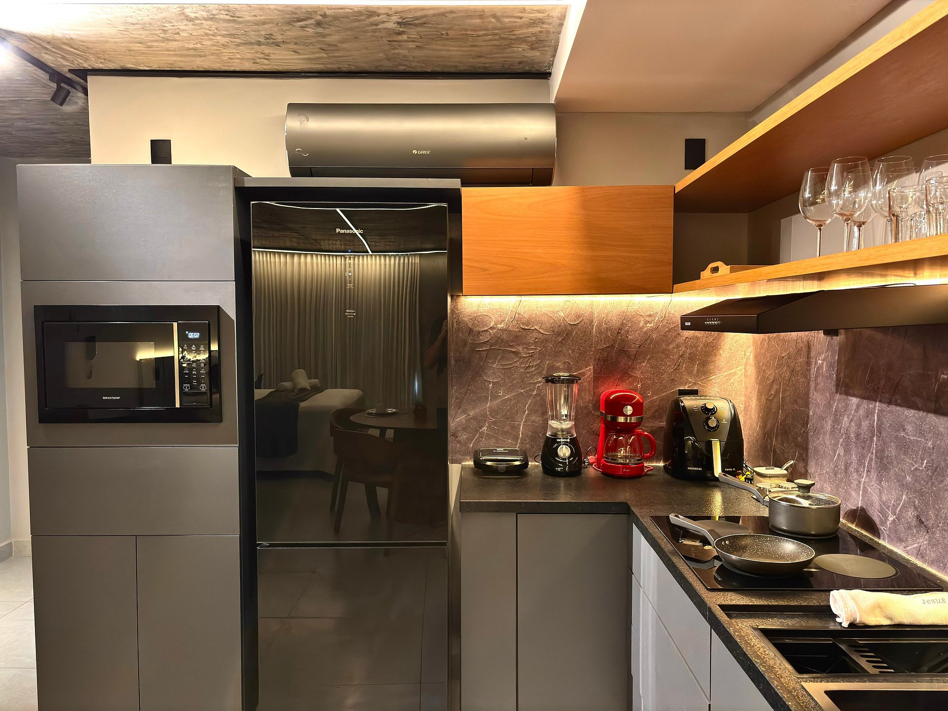 • Geladeira, micro-ondas, fogão por indução, cafeteira, airfryer, liquidificador, sanduicheira, panelas, utensílios e louças.