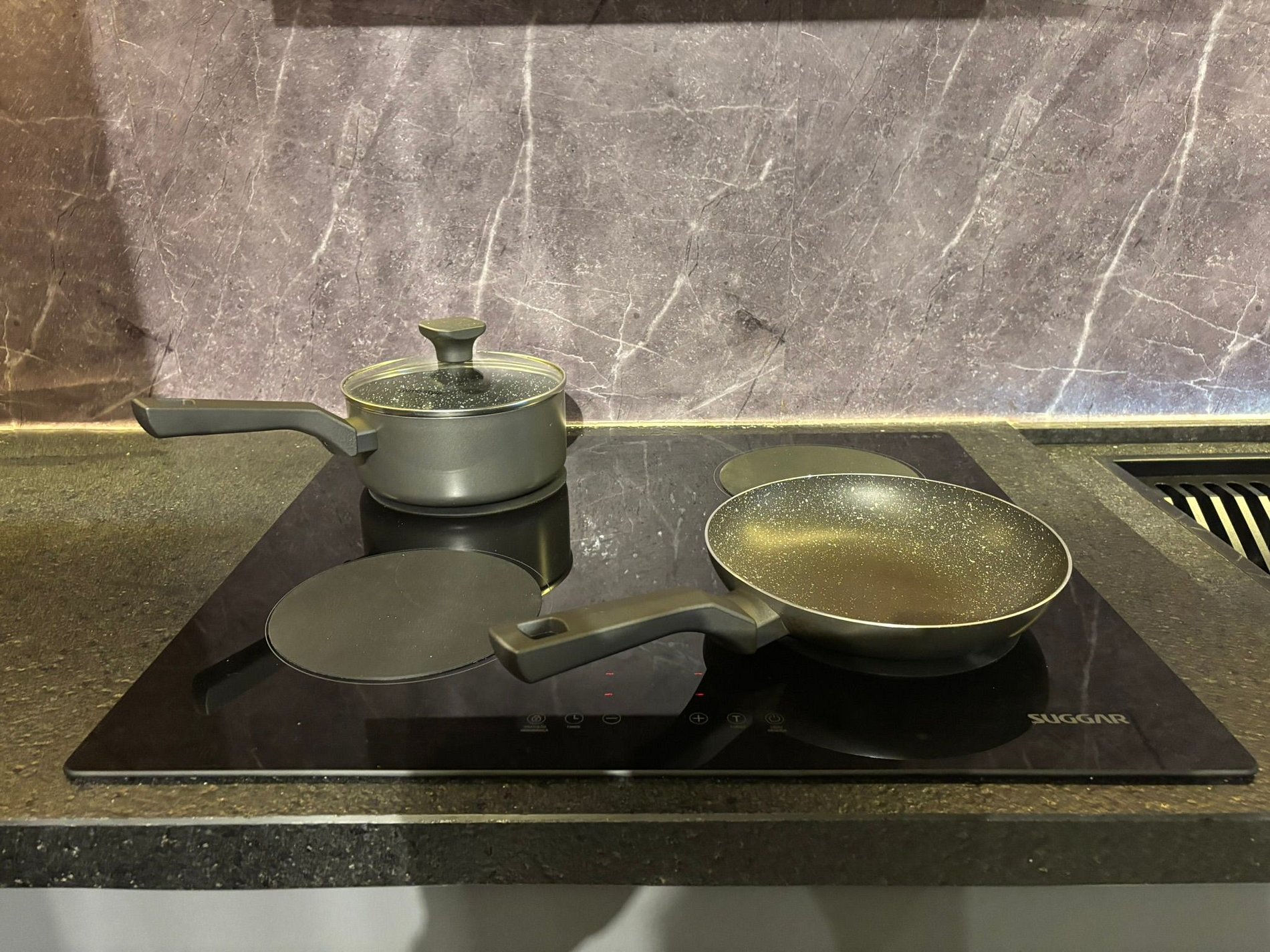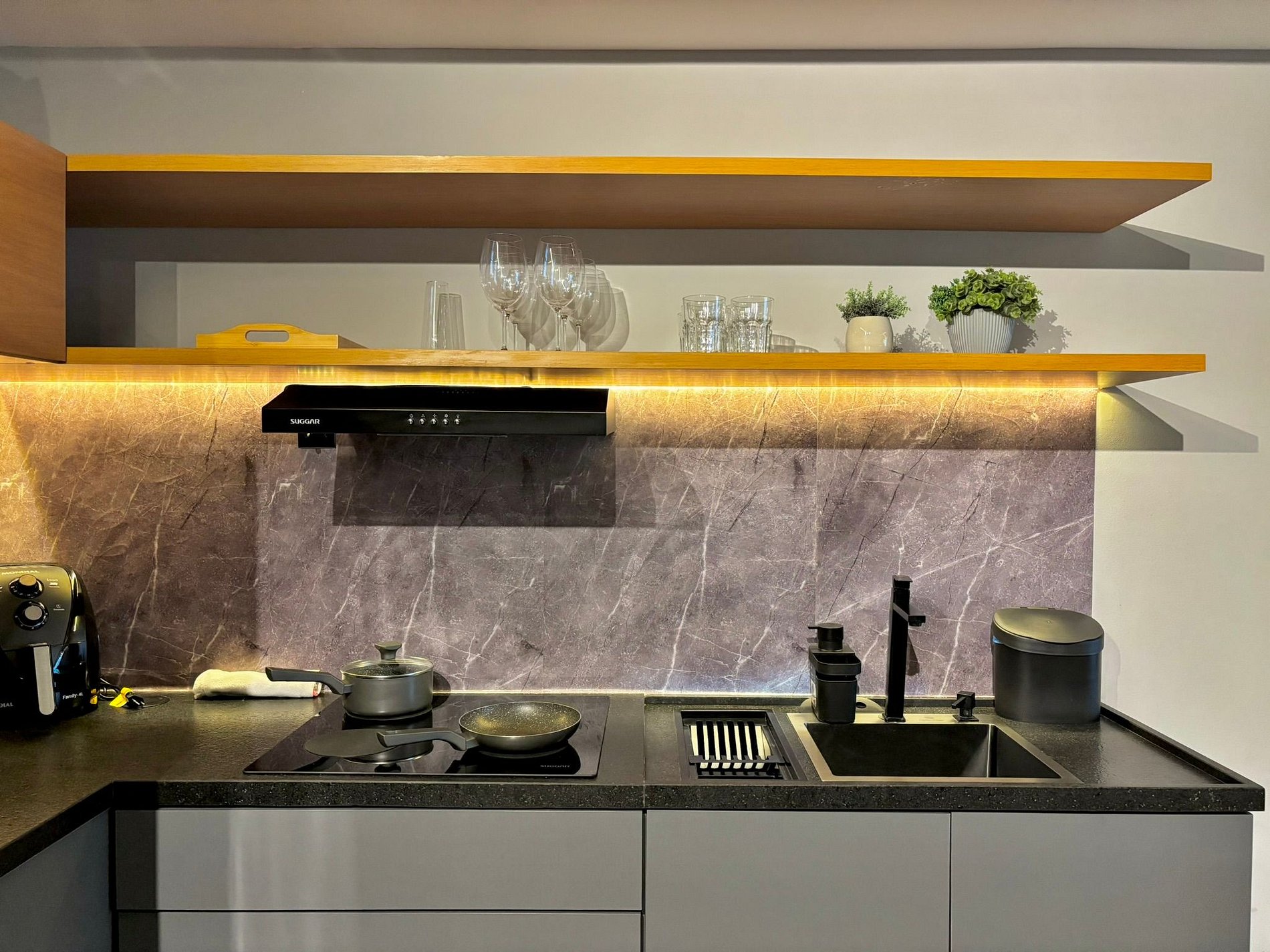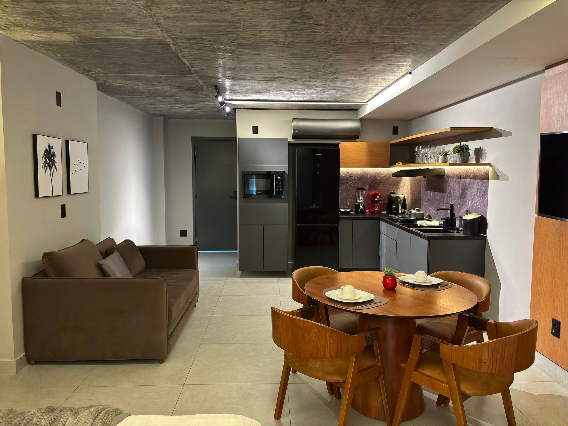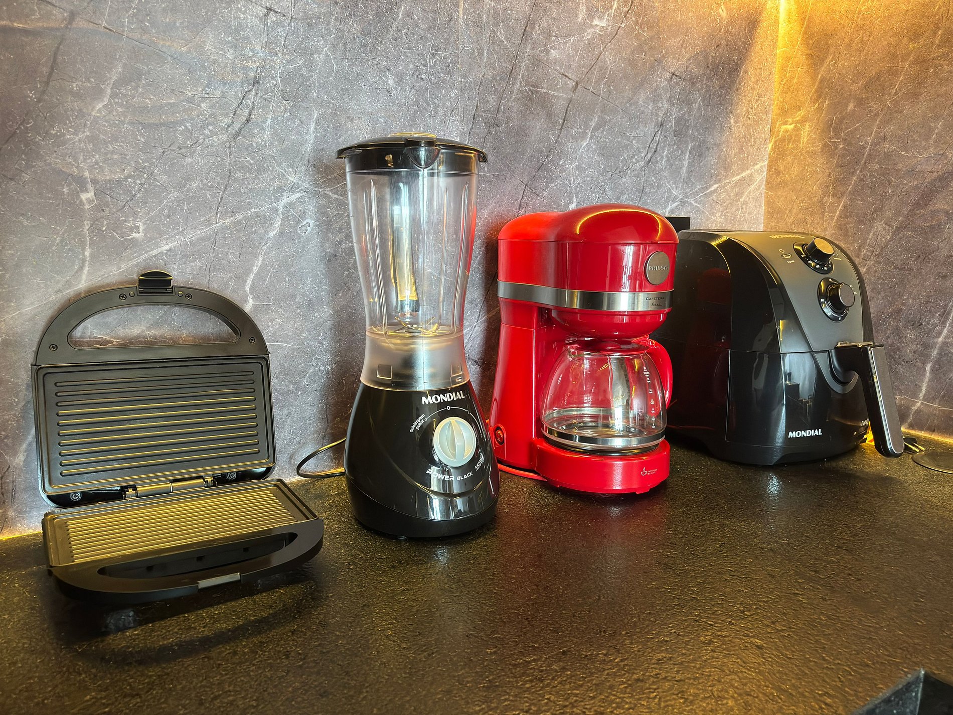• Geladeira, micro-ondas, fogão por indução, cafeteira, airfryer, liquidificador, sanduicheira, panelas, utensílios e louças.