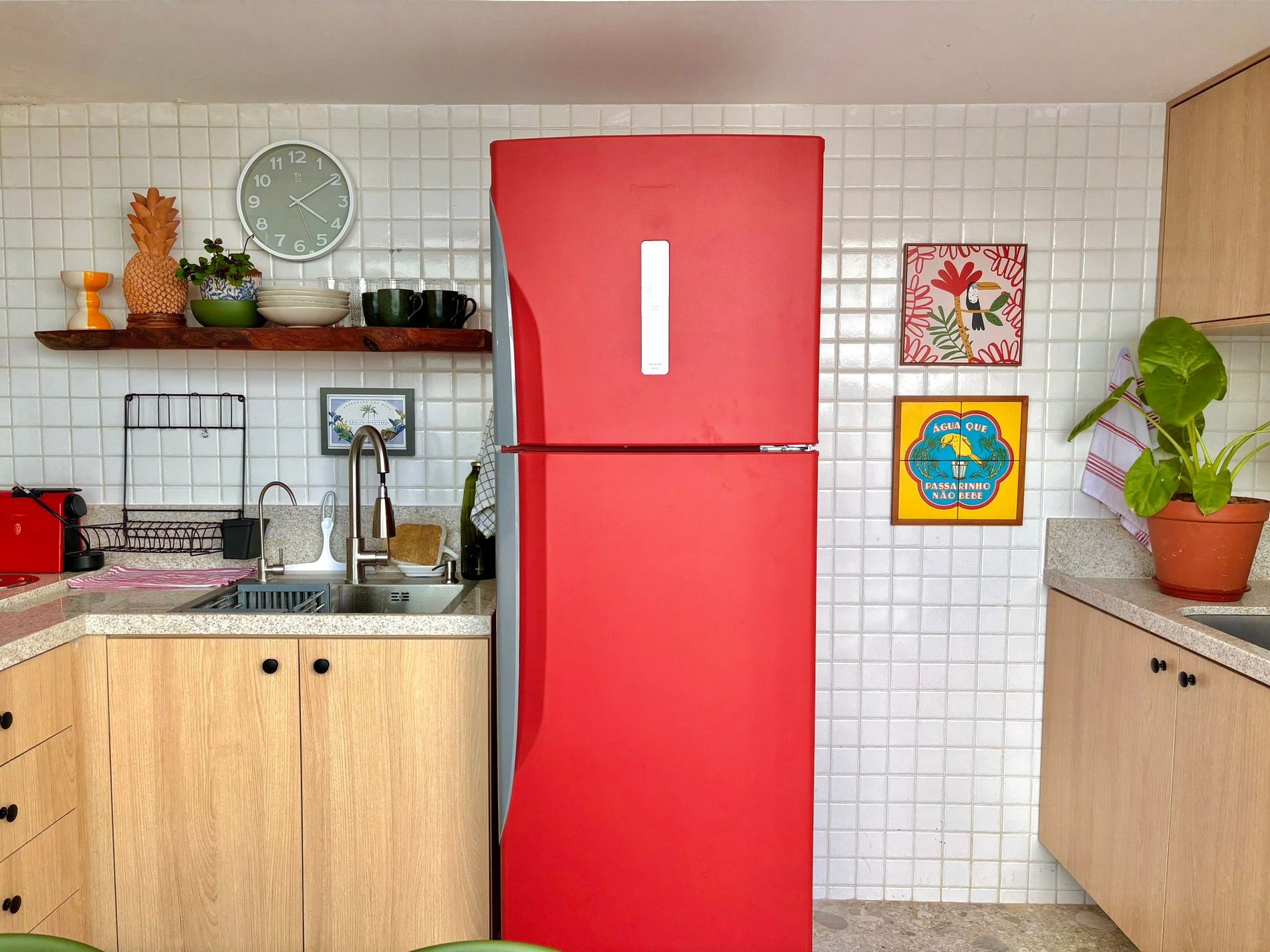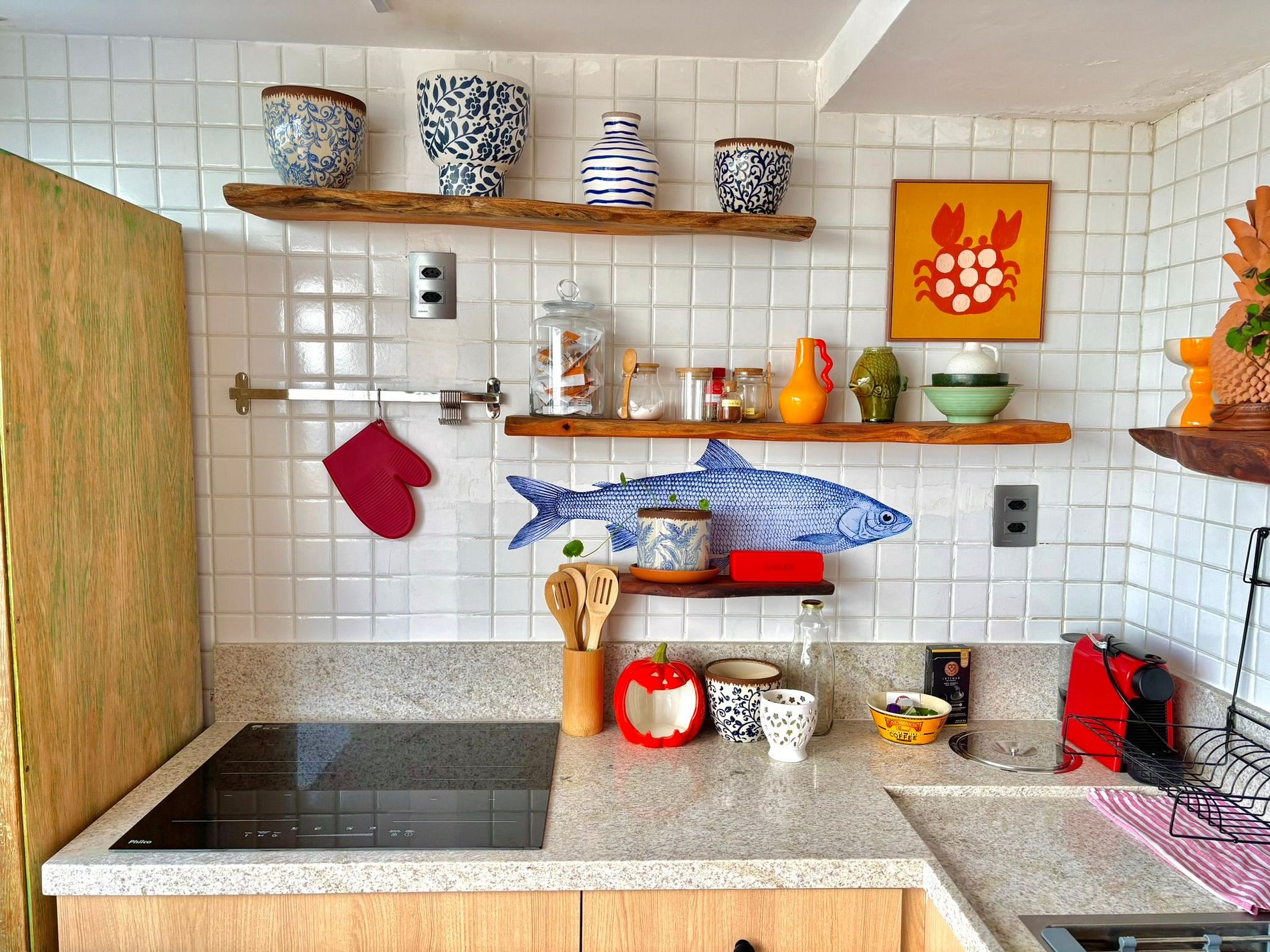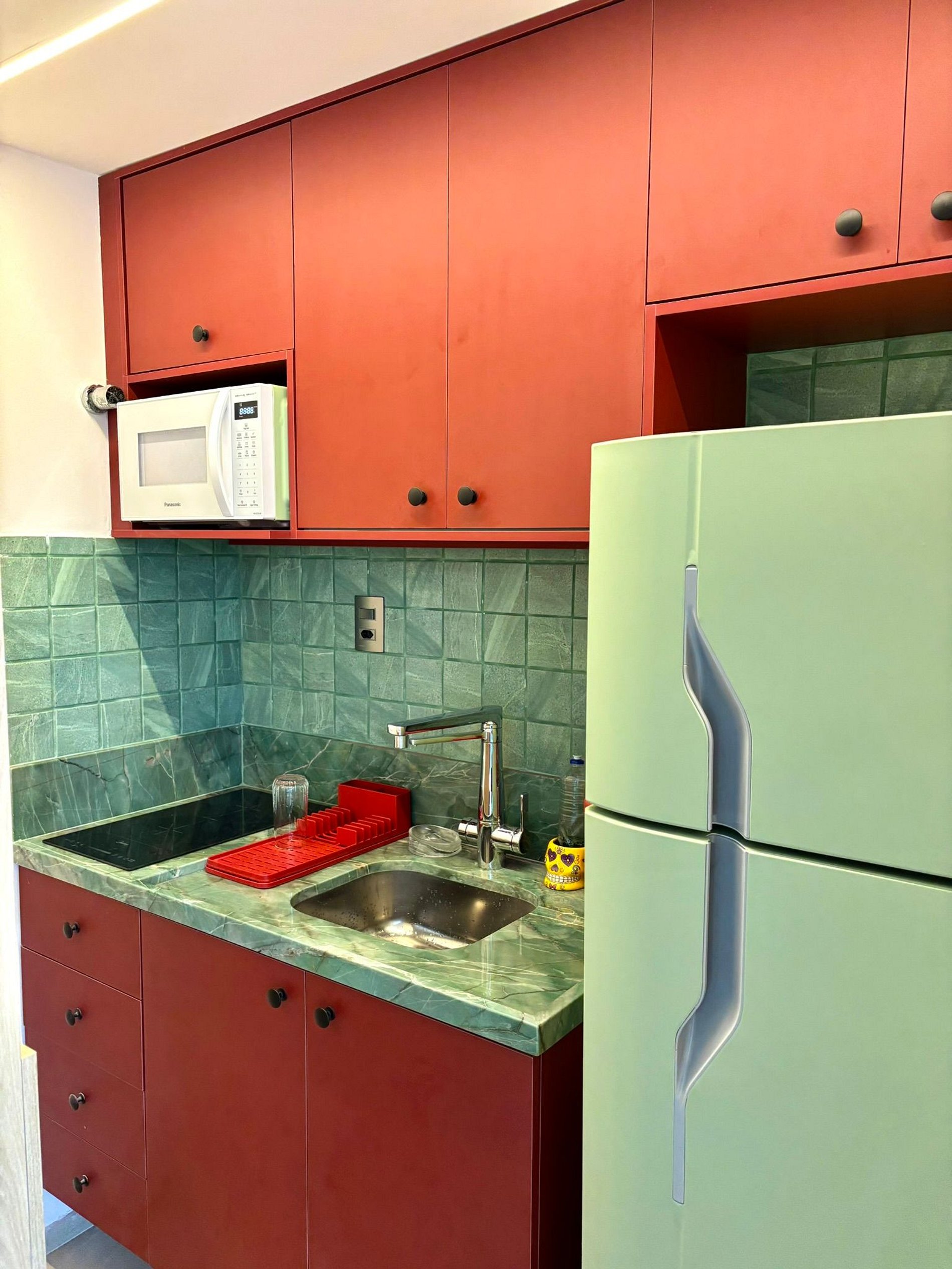 • Geladeira, fogão por indução 4 bocas, cafeteira, liquidificador, sanduicheira, panelas, utensílios e louças.