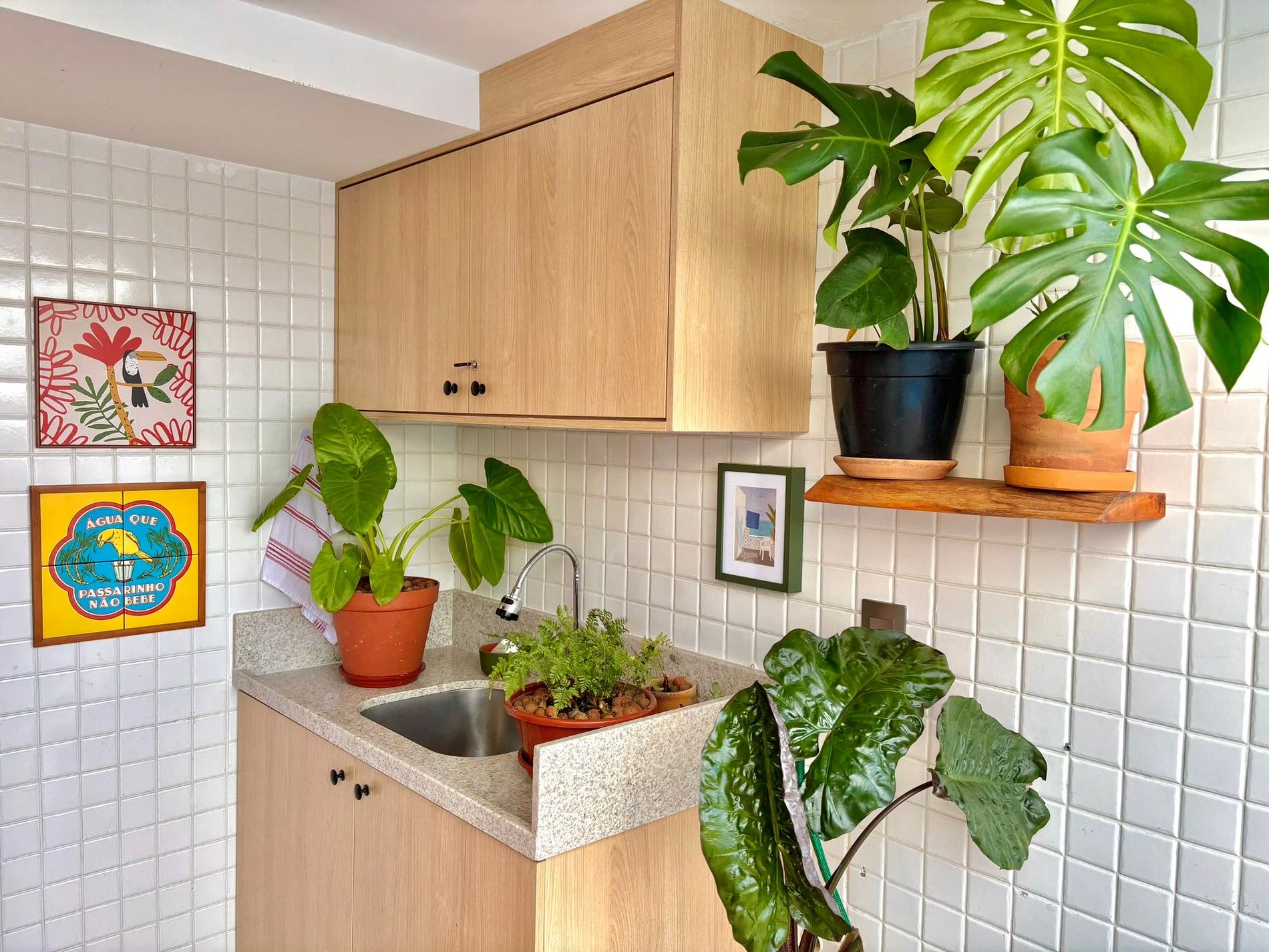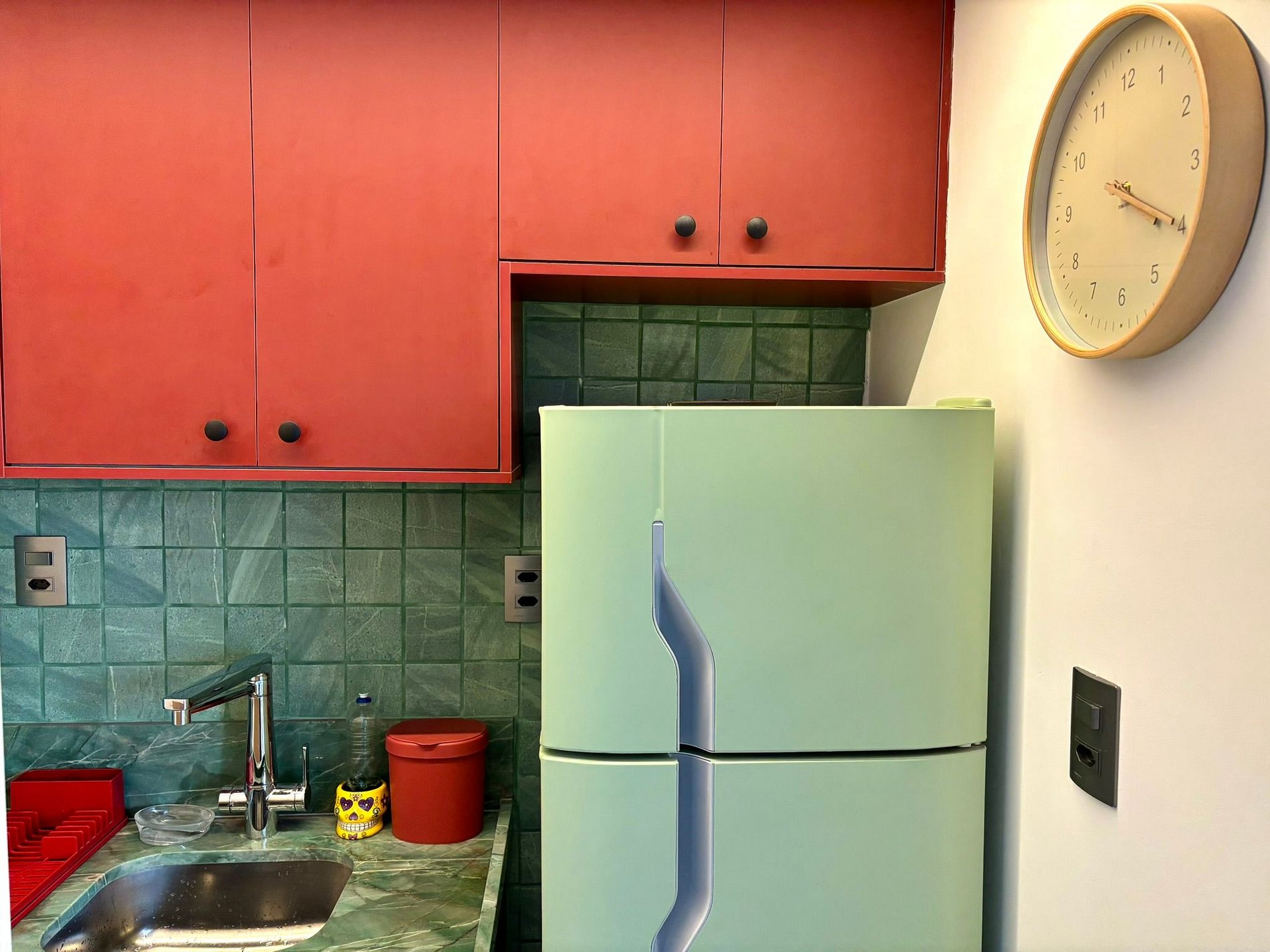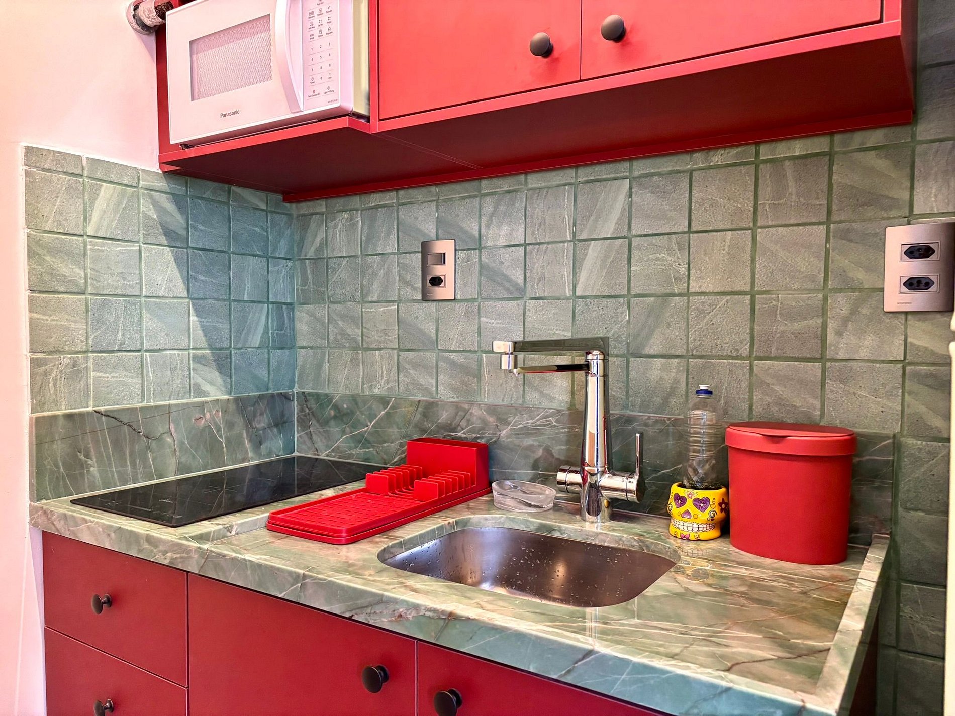 • Geladeira, fogão por indução 4 bocas, cafeteira, liquidificador, sanduicheira, panelas, utensílios e louças.