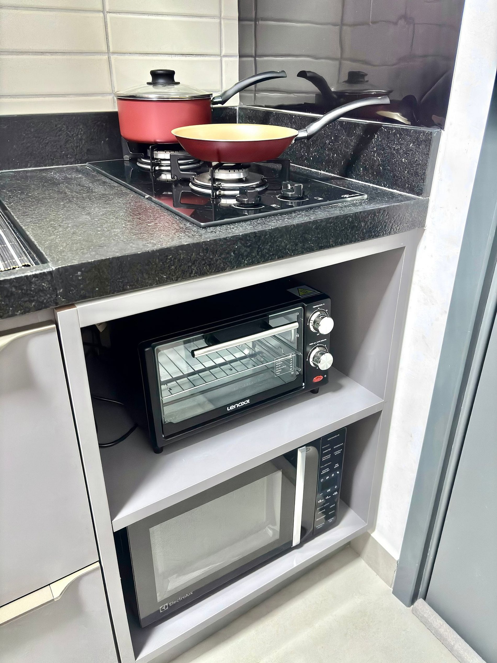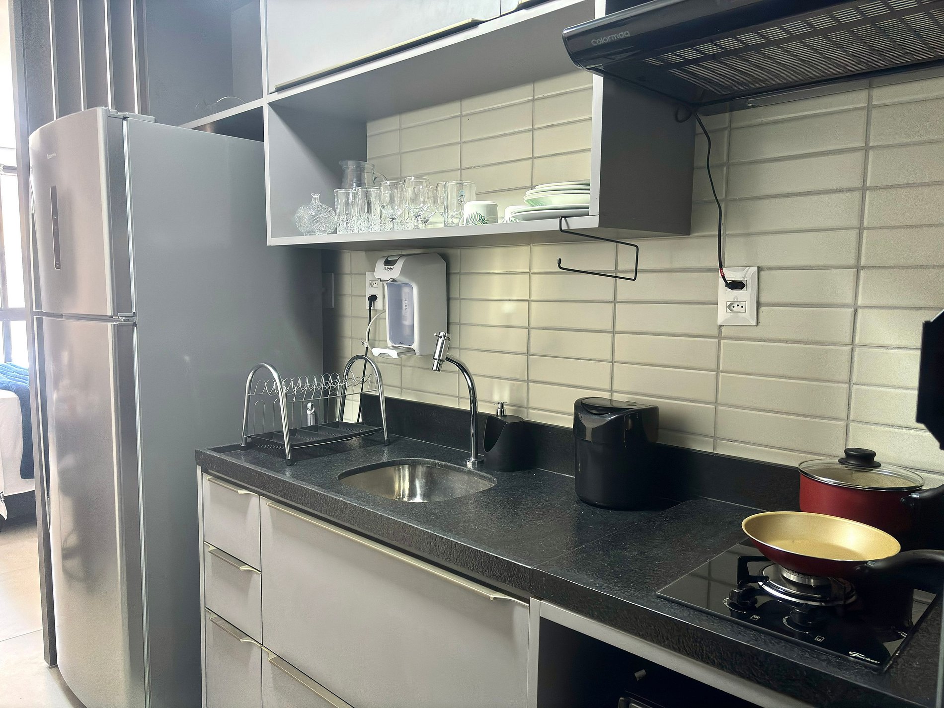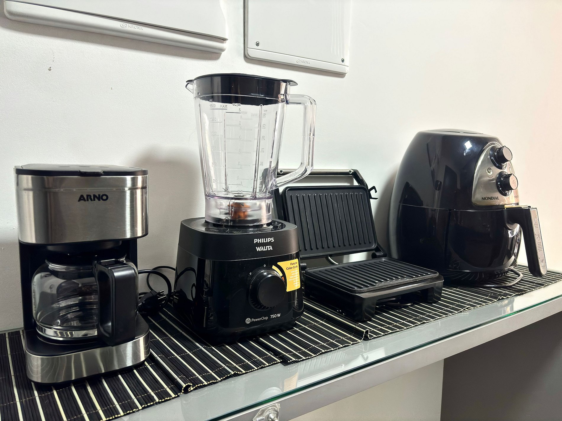 • Geladeira, micro-ondas, fogão a gás, liquidificador, cafeteira, sanduicheira, panelas, utensílios e louças.