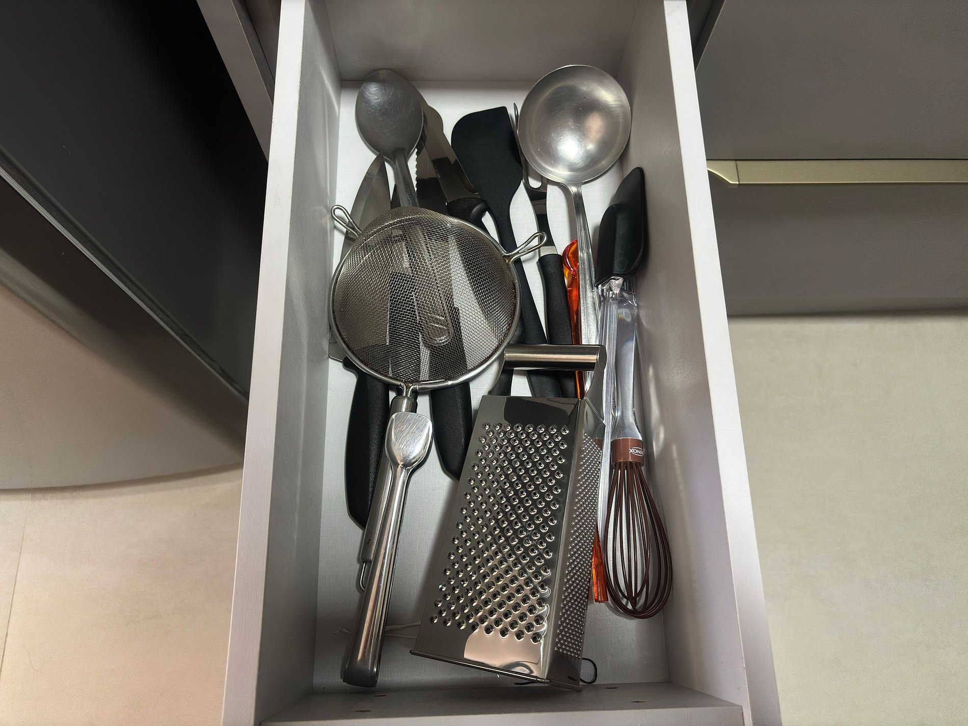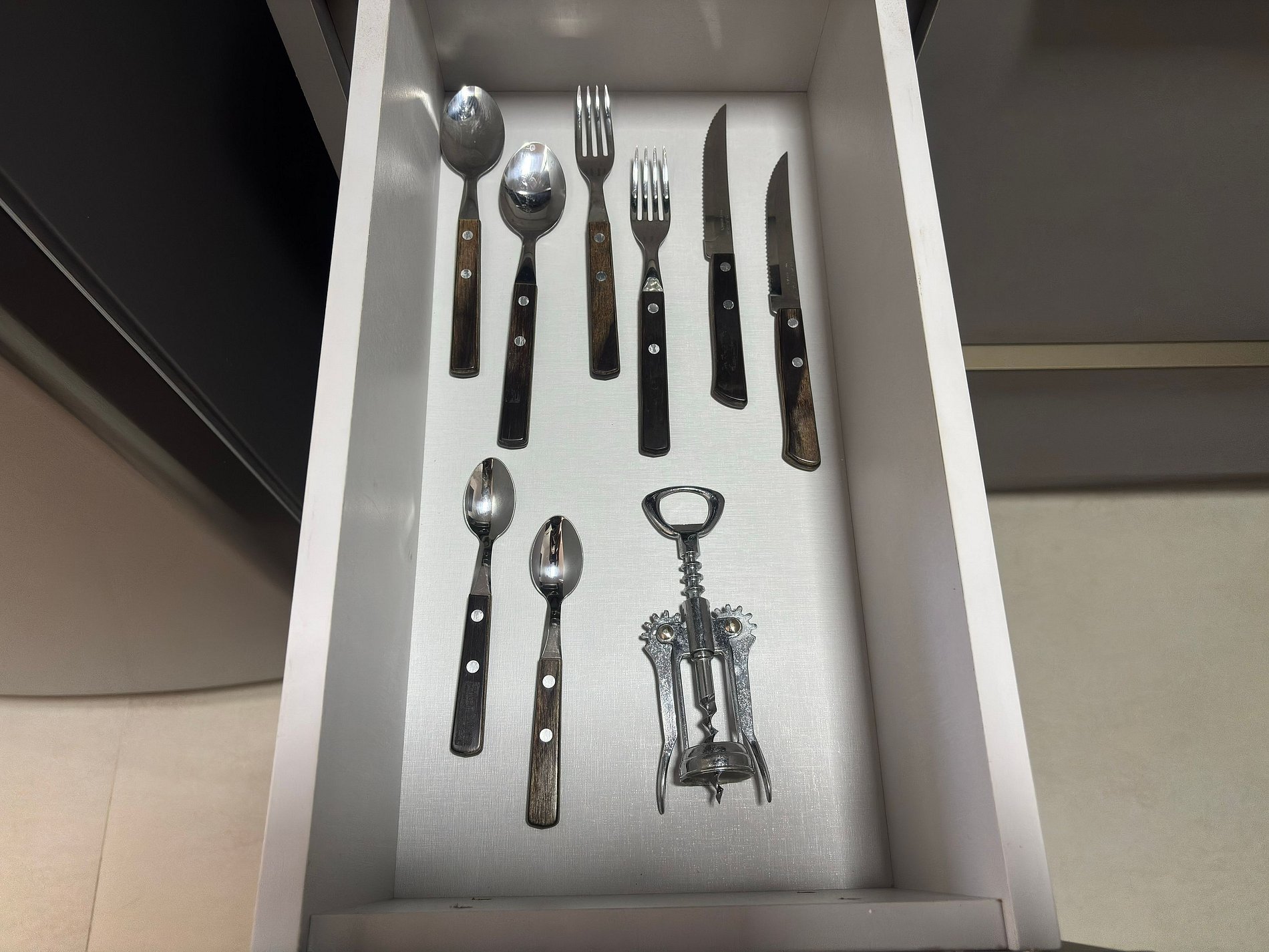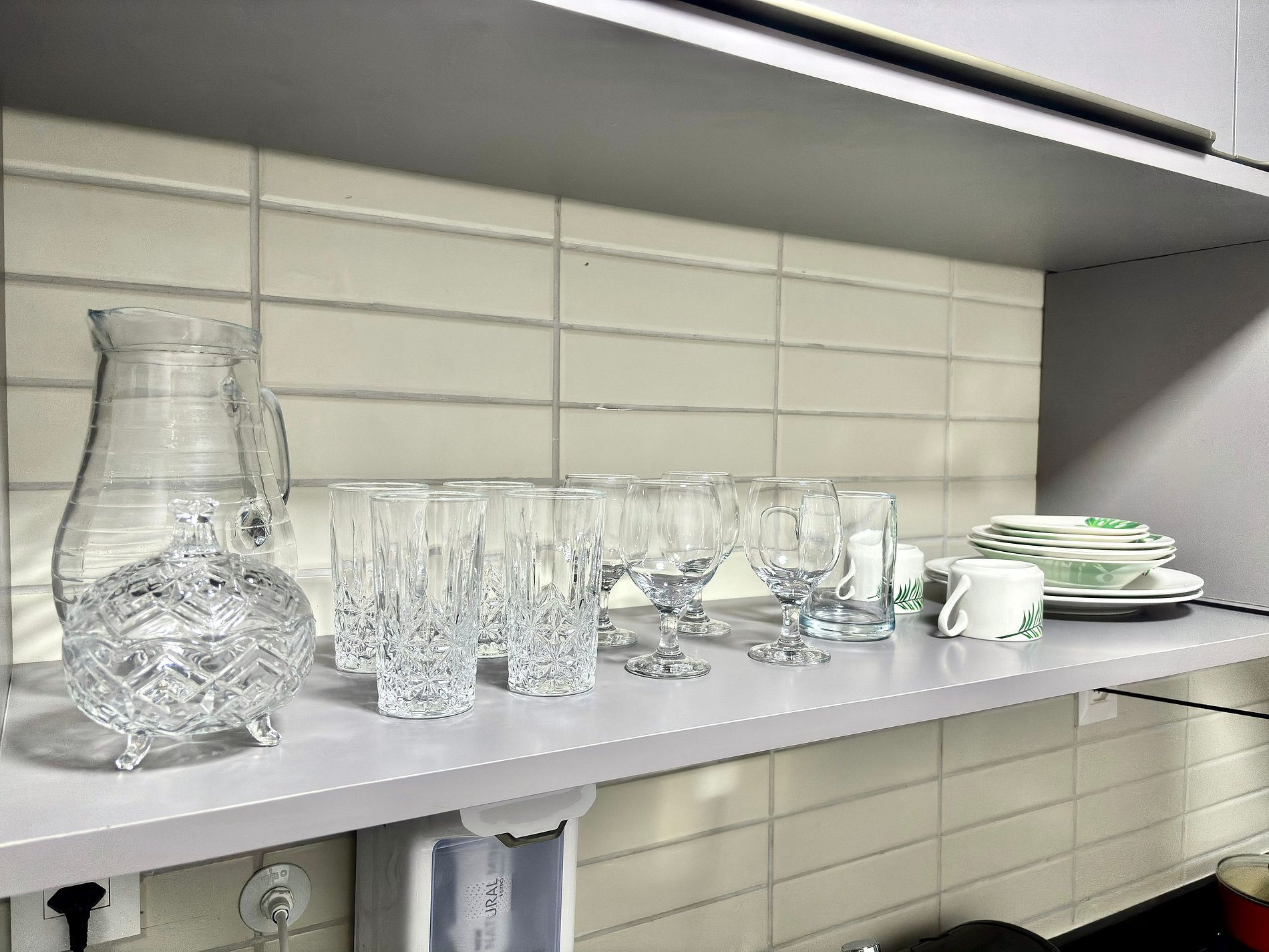 • Geladeira, micro-ondas, fogão a gás, liquidificador, cafeteira, sanduicheira, panelas, utensílios e louças.