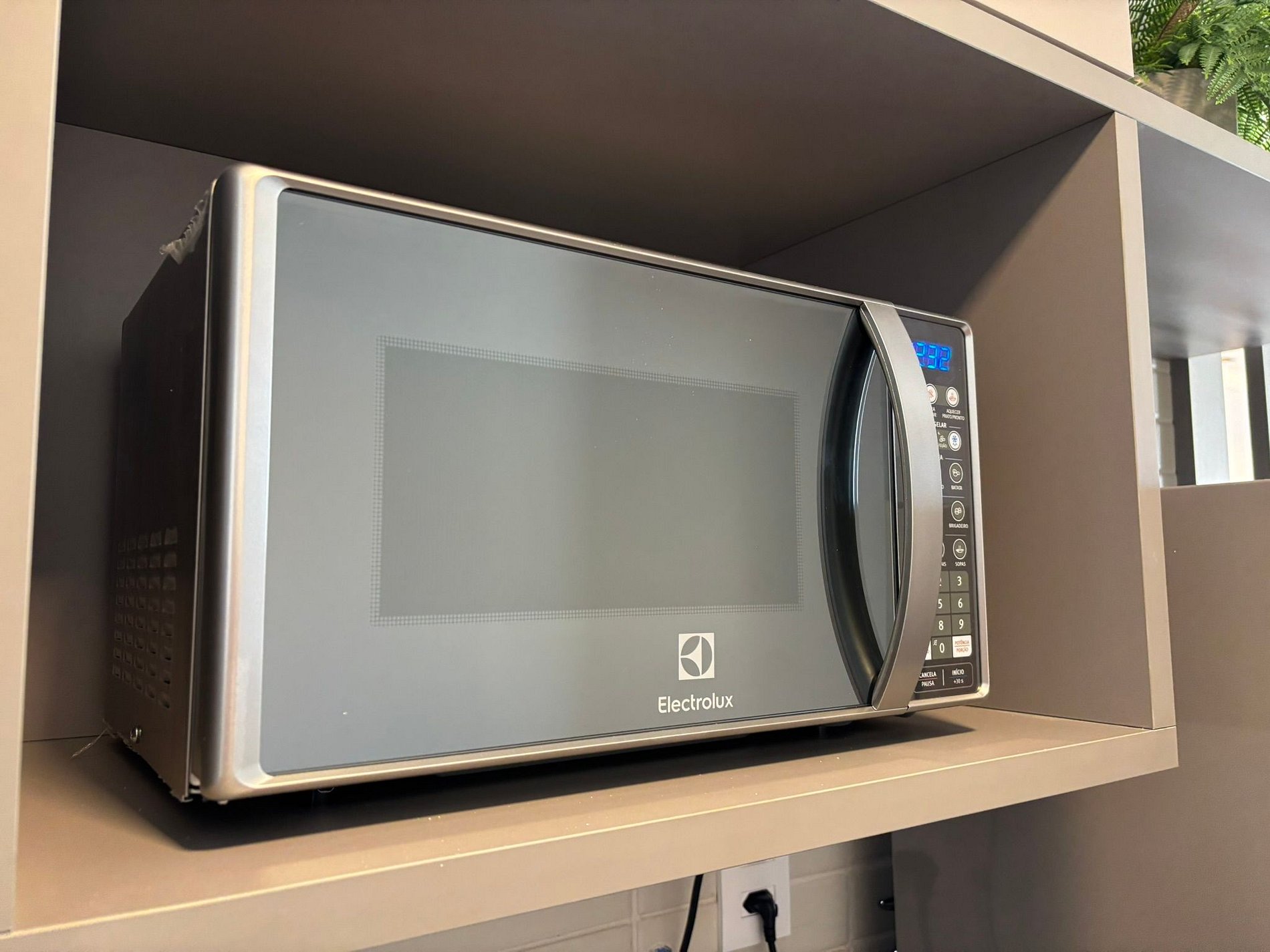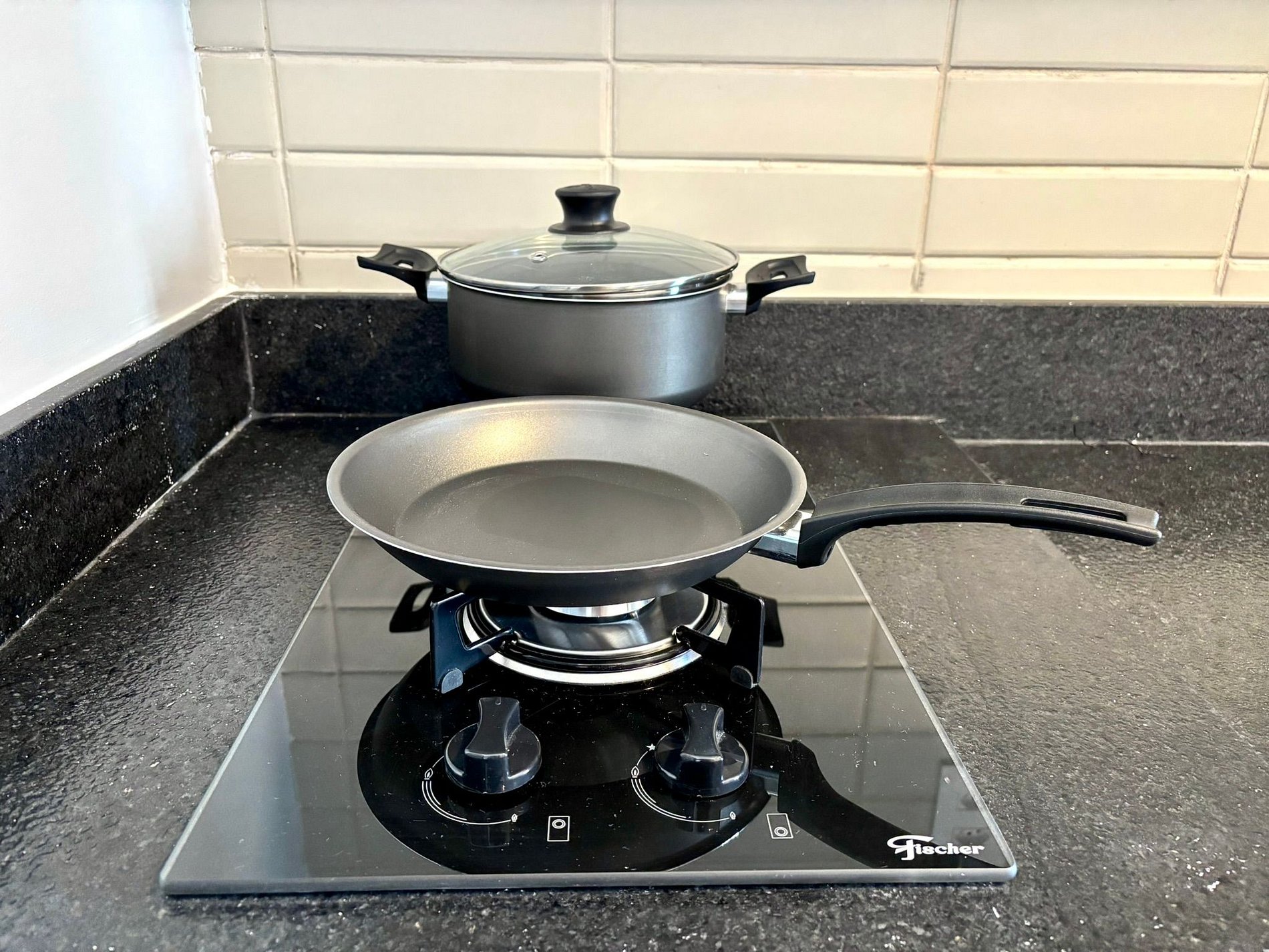 • Geladeira, micro-ondas, fogão a gás, liquidificador, cafeteira, sanduicheira, panelas, utensílios e louças.