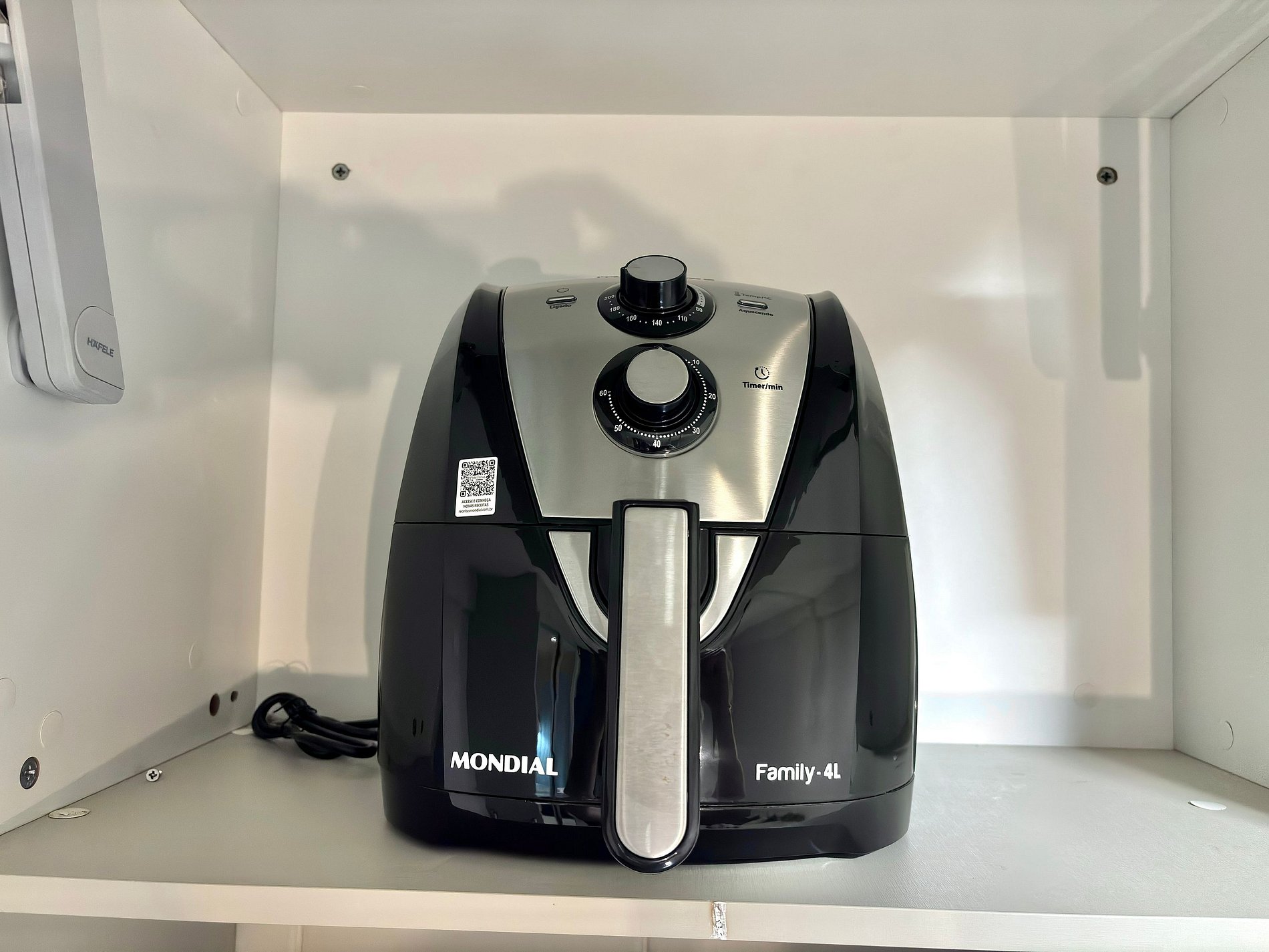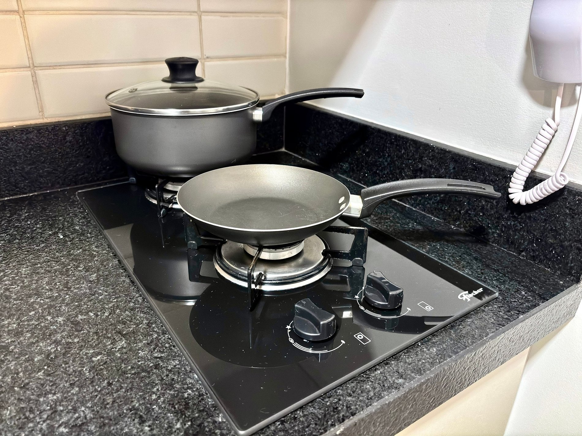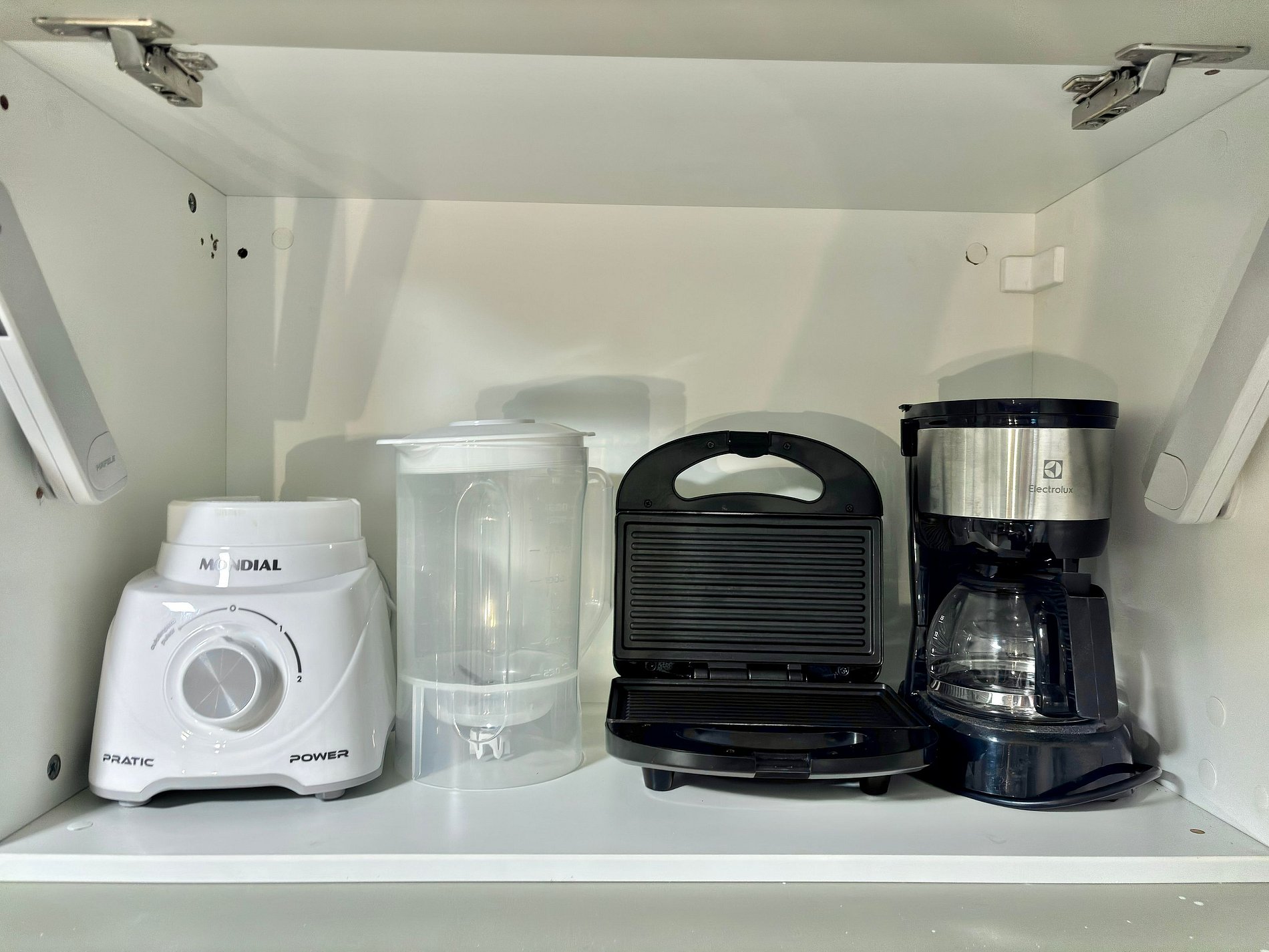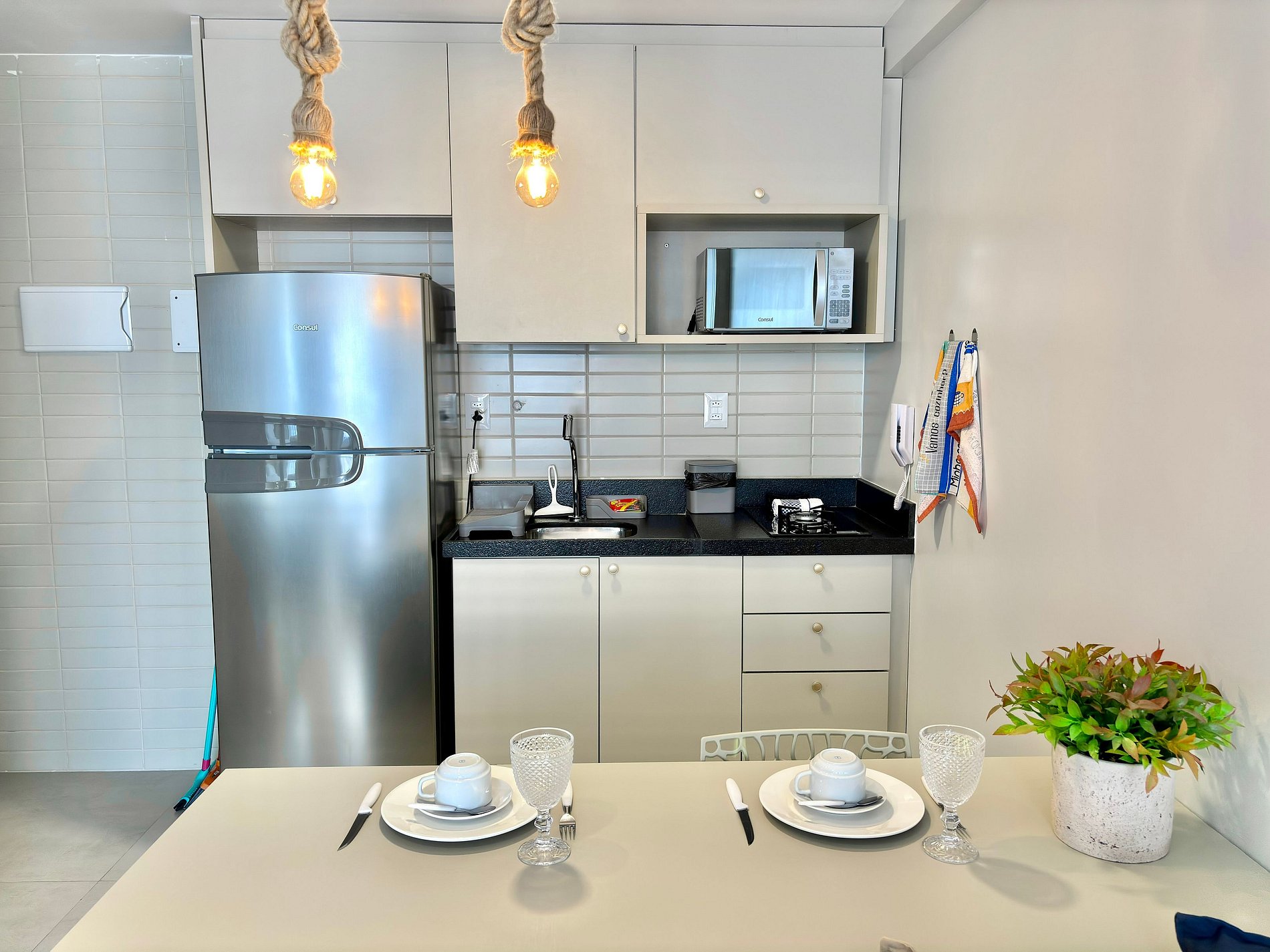 • Geladeira, micro-ondas, fogão a gás, liquidificador, cafeteira, sanduicheira, panelas, utensílios e louças.