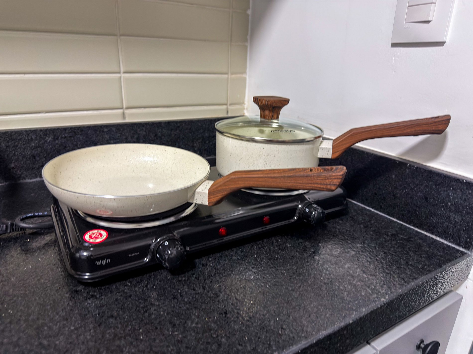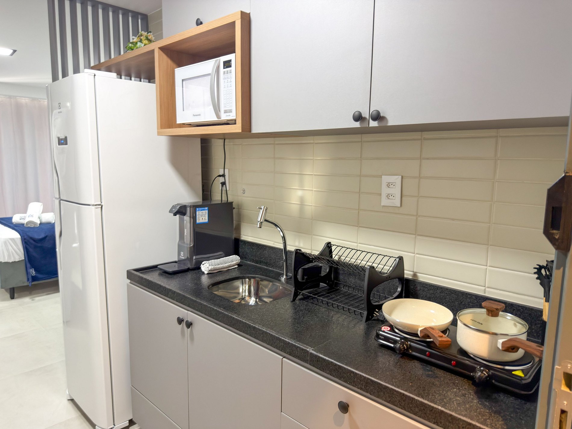 • Geladeira, micro-ondas, fogão portátil, liquidificador, cafeteira, chaleira, sanduicheira, panelas, utensílios e louças.