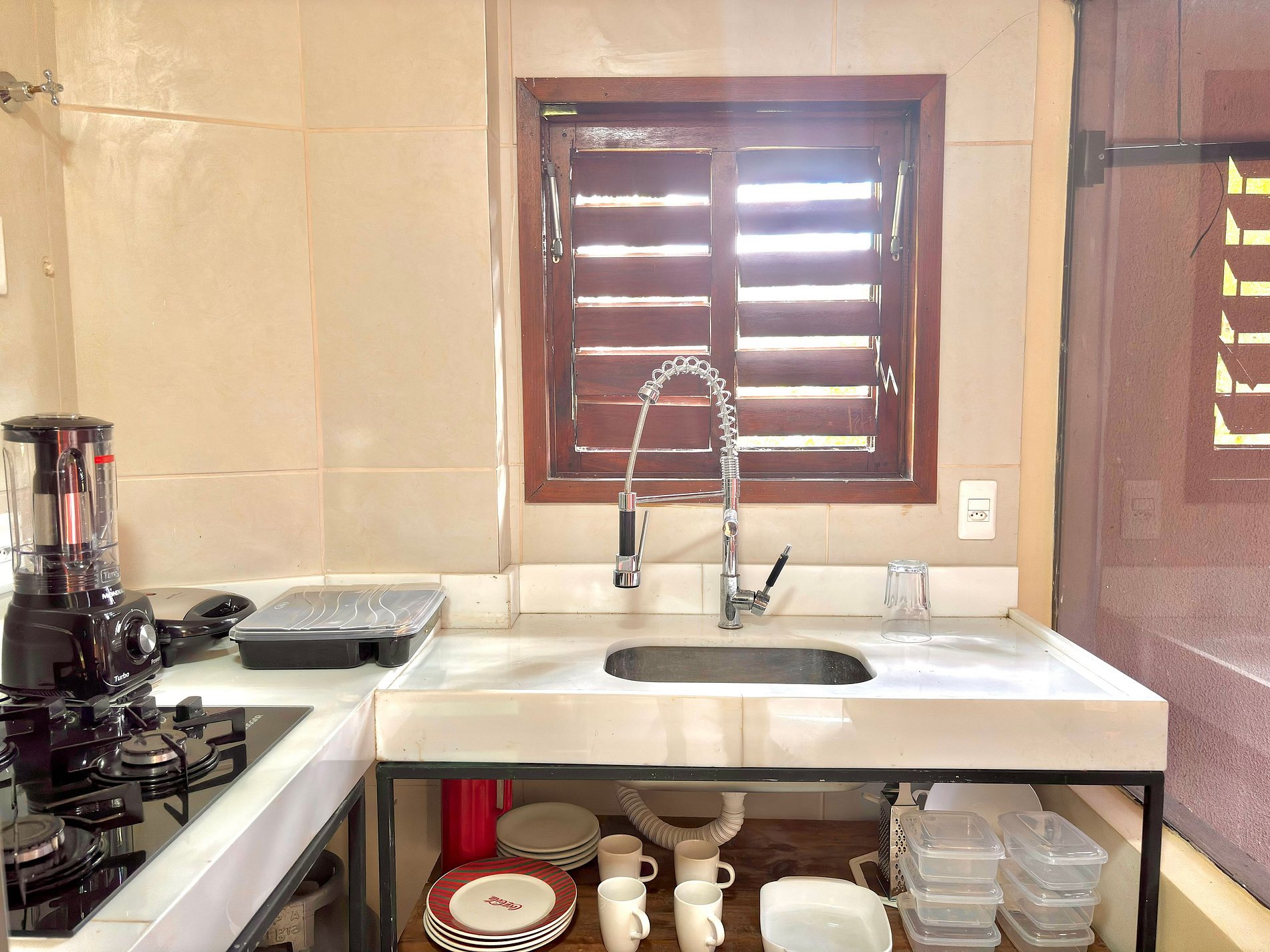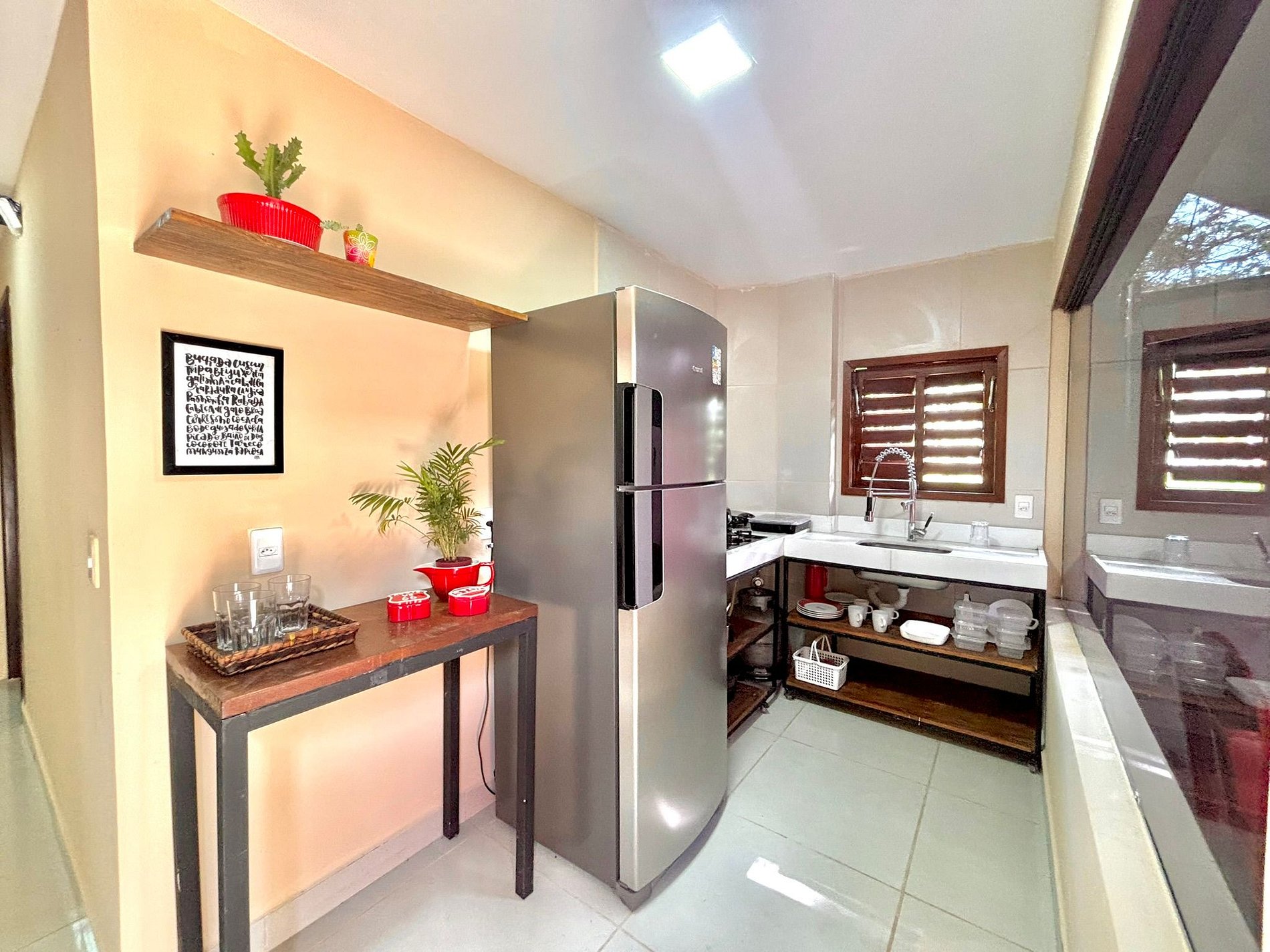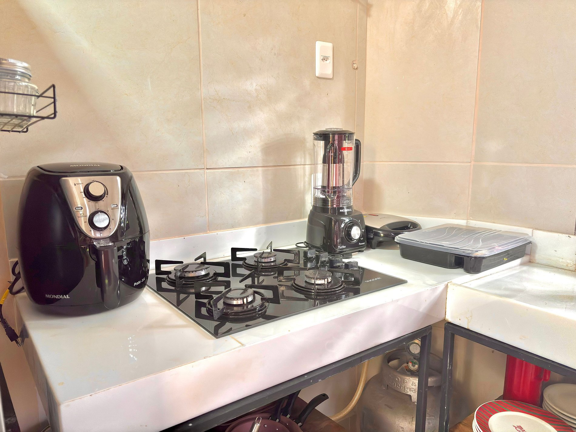 • Geladeira, forno e fogão a gás, airfryer, cafeteira, liquidificador, sanduicheira, panelas, utensílios e louças.