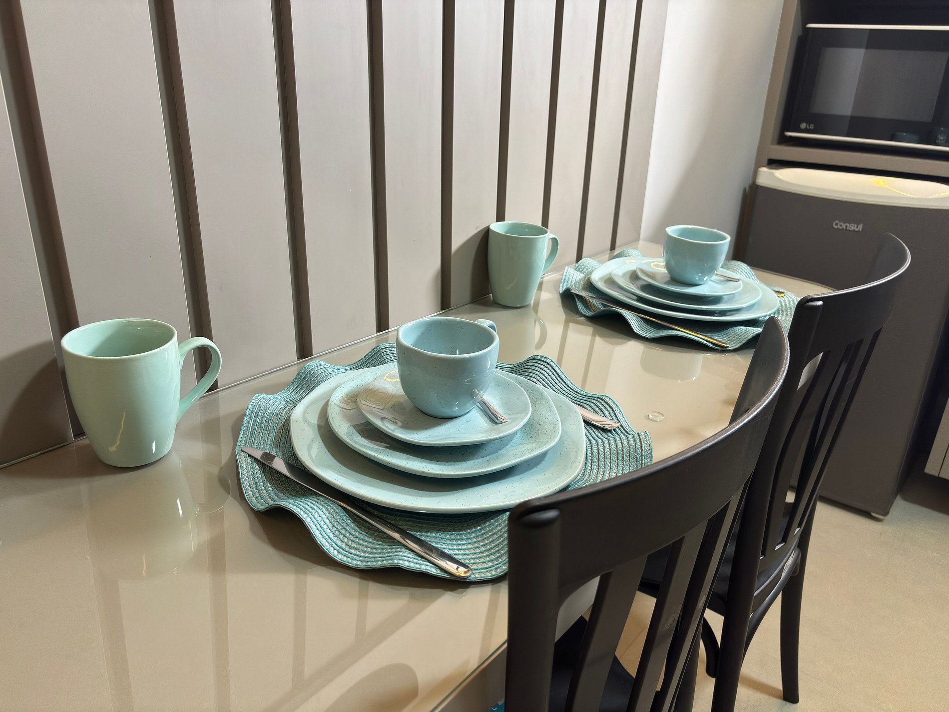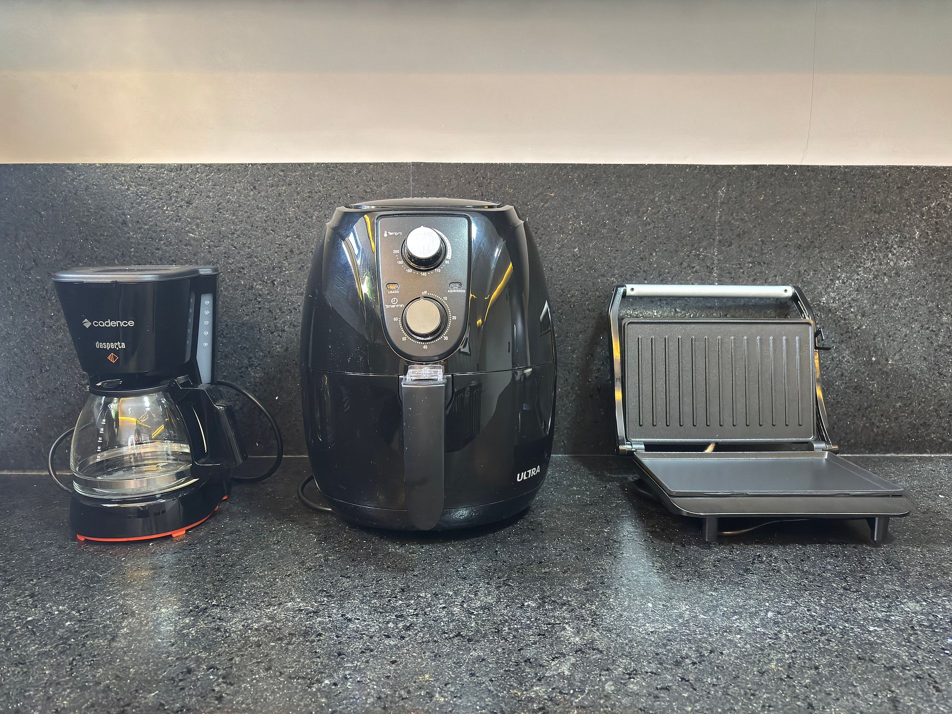 • freezer, micro-ondas, fogão por indução, cafeteira, liquidificador, sanduicheira, panelas, utensílios e louças.