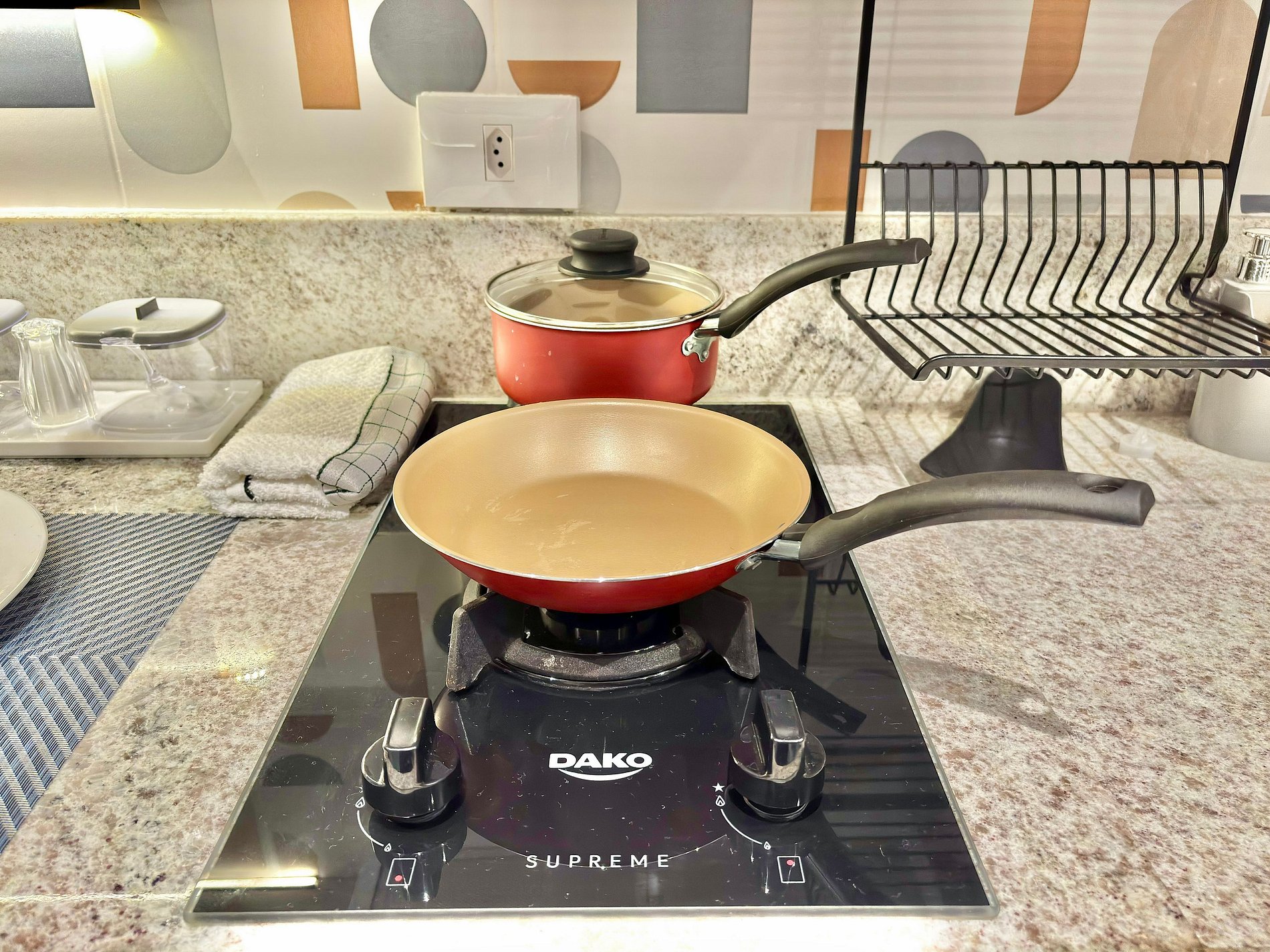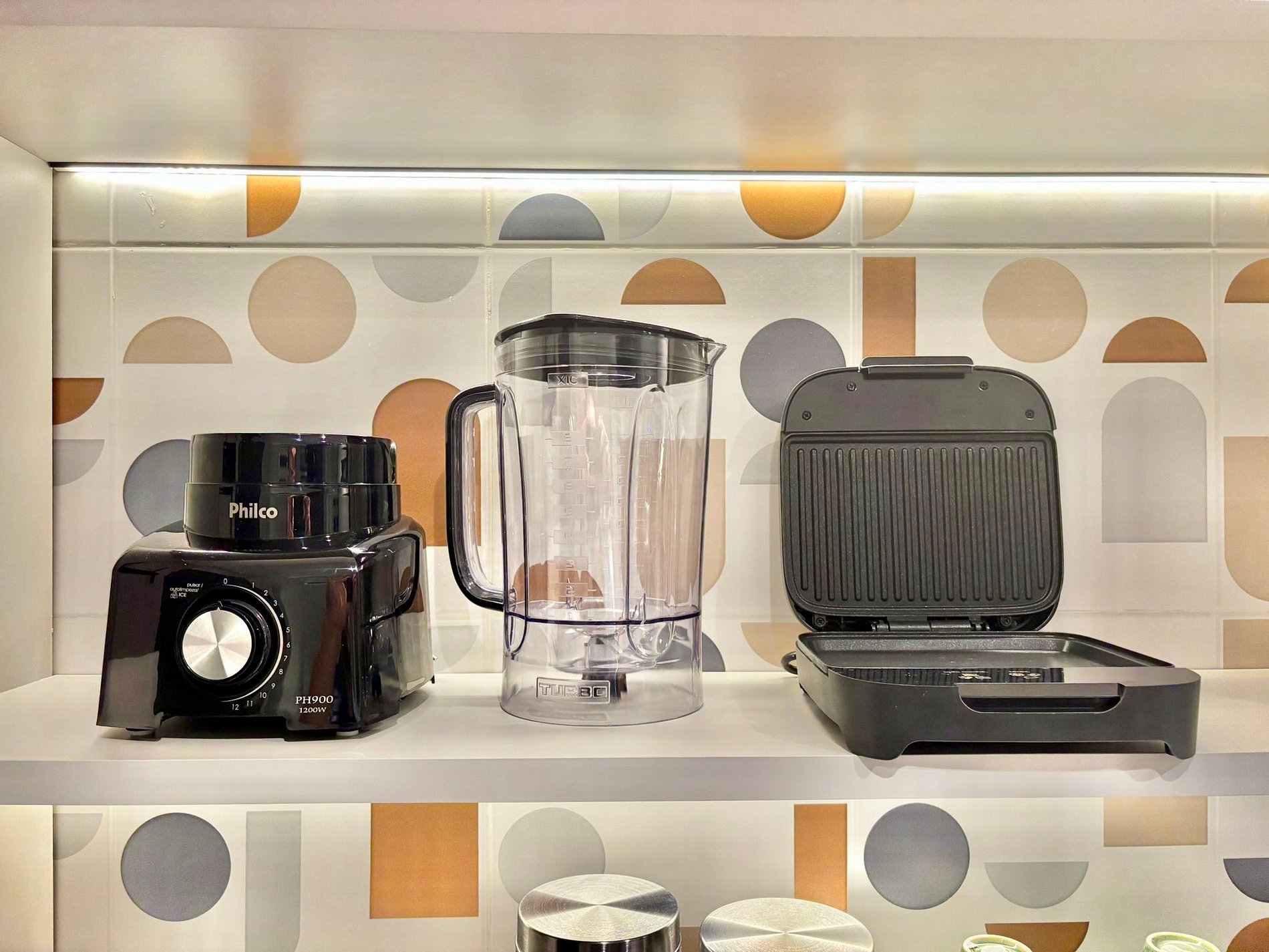 • freezer, micro-ondas, fogão a gás, liquidificador, sanduicheira, panelas, utensílios e louças.