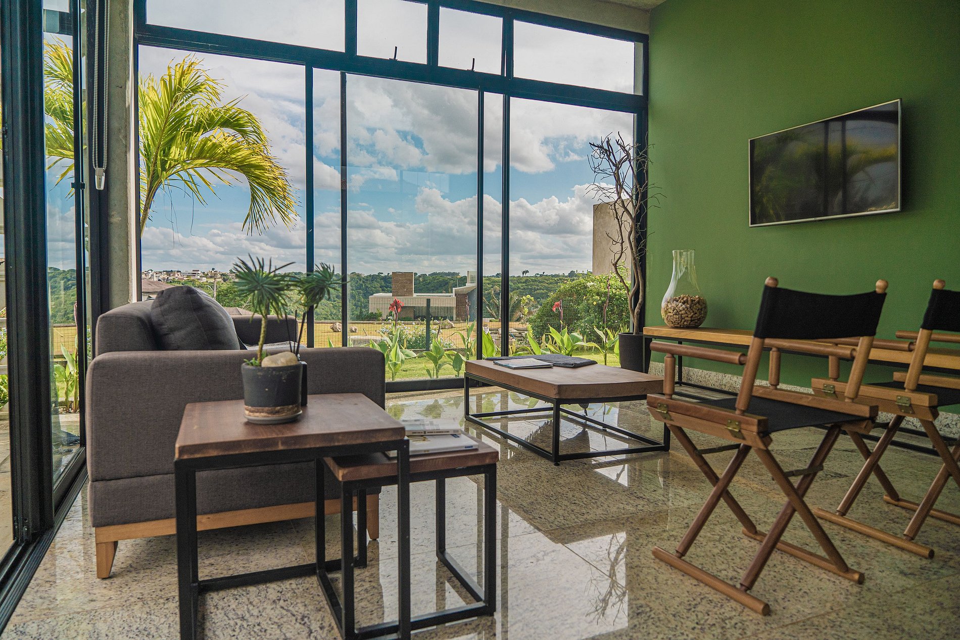 • Salas espaçosas com portas de vidro, vista para o vale e smart TV.