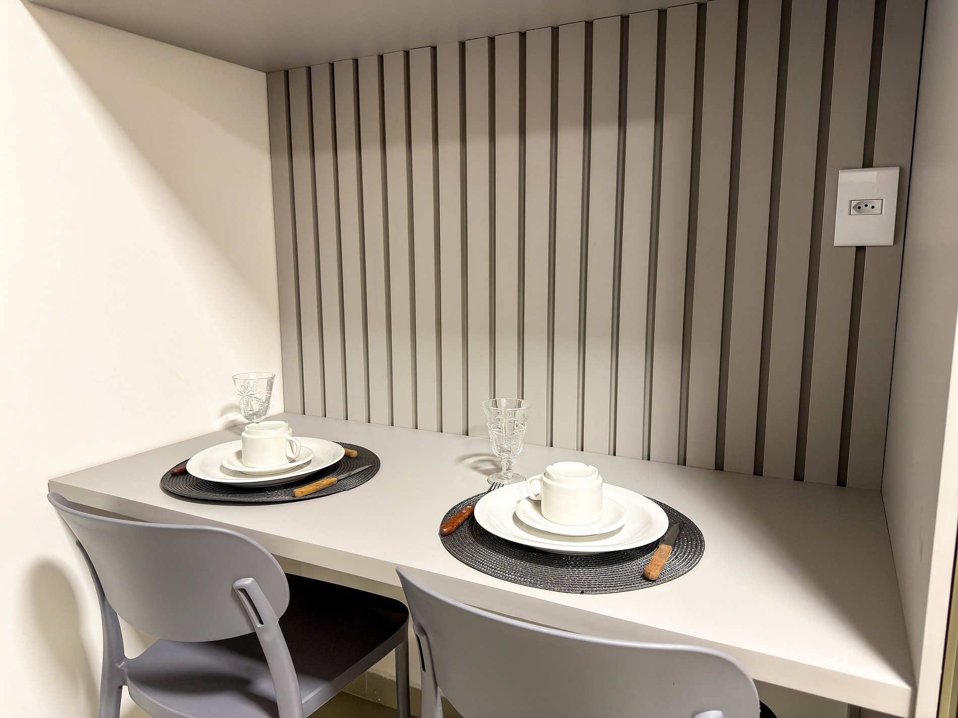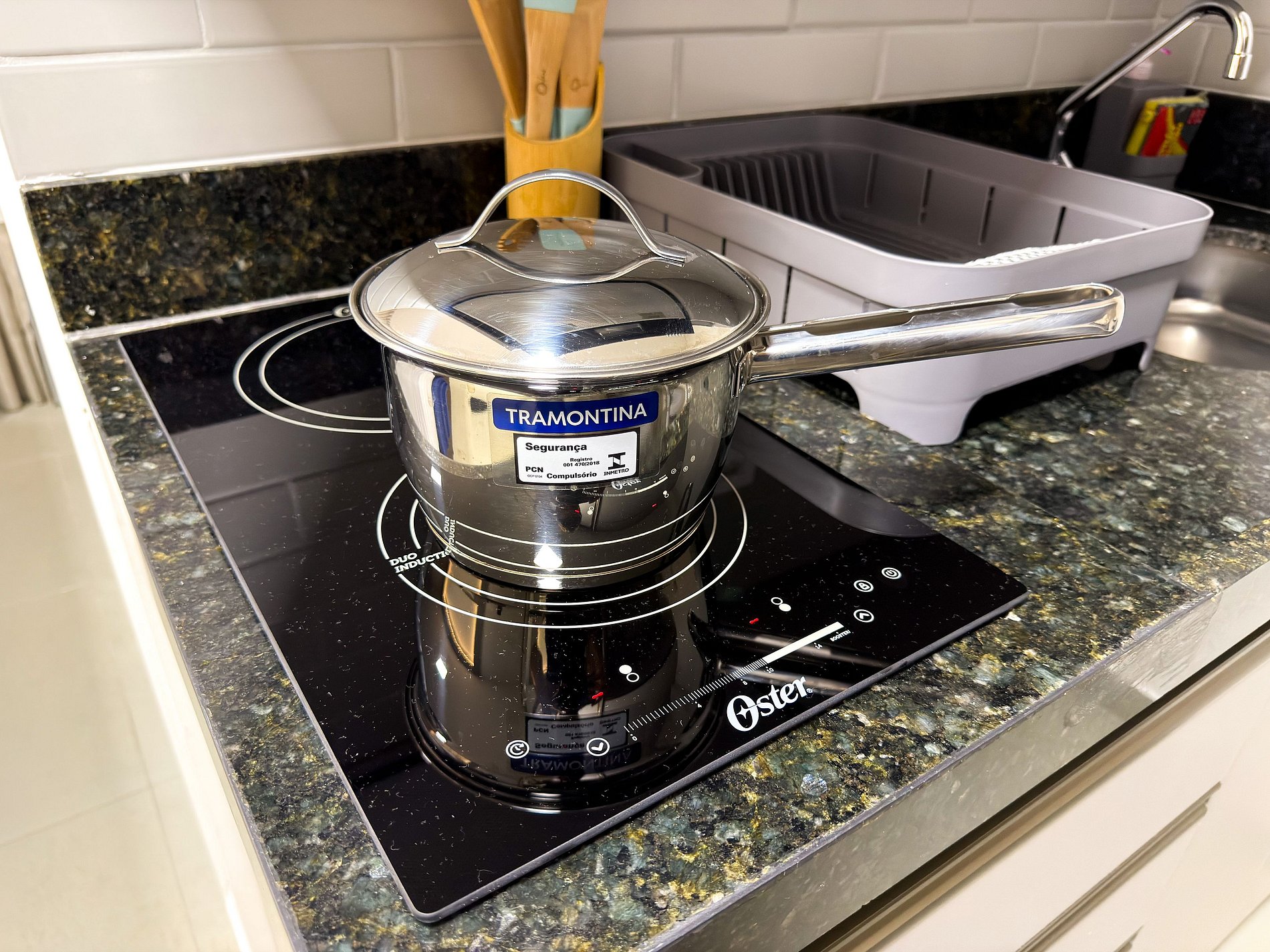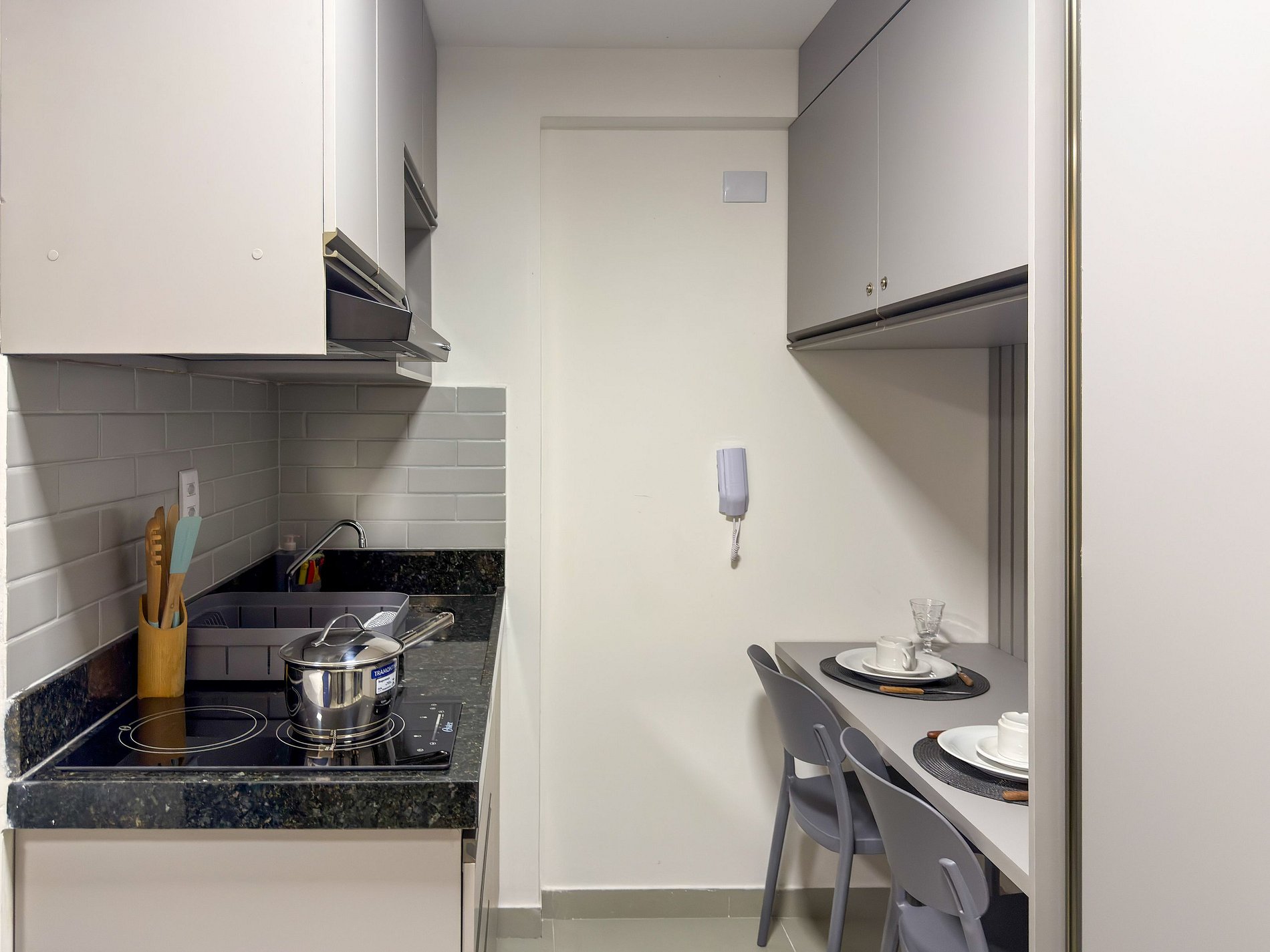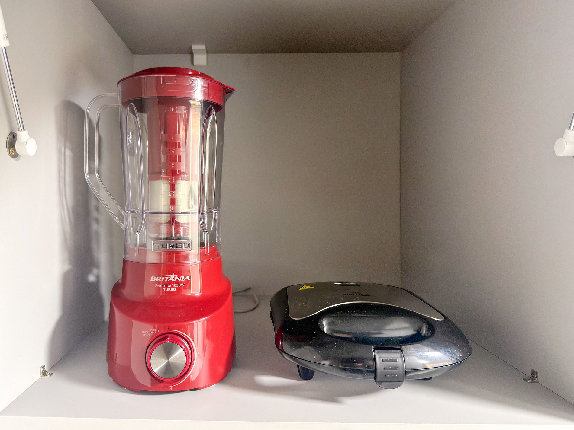 • frigobar, micro-ondas, fogão por indução, liquidificador, sanduicheira, panelas, utensílios e louças.