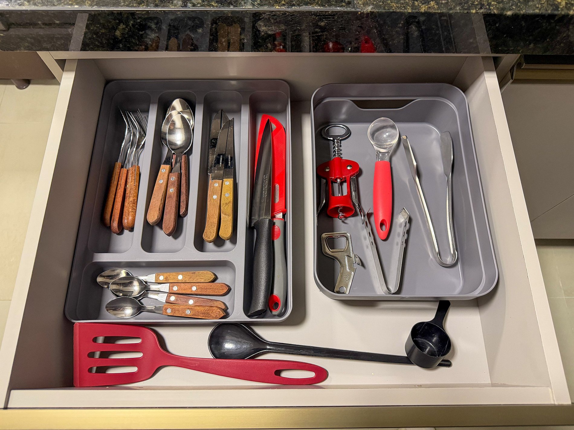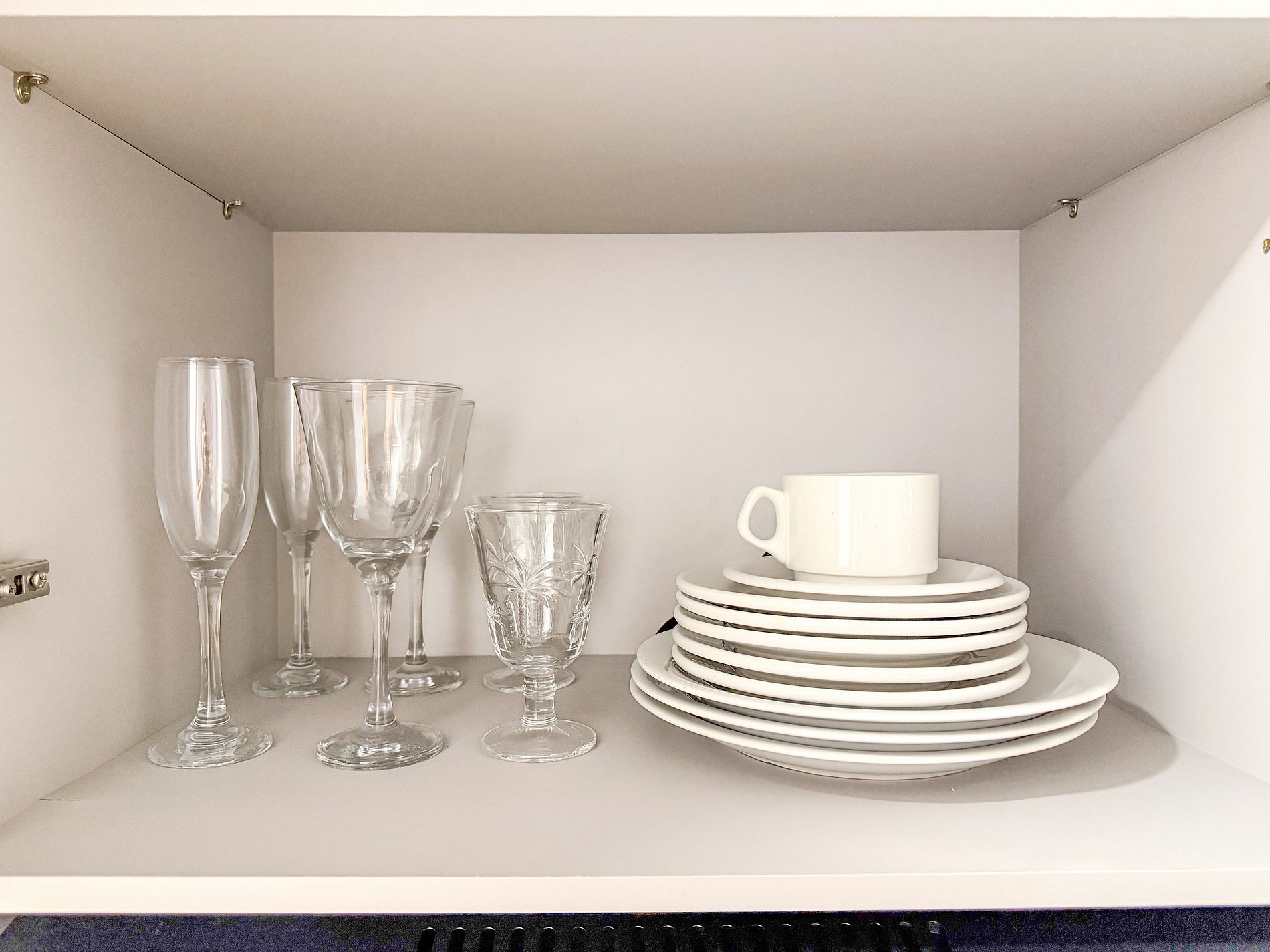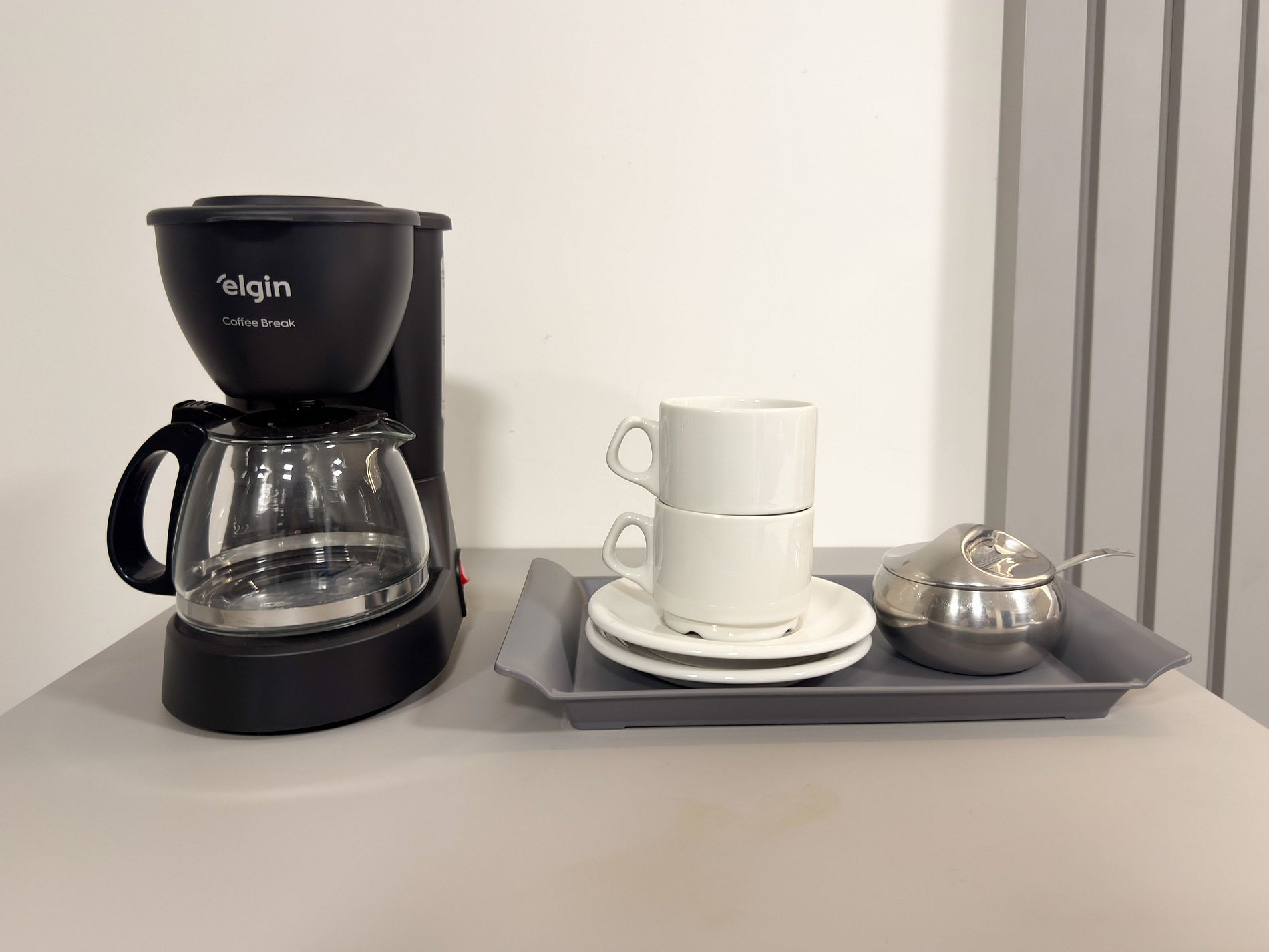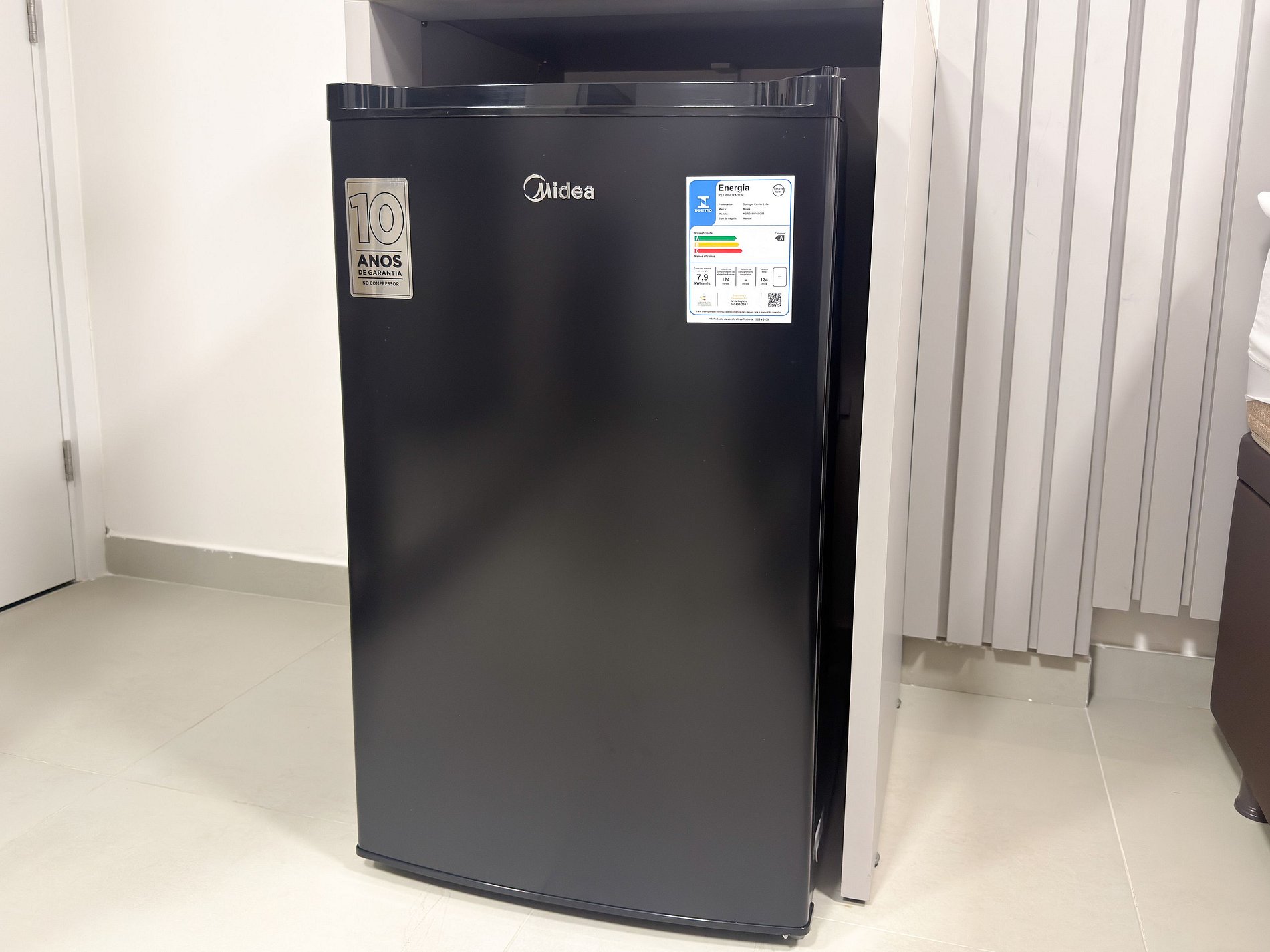 • frigobar, micro-ondas, fogão por indução, liquidificador, sanduicheira, panelas, utensílios e louças.
