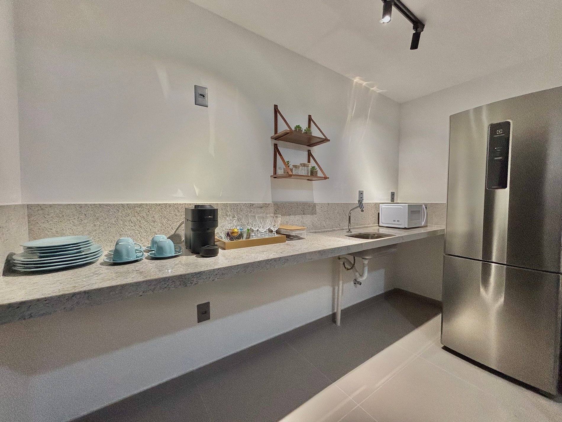 • Cozinha compacta com geladeira, micro-ondas, panelas, utensílios e louças.
