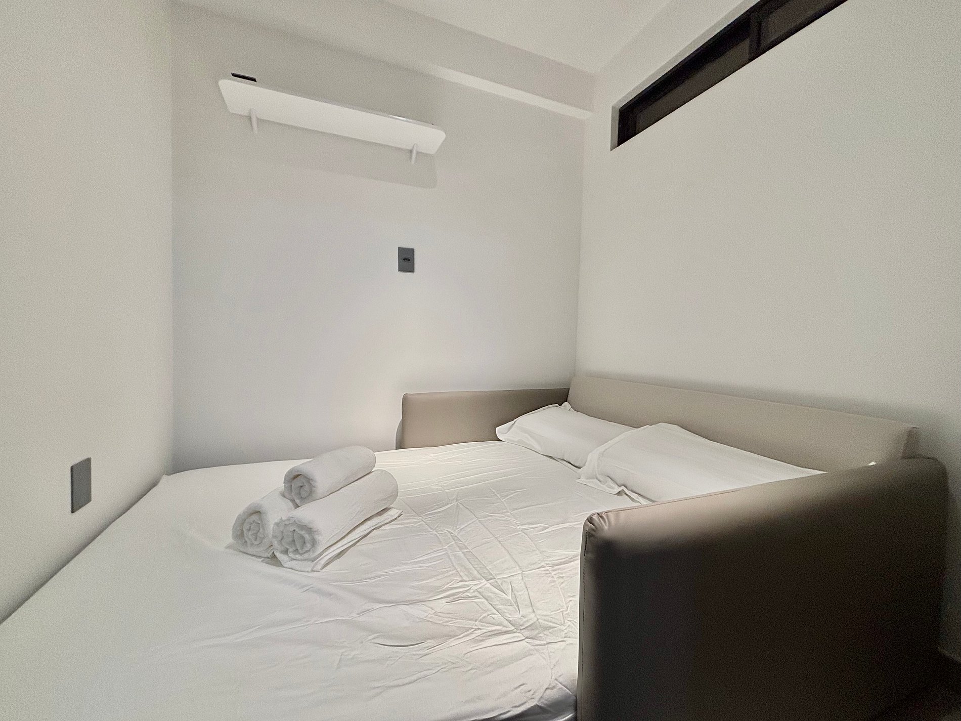 O flat acomoda até 4 pessoas, com 1 cama queen e um sofá-cama casal.