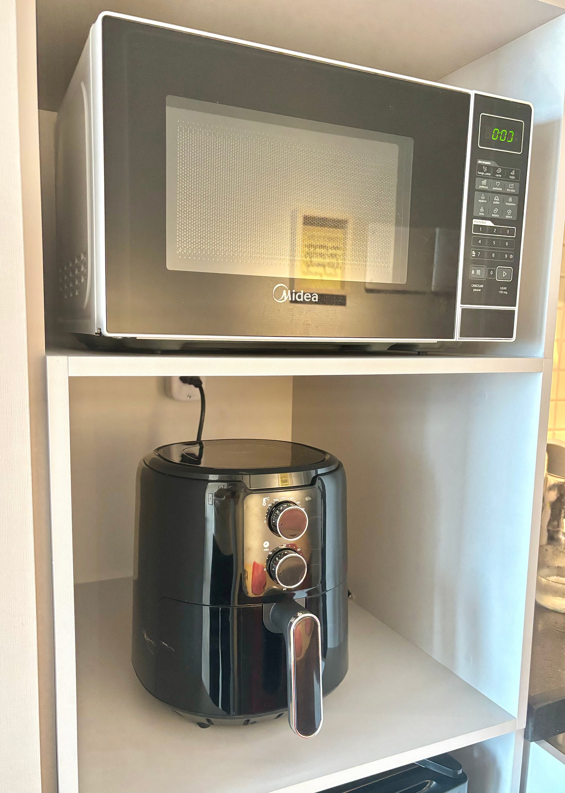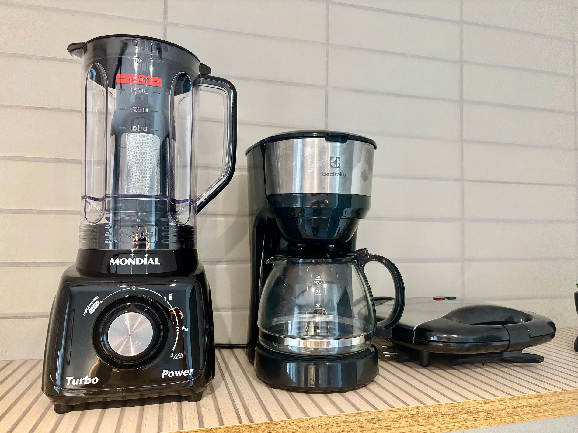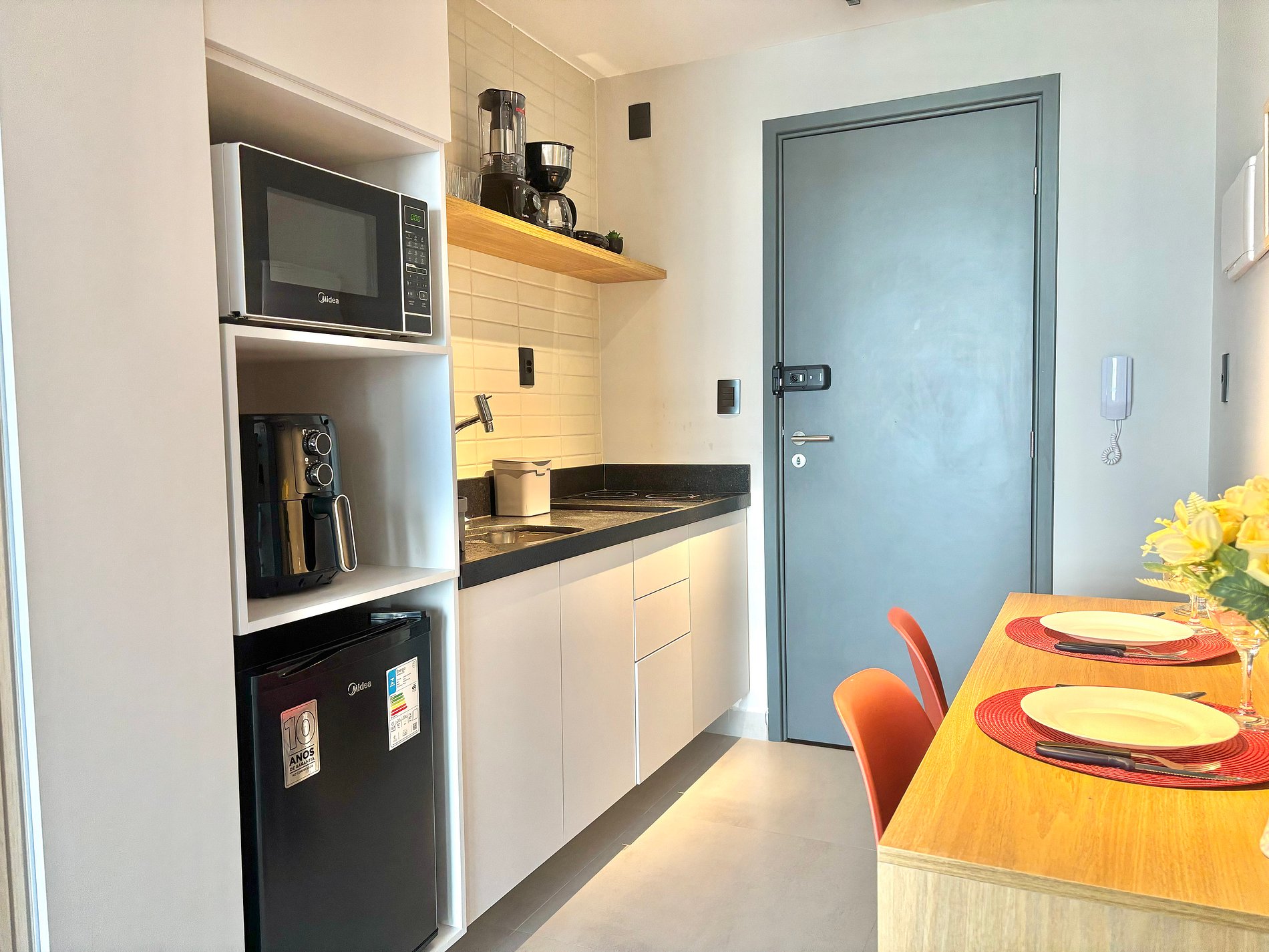 • Cozinha compacta equipada: frigobar, fogão elétrico, liquidificador, sanduicheira, cafeteira, utensílios e louças.