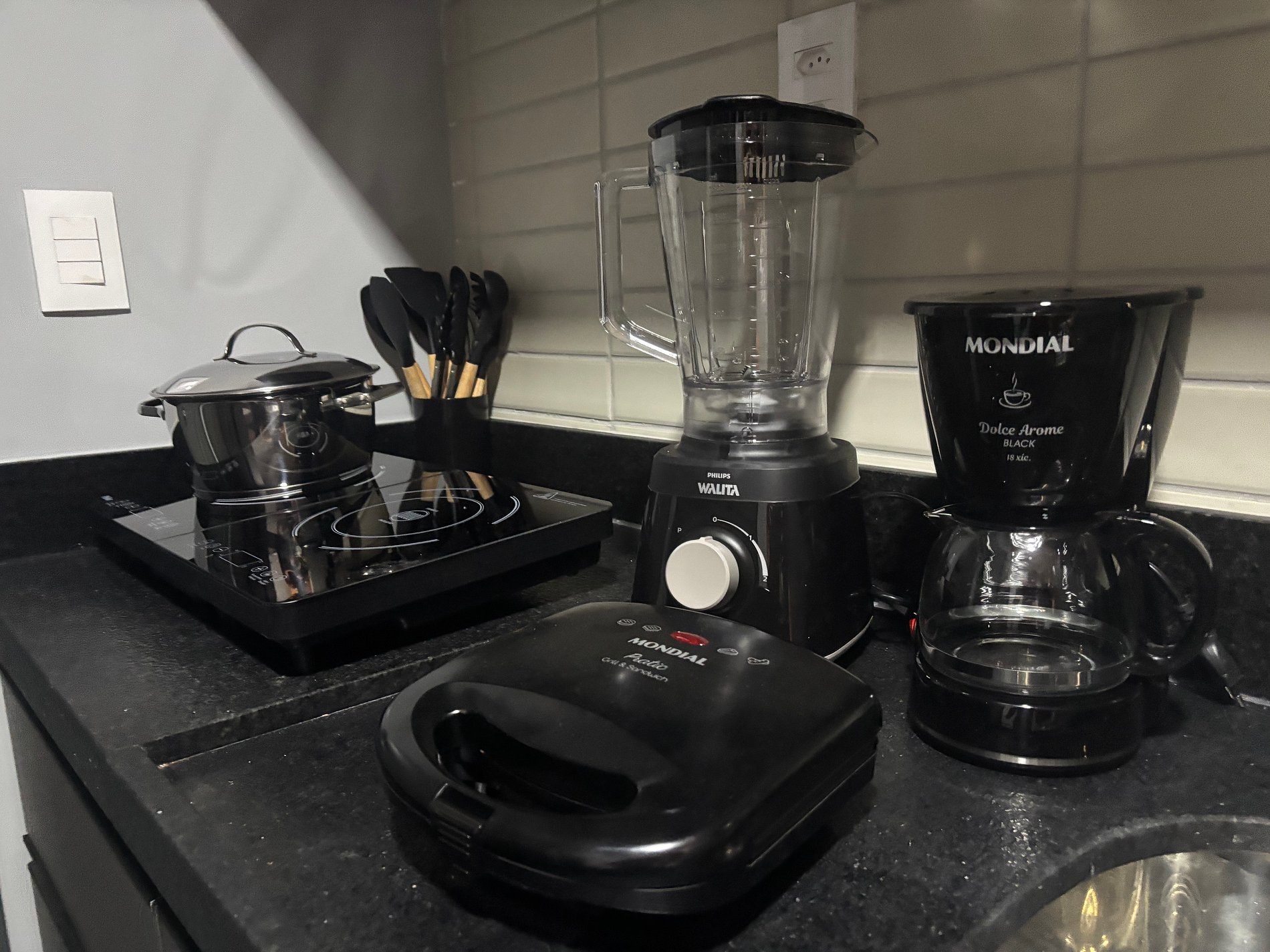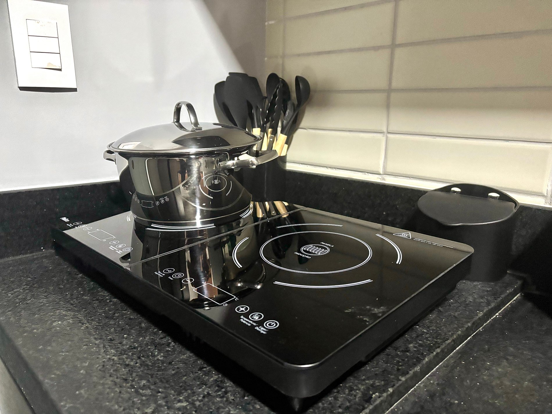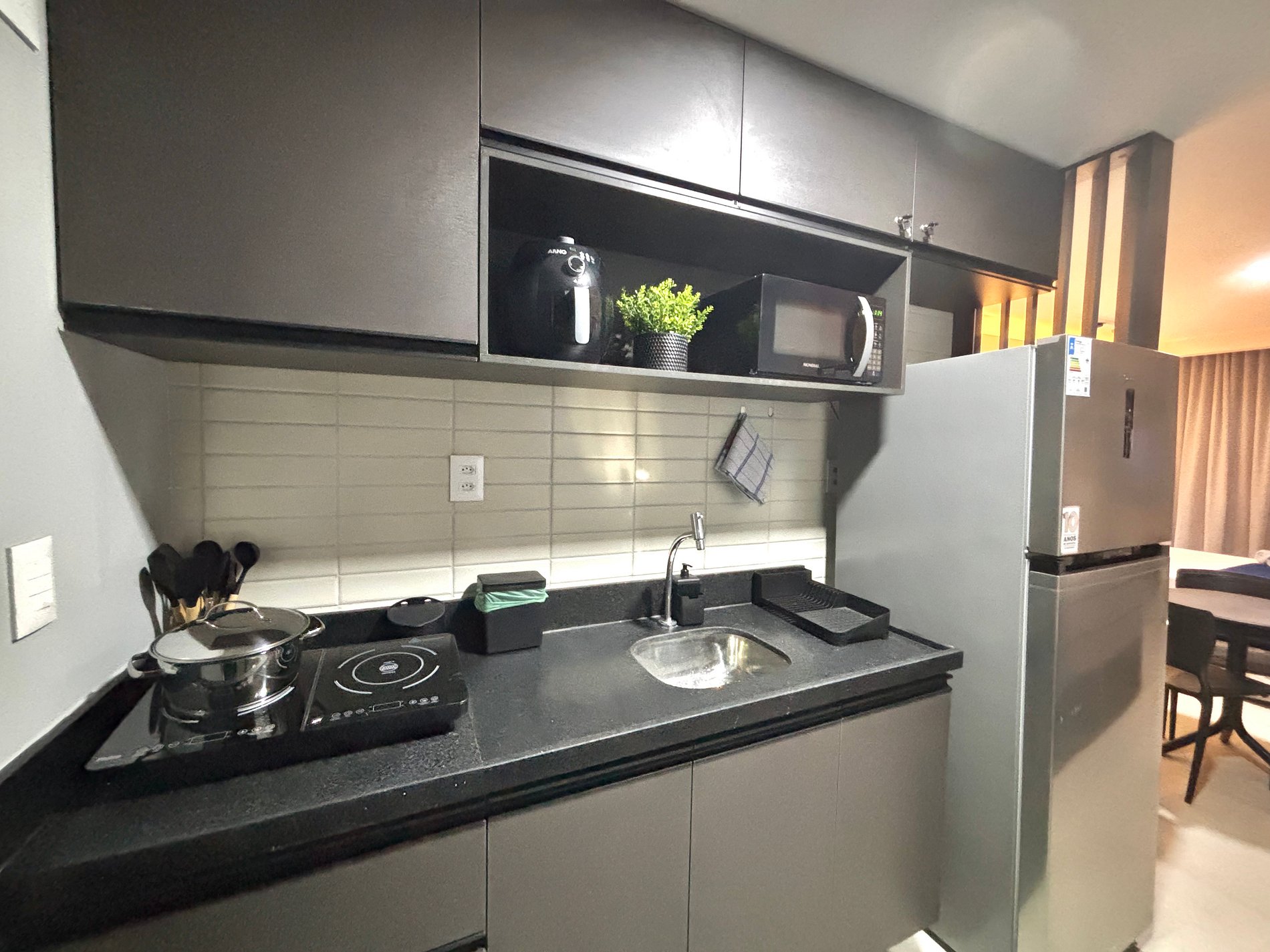 • Cozinha compacta equipada: frigobar, fogão de indução portátil, utensílios e louças.