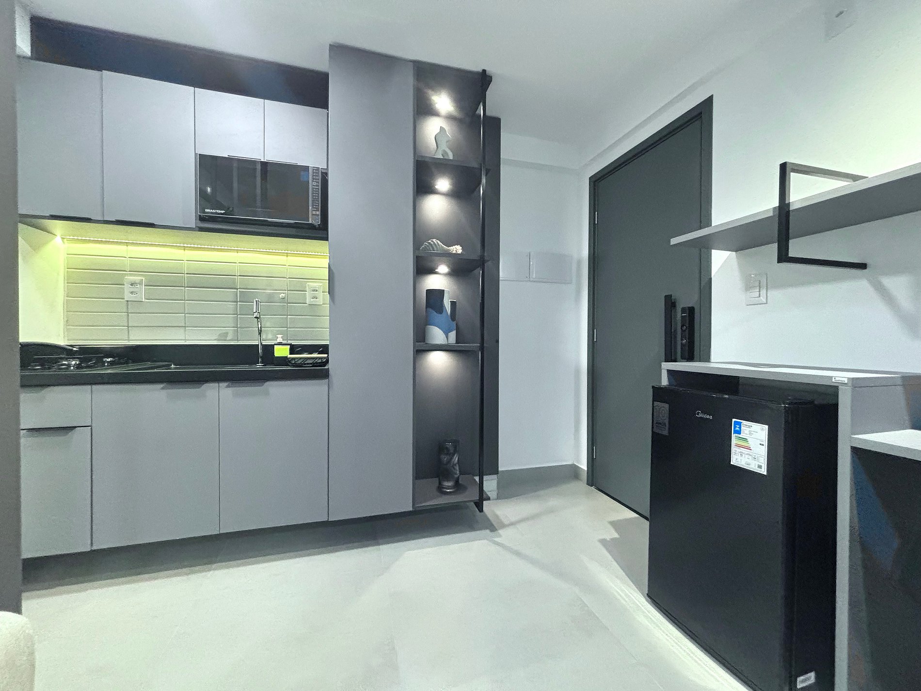 • Cozinha compacta equipada: frigobar, micro-ondas, fogão a gás, utensílios e louças.