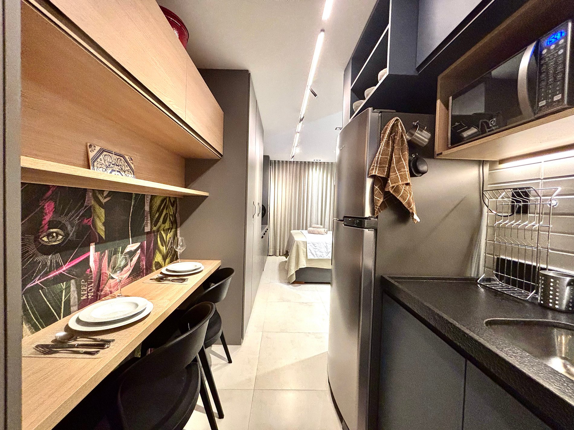 • Cozinha compacta equipada: geladeira, micro-ondas, fogão a gás, airfryer, liquidificador, sanduicheira, utensílios e louças.