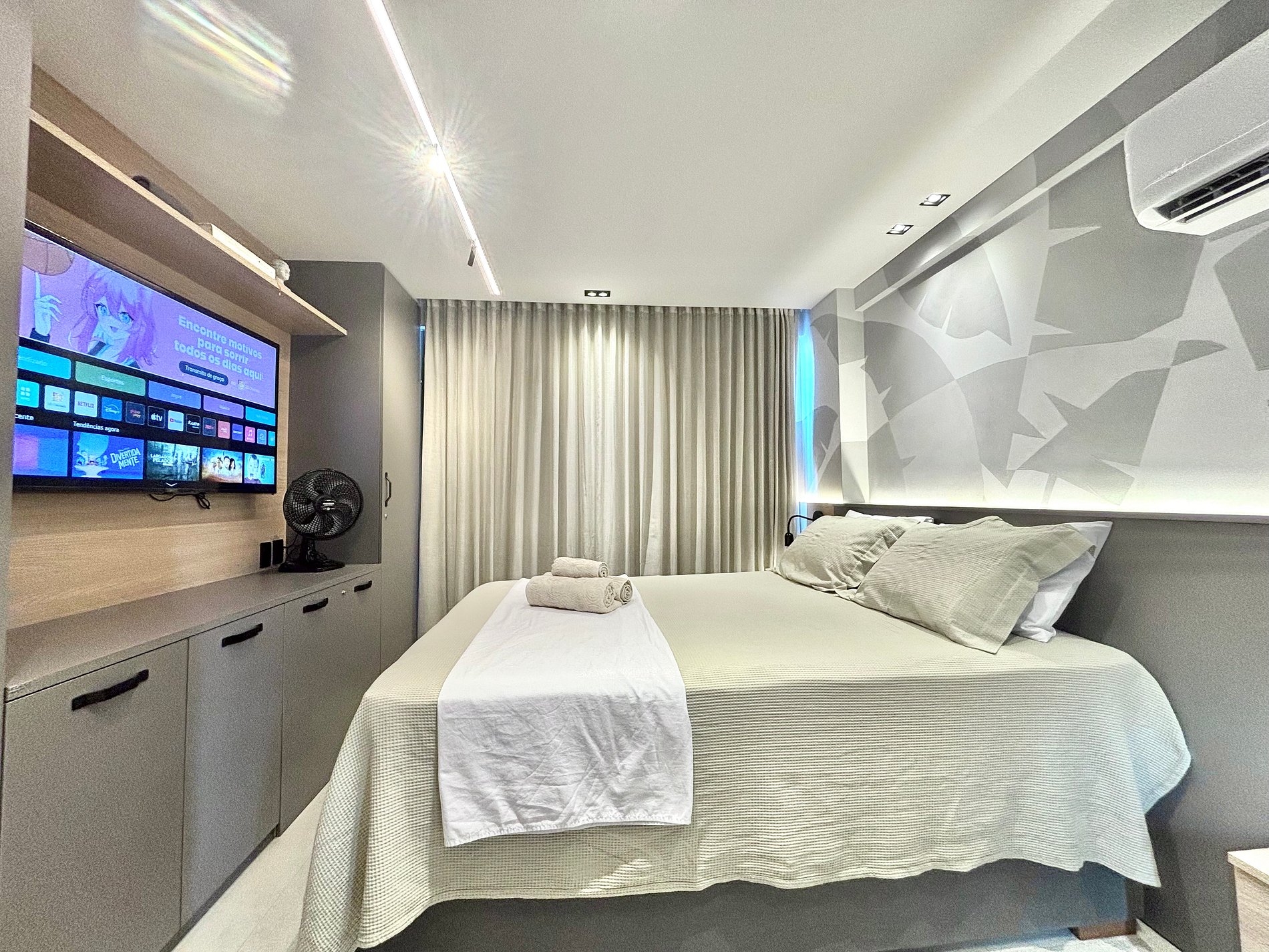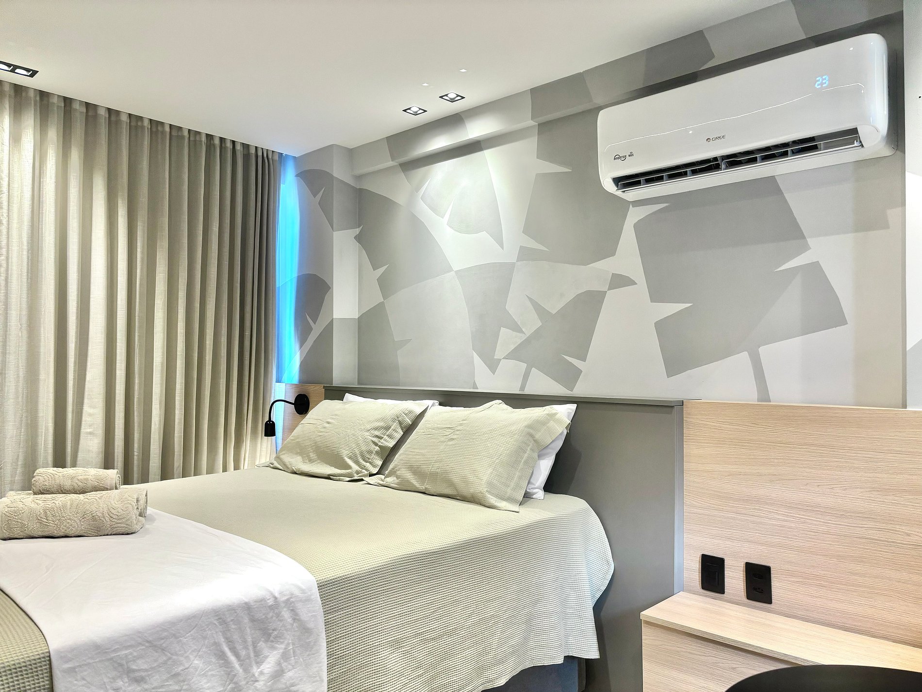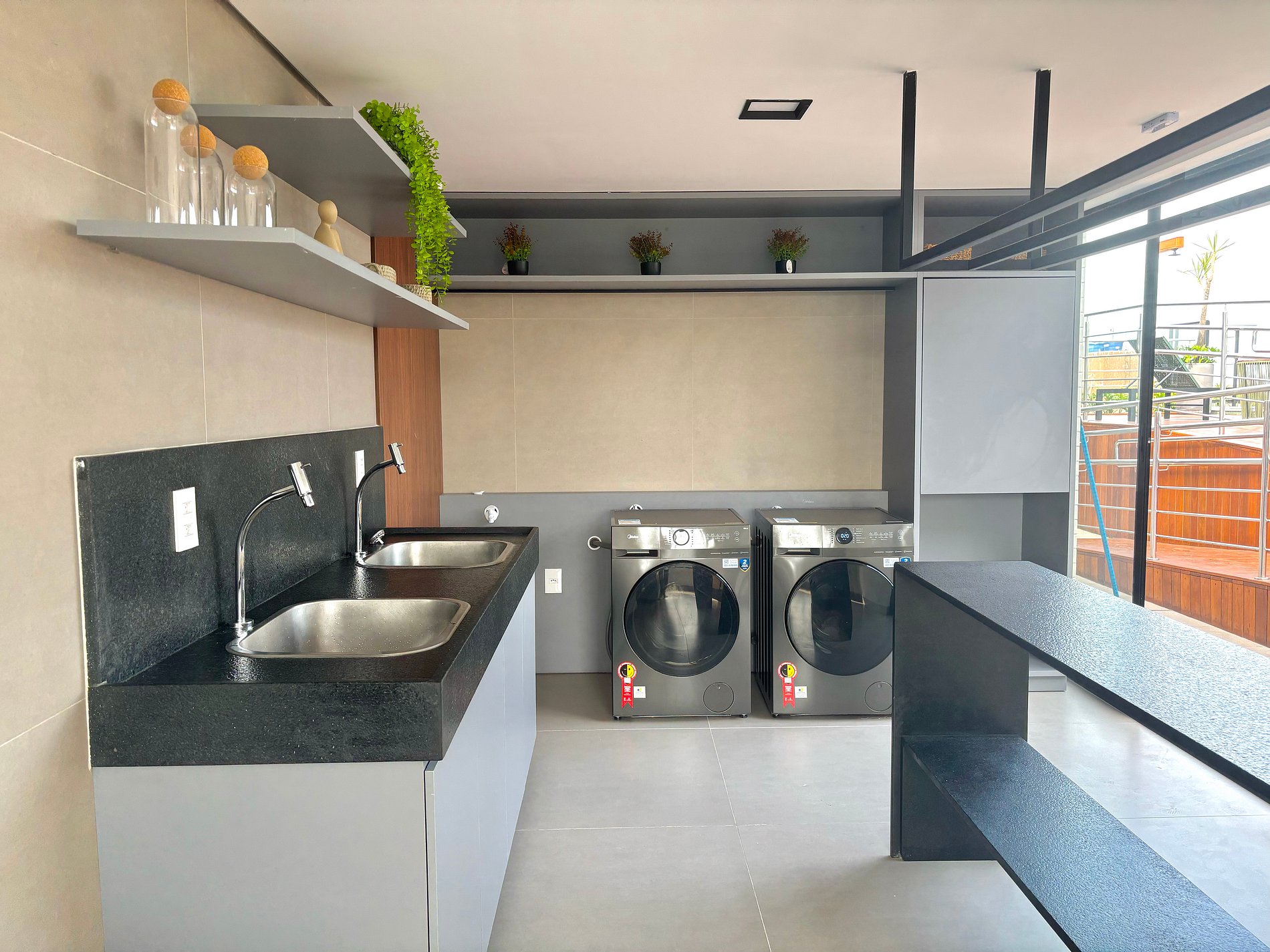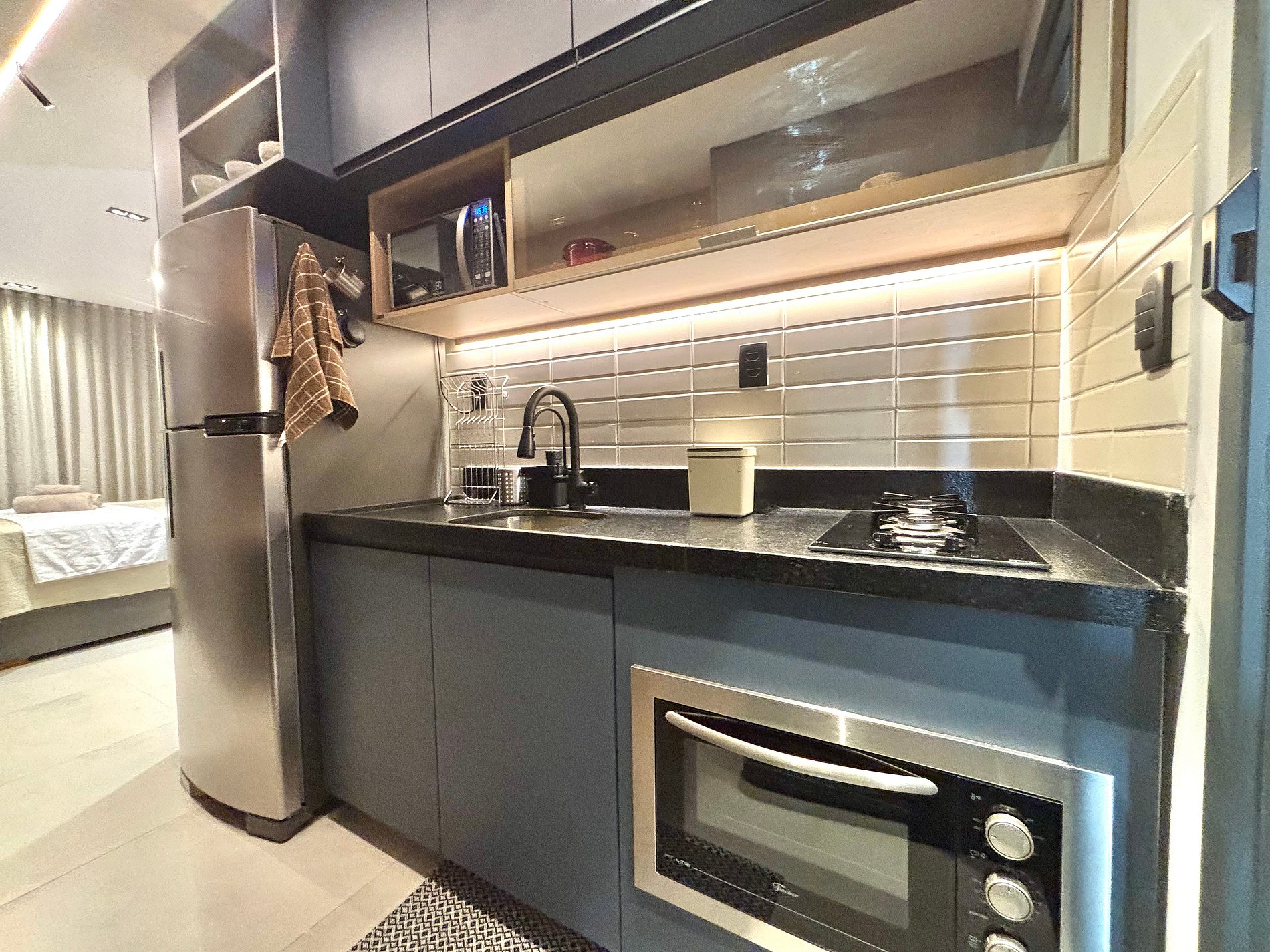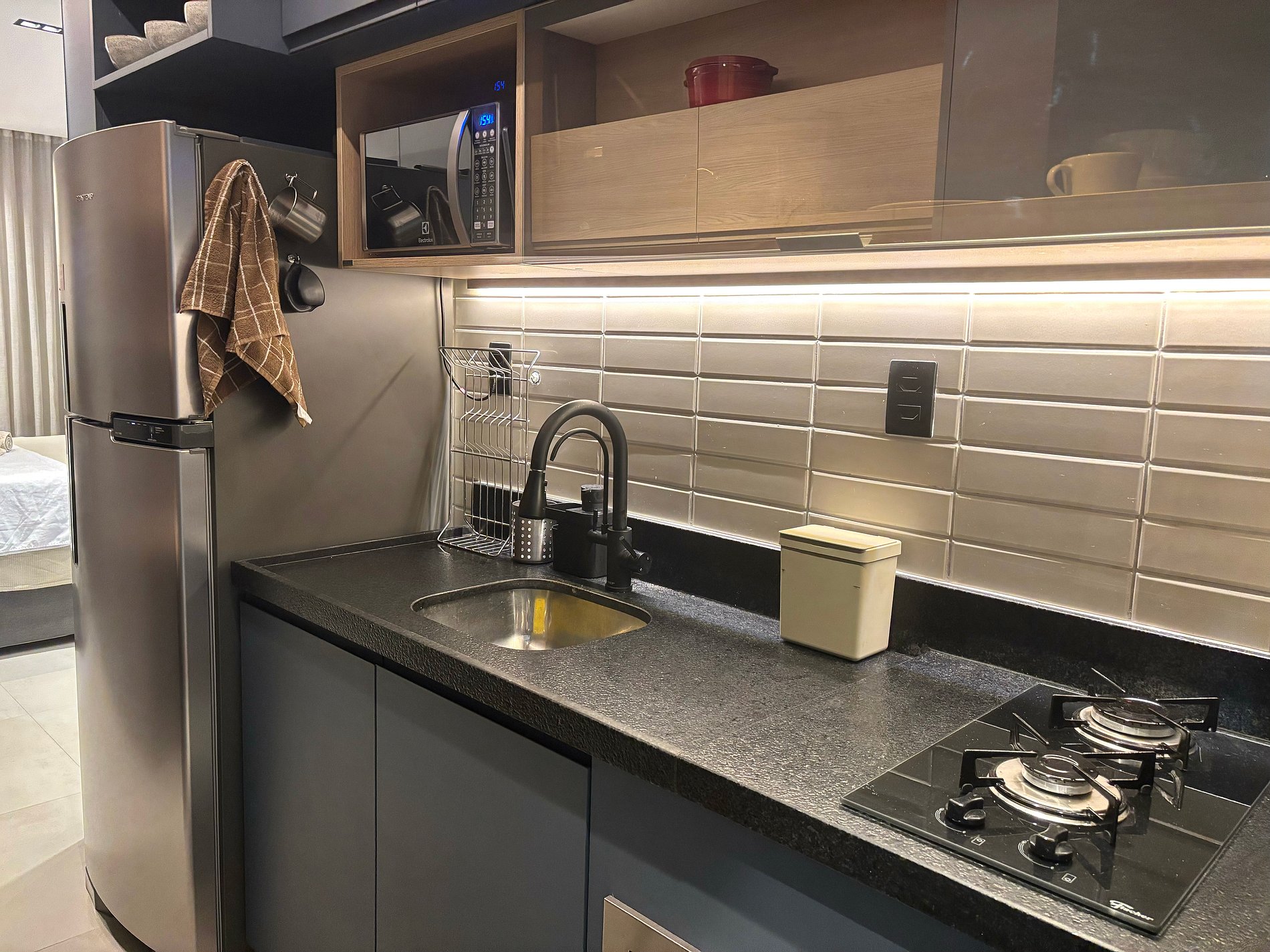 • Cozinha compacta equipada: geladeira, micro-ondas, fogão a gás, airfryer, liquidificador, sanduicheira, utensílios e louças.