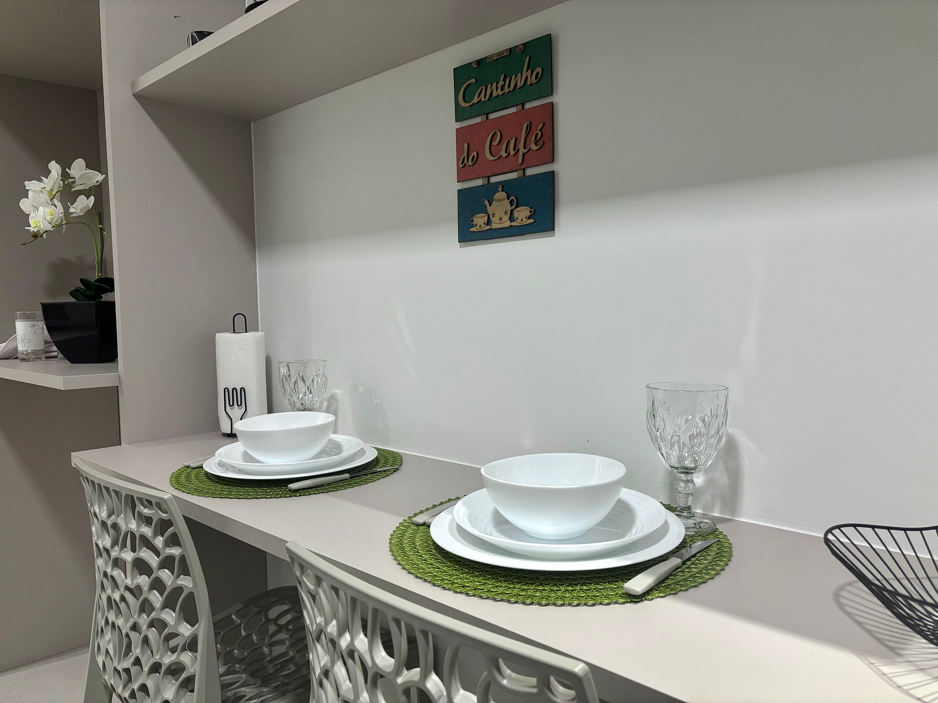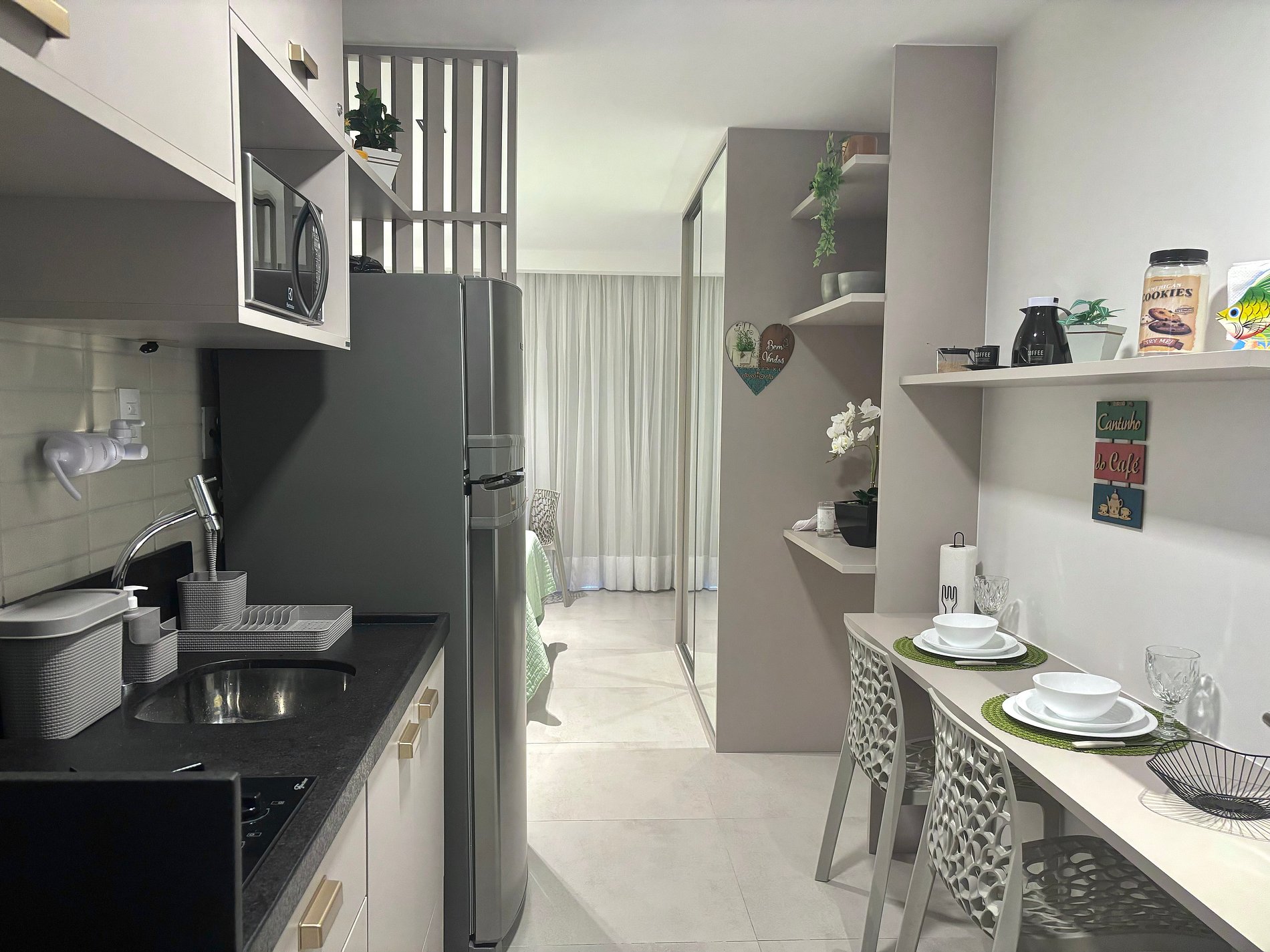 • Cozinha compacta equipada: geladeira, micro-ondas, airfryer, fogão a gás, utensílios e louças.