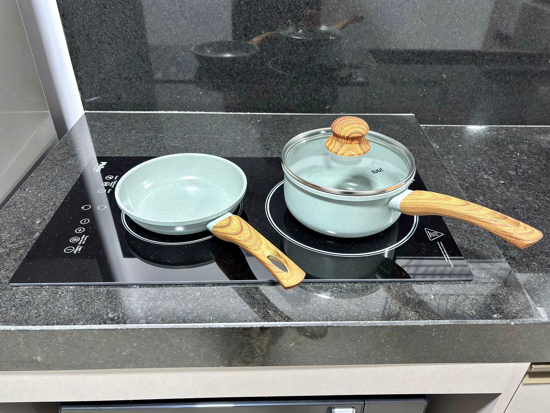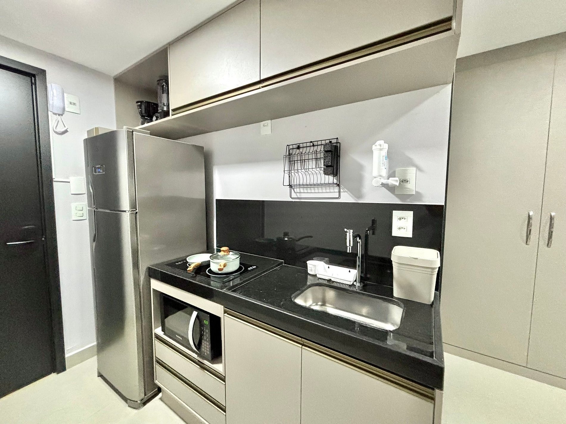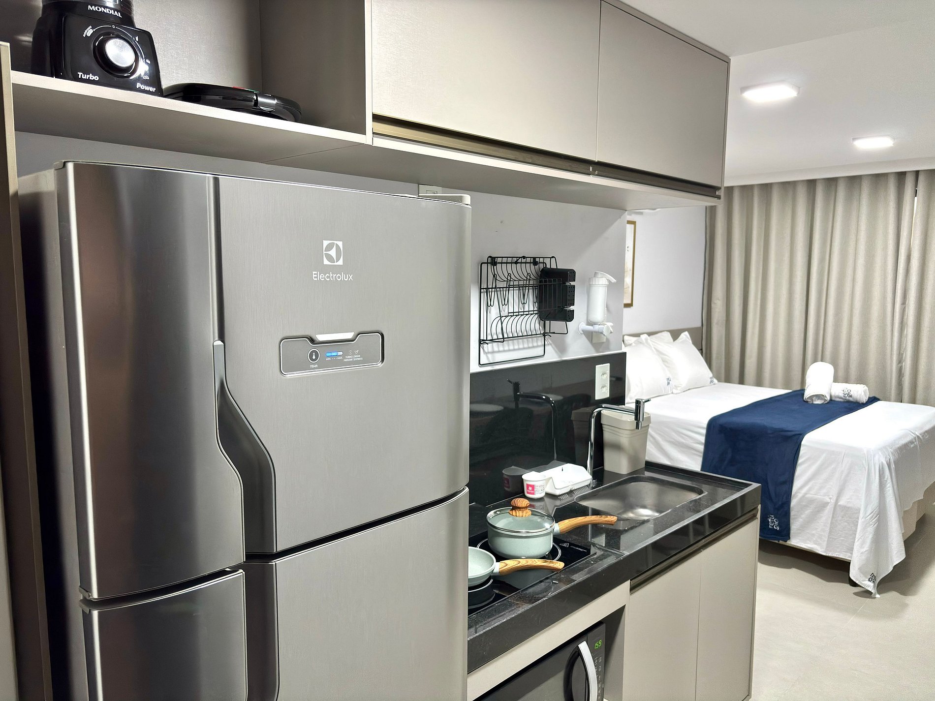 • Cozinha compacta com fogão elétrico de 2 bocas, frigobar, micro-ondas, sanduicheira, cafeteira elétrica, panelas, utensílios e louças.