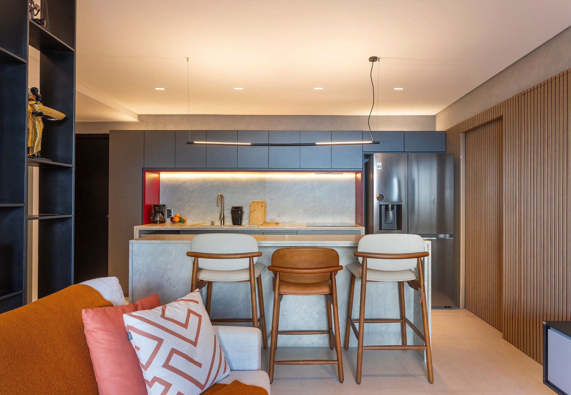 • Cozinha compacta com fogão elétrico de 2 bocas, geladeira, micro-ondas, cafeteira elétrica, air-fryer, liquidificador, panelas, utensílios e louças.