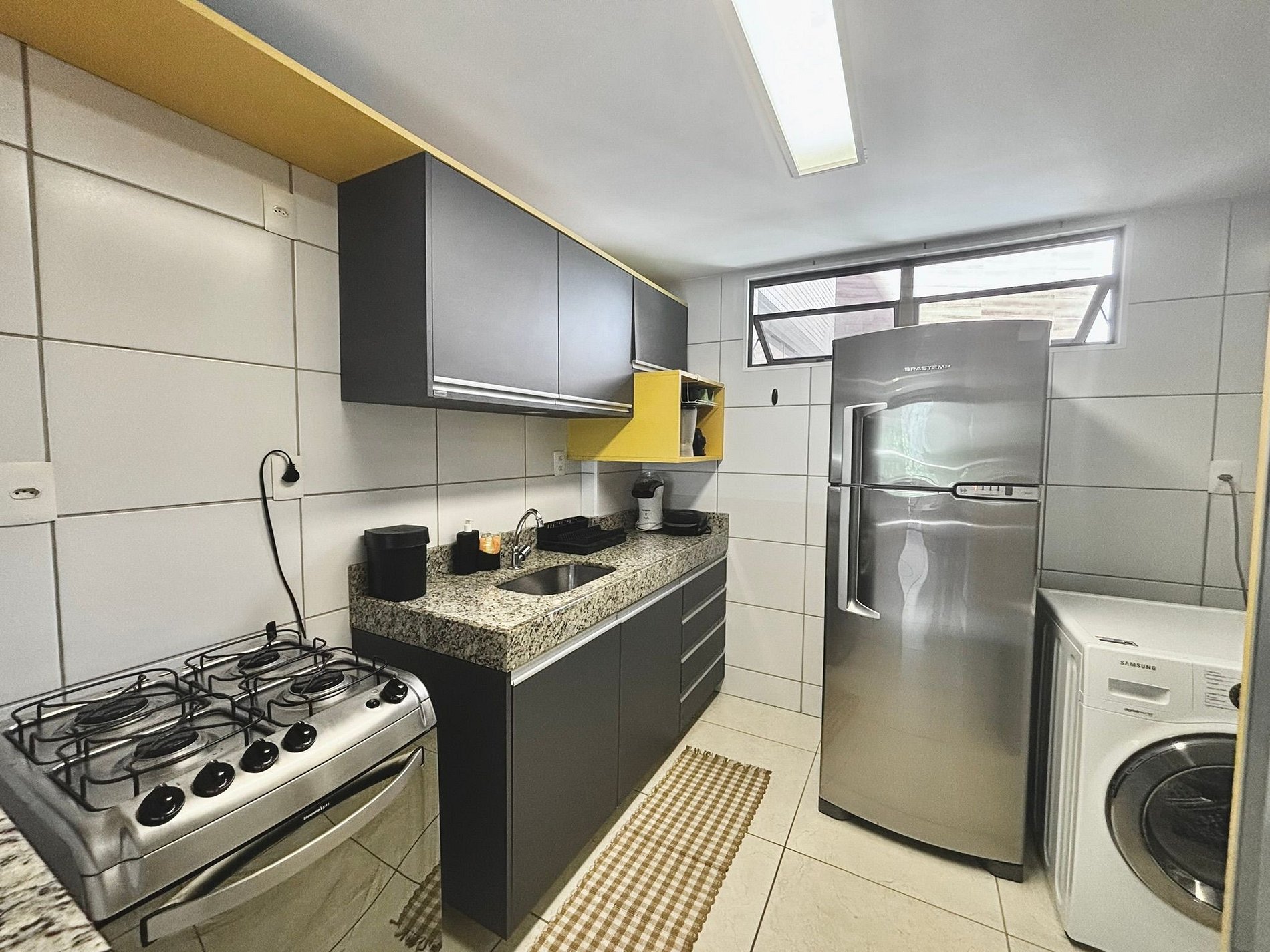 • Cozinha compacta equipada: geladeira, micro-ondas, fogão e forno a gás, airfryer, liquidificador, utensílios e louças.