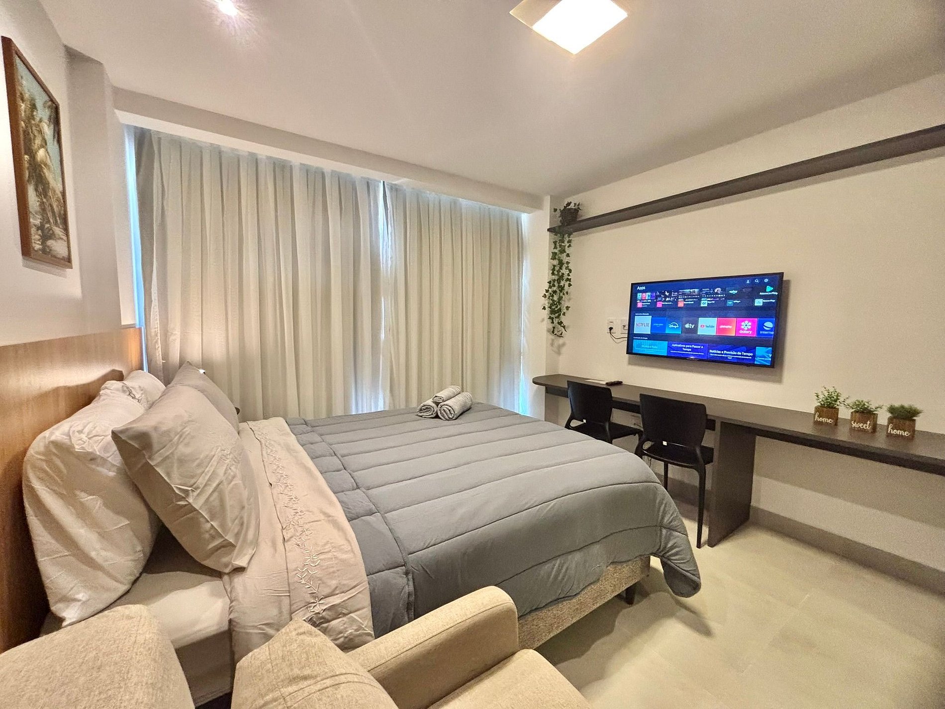 Flat acomoda confortavelmente 4pessoas, com 1 cama queen e 1 sofá-cama casal.
