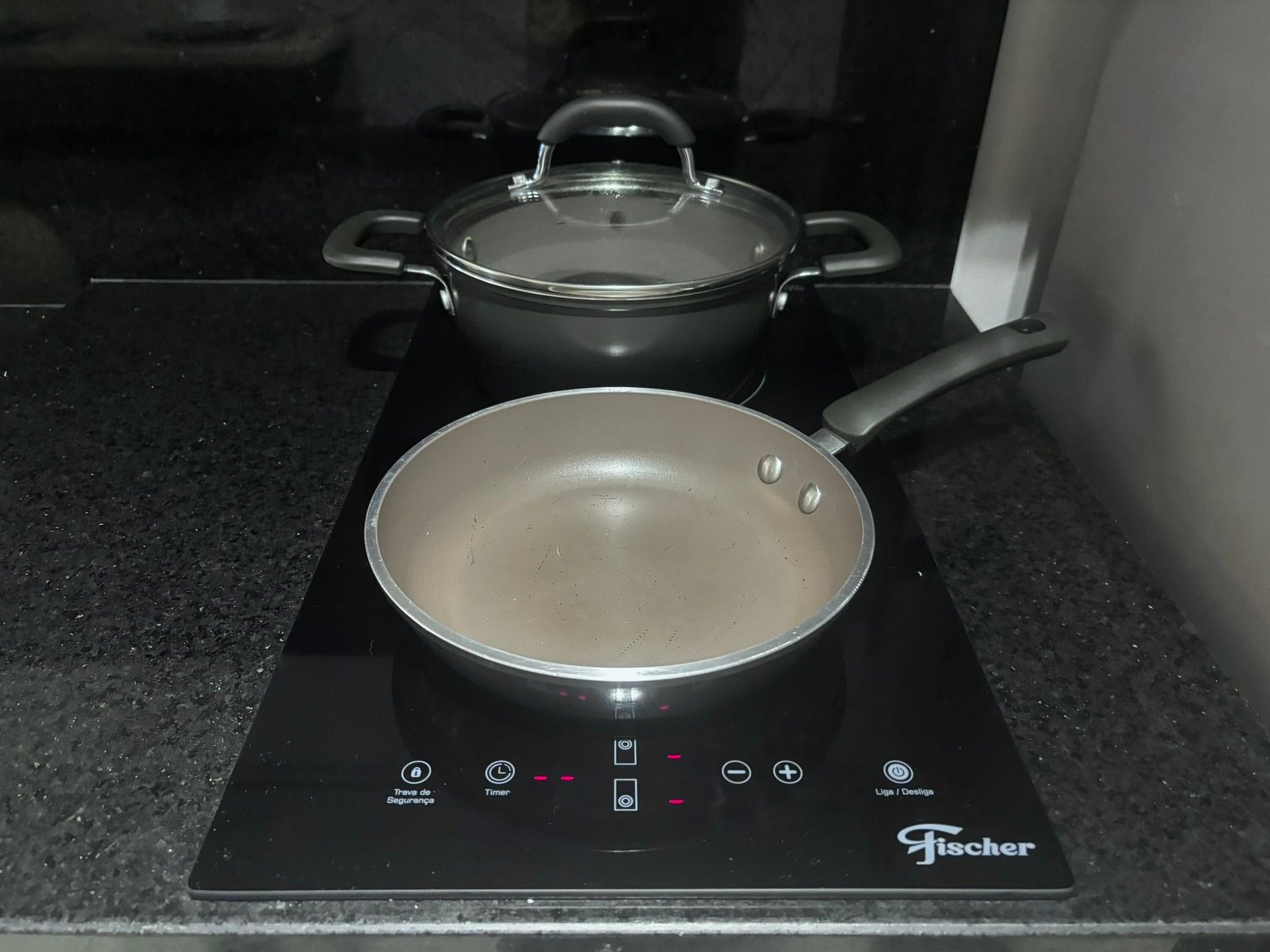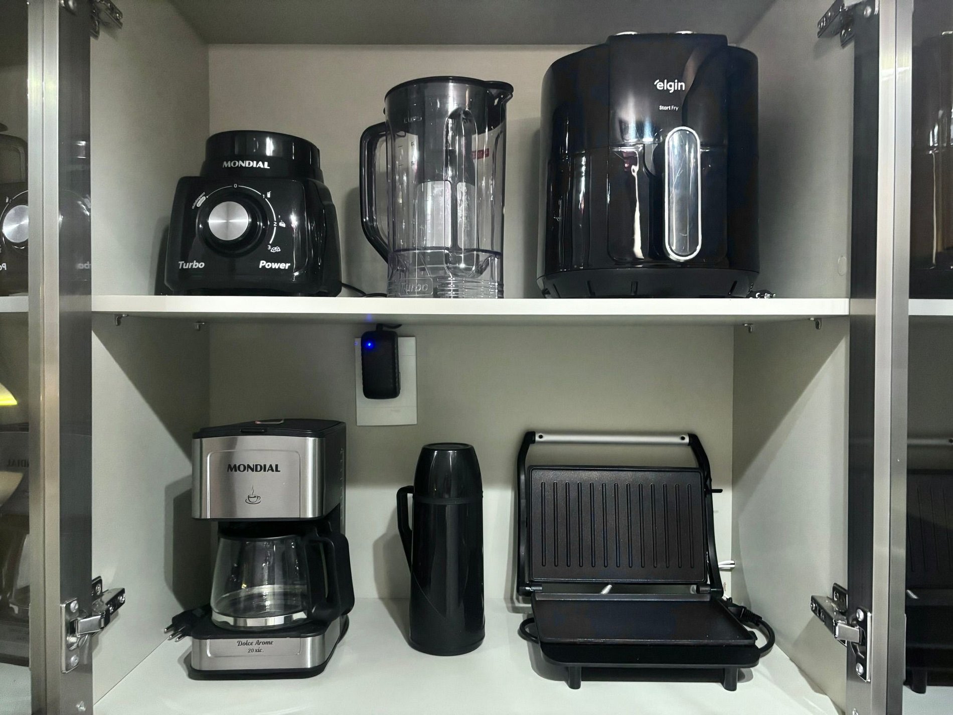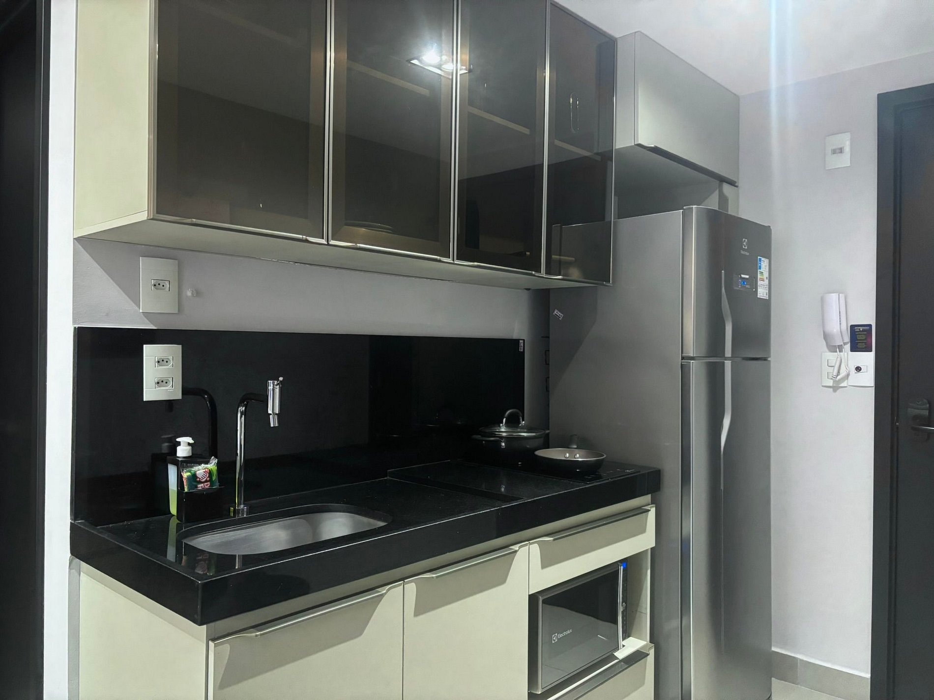 • Cozinha compacta com fogão elétrico de 2 bocas, geladeira, liquidificador, micro-ondas, airfryer, sanduicheira, cafeteira elétrica, panelas, utensílios e louças.