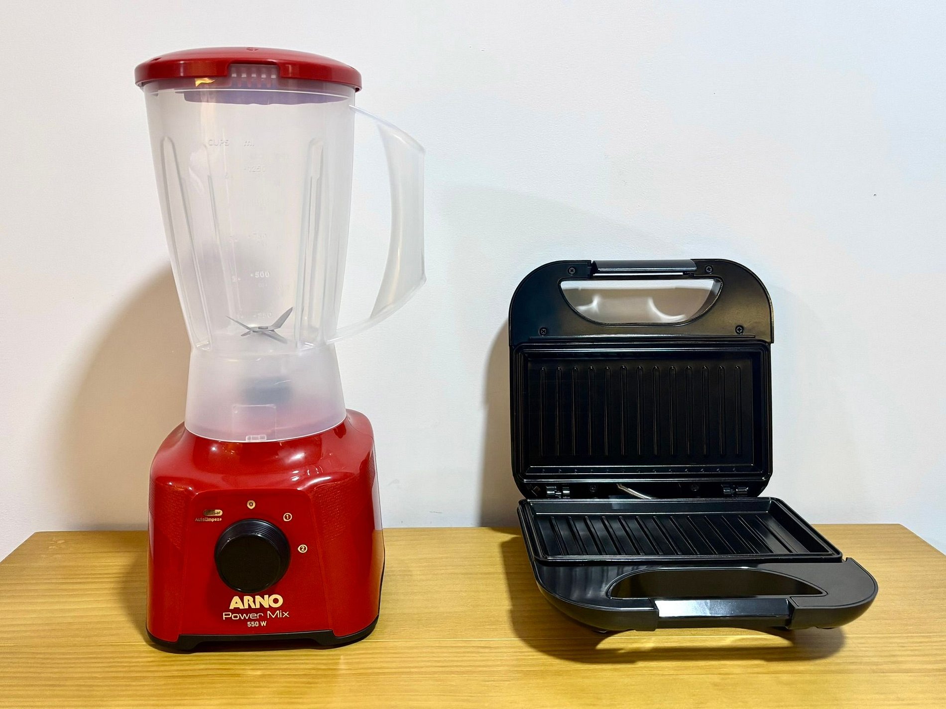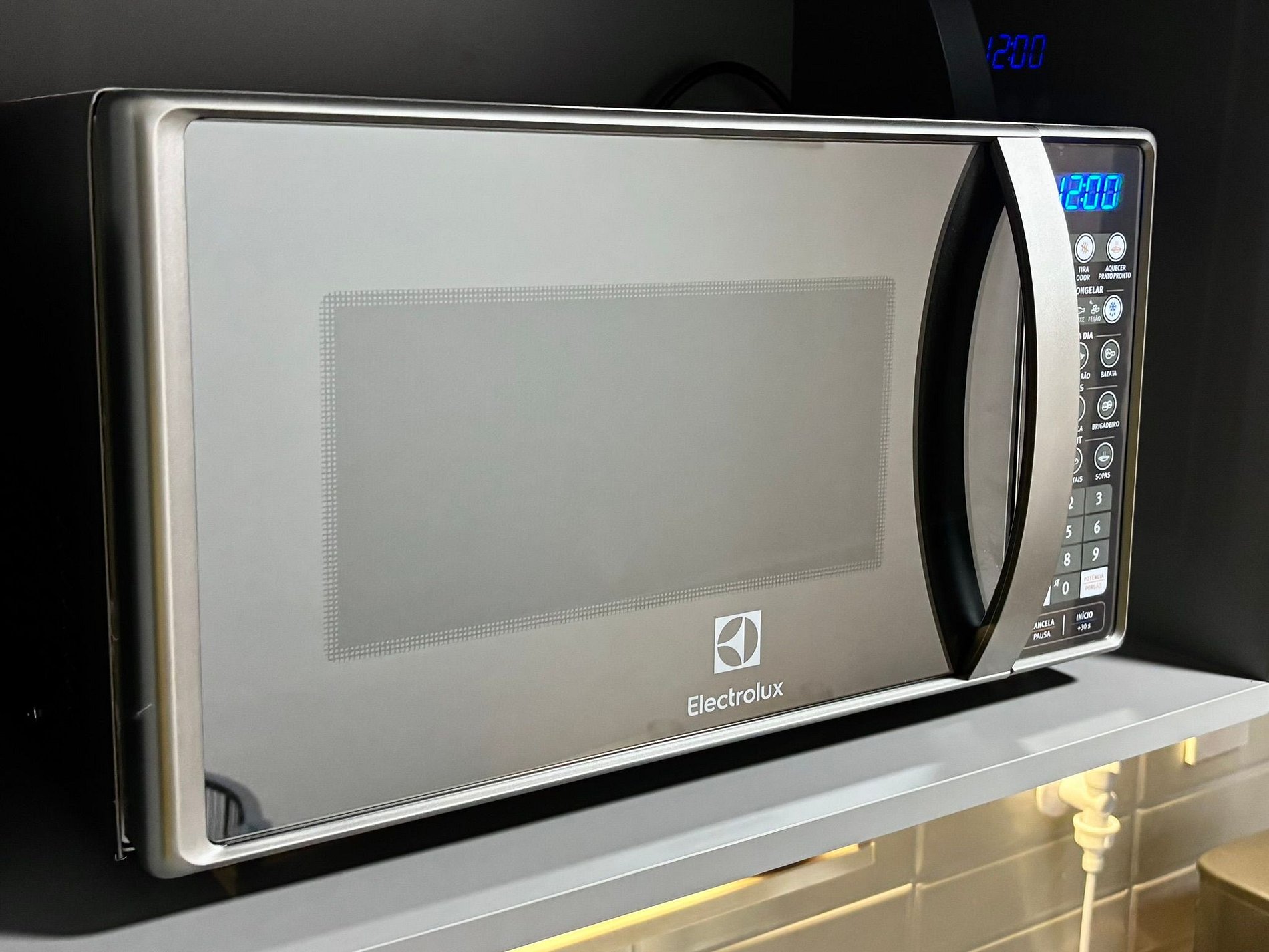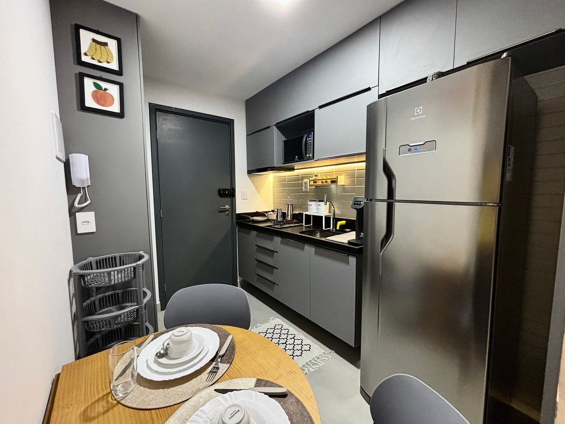 • Cozinha compacta equipada: geladeira, micro-ondas, fogão por indução, liquidificador, sanduicheira, utensílios e louças.