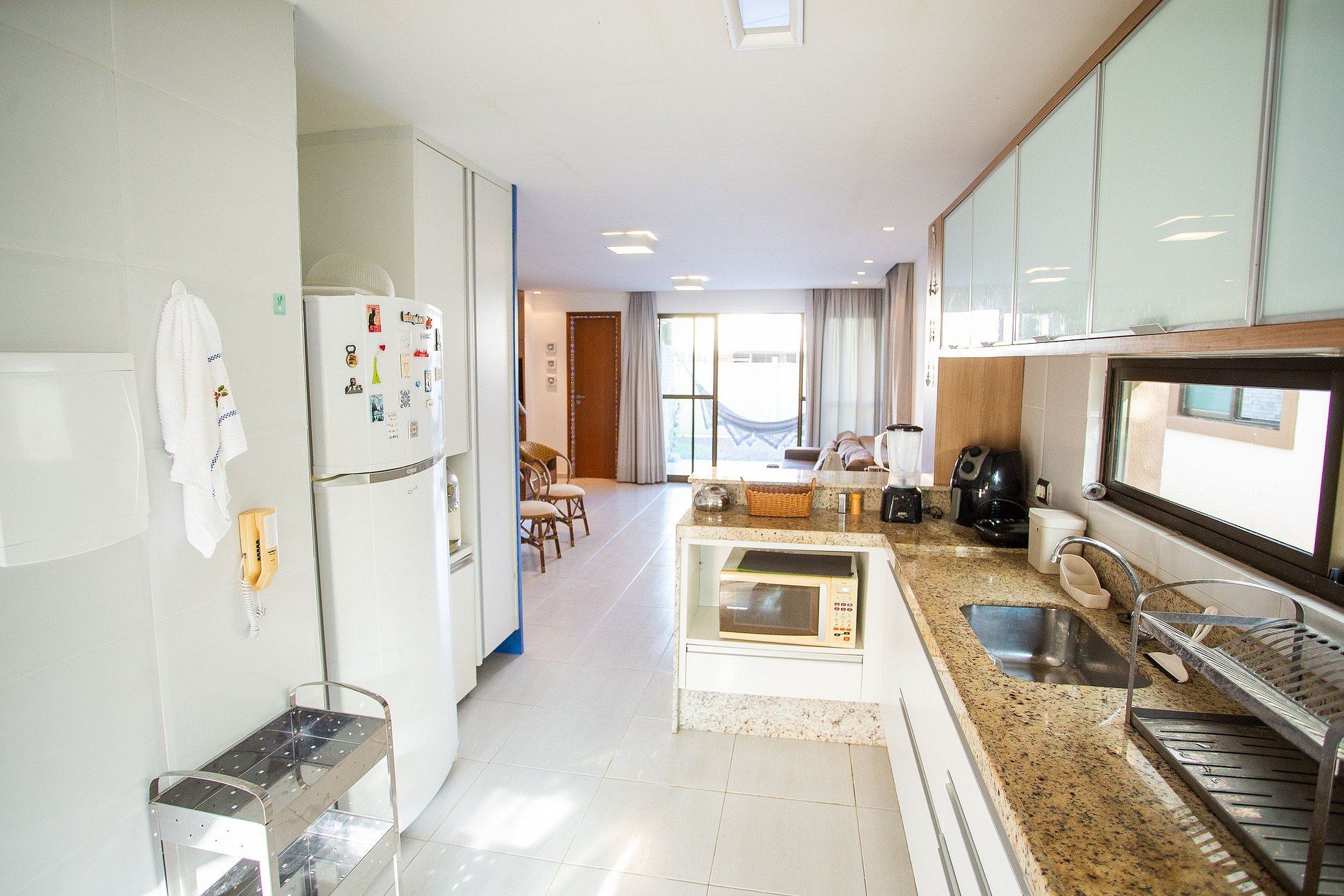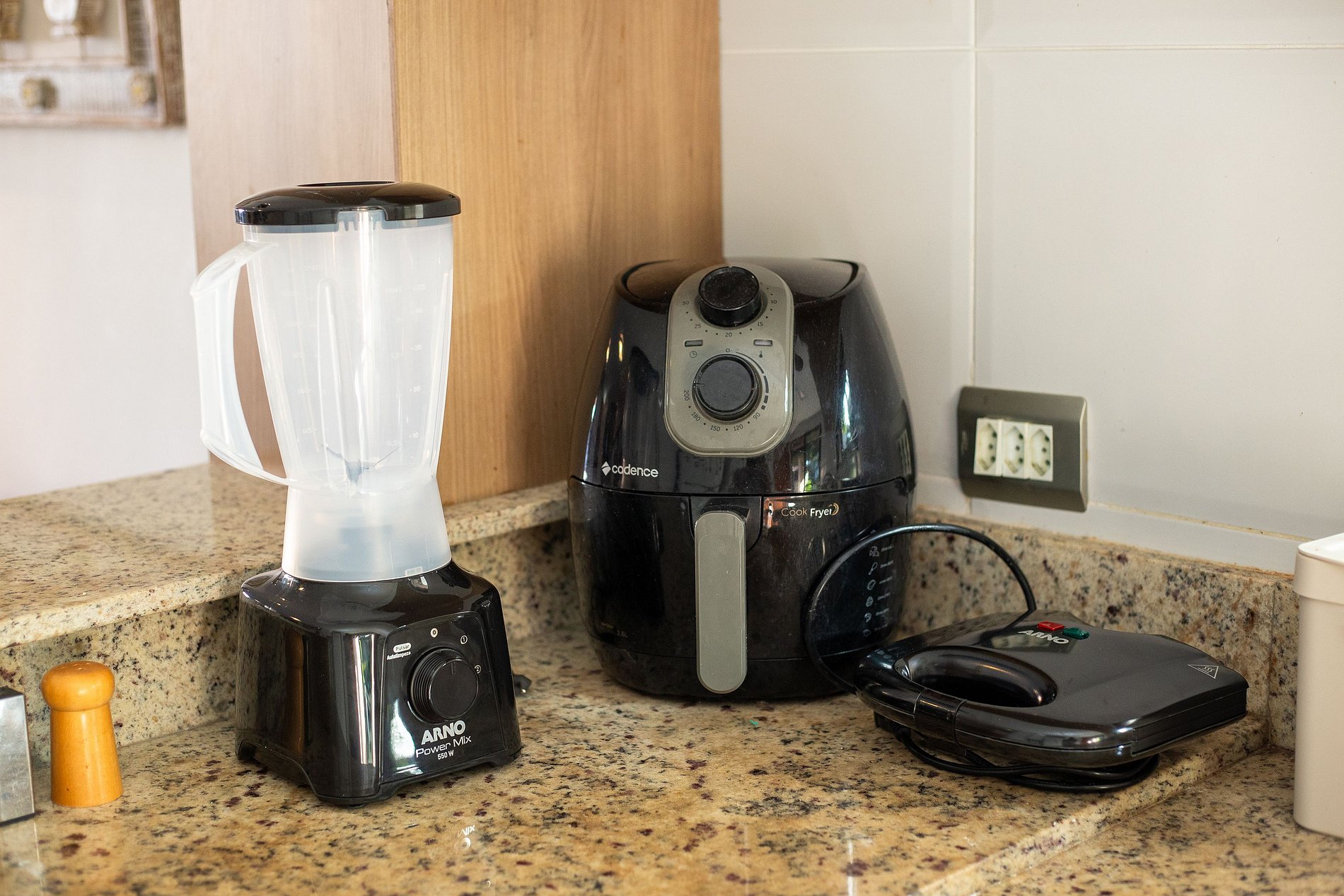 • Geladeira, forno e fogão a gás, airfryer, cafeteira, liquidificador, sanduicheira, panelas, utensílios e louças.