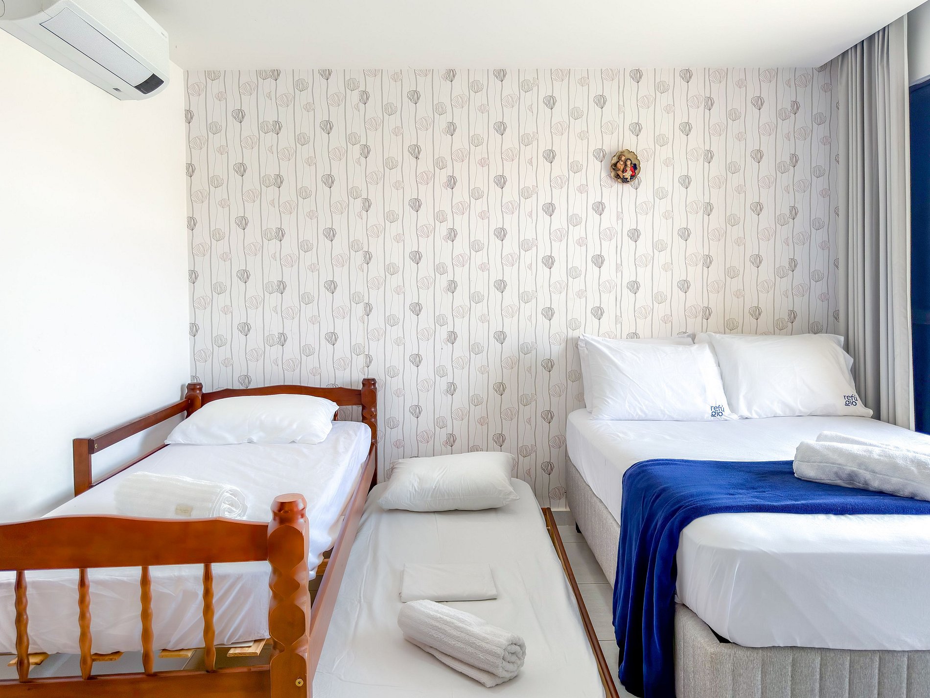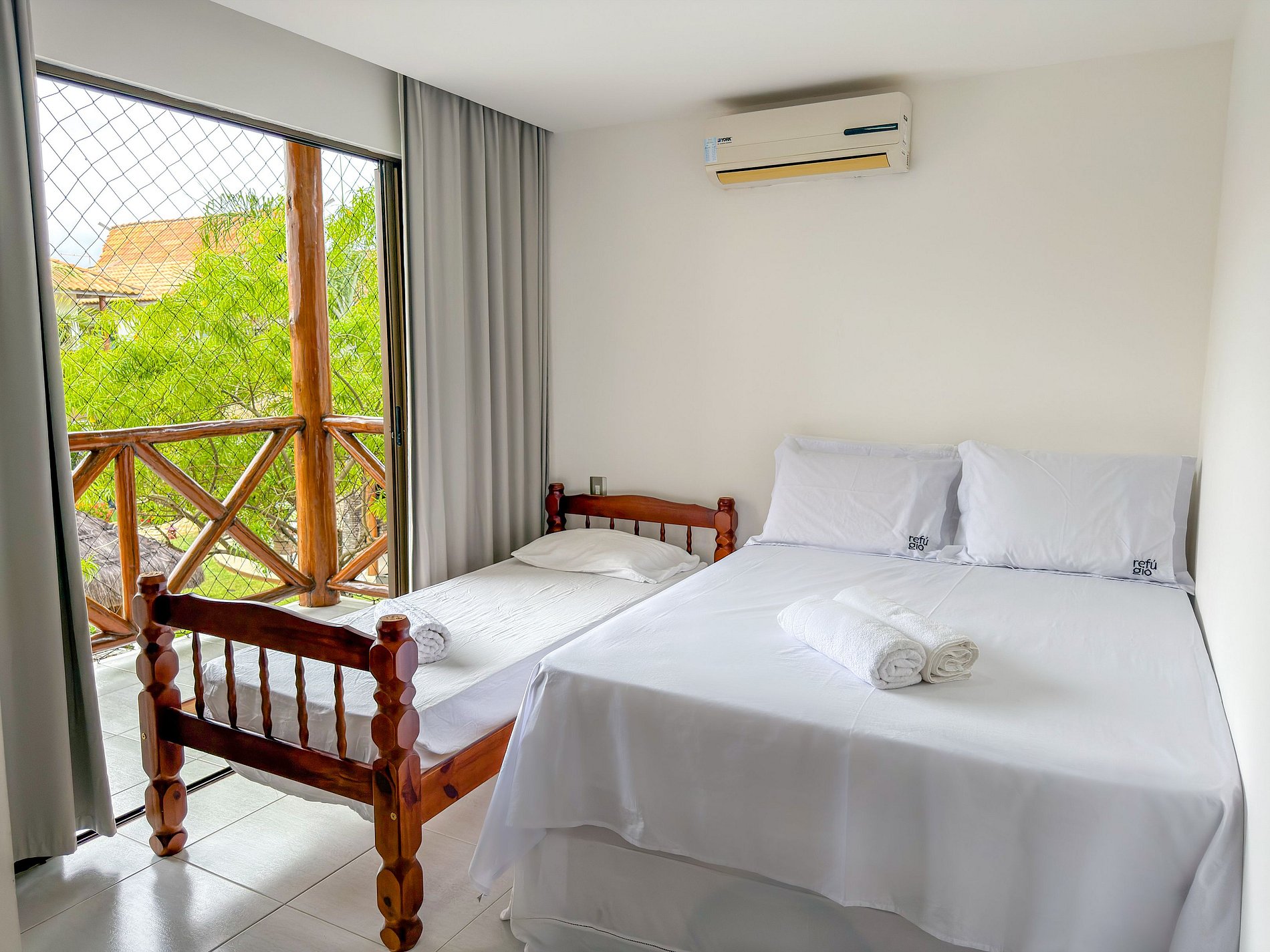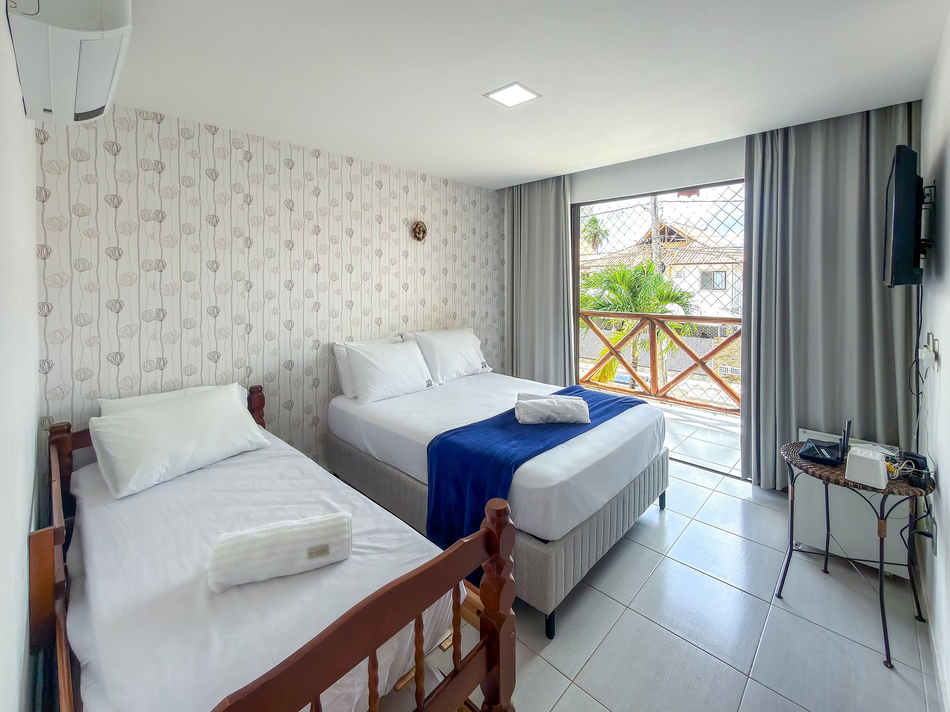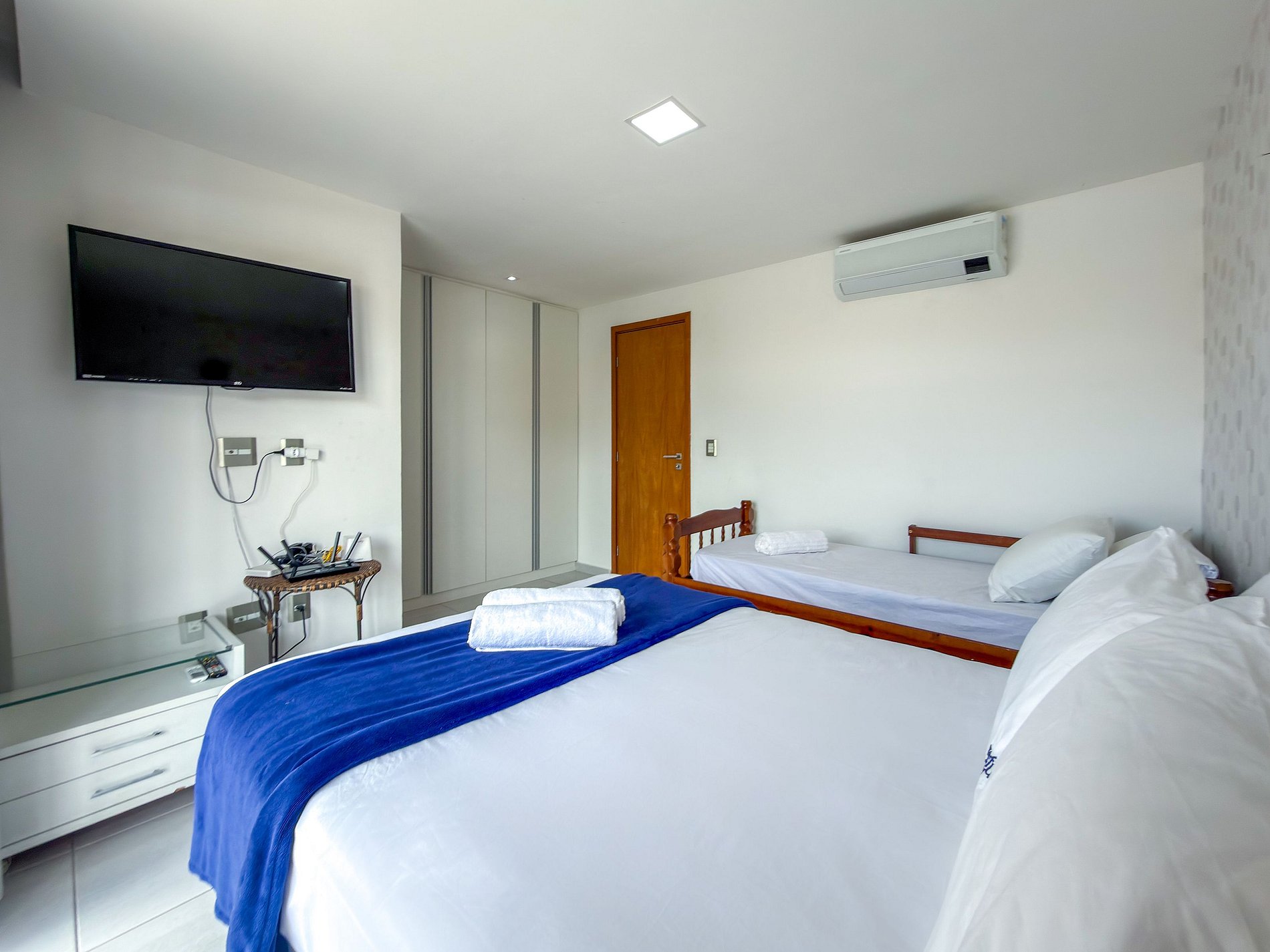 • Suíte: cama casal + cama de solteiro + colchão de solteiro, com TV e ar-condicionado.