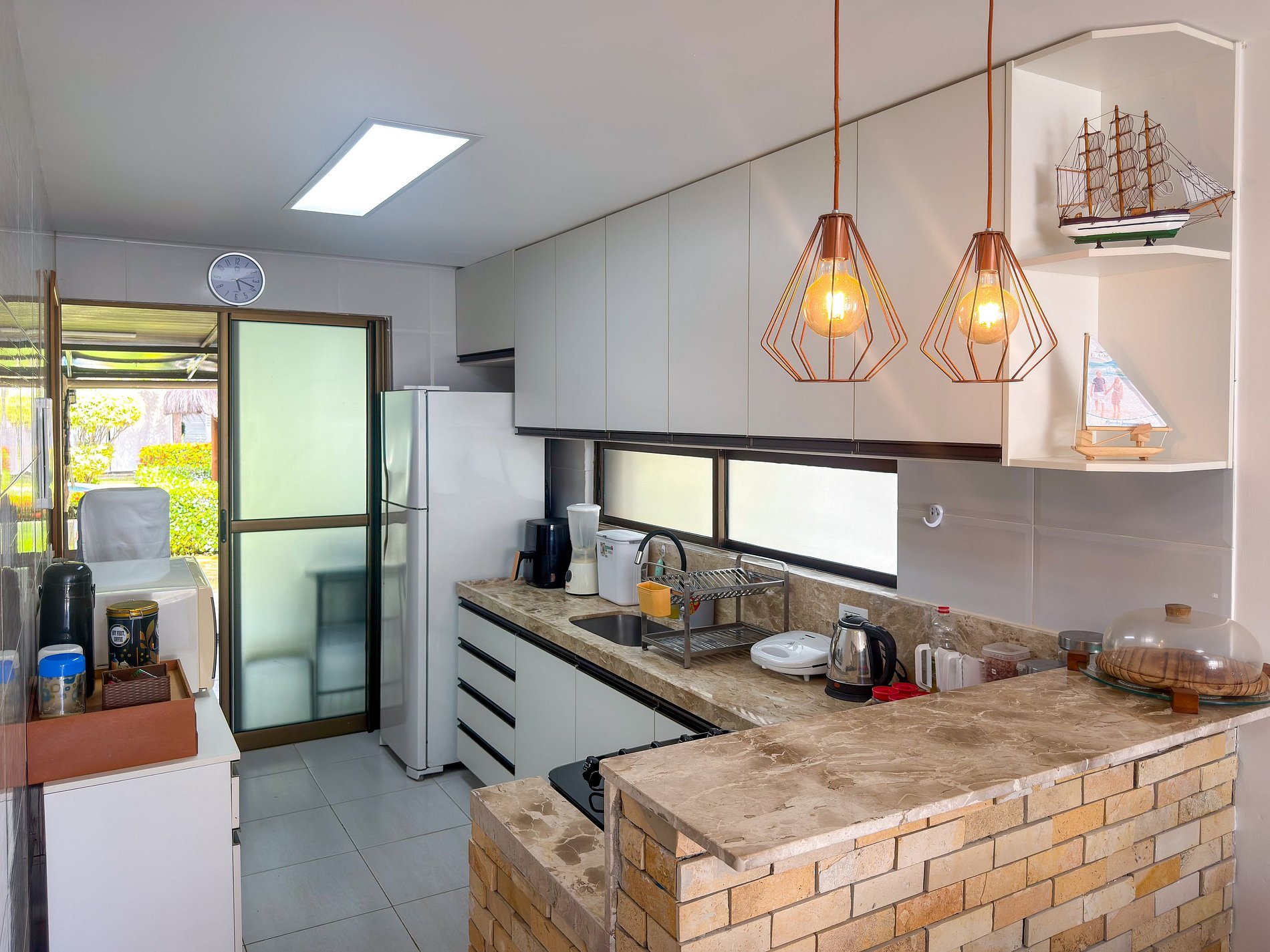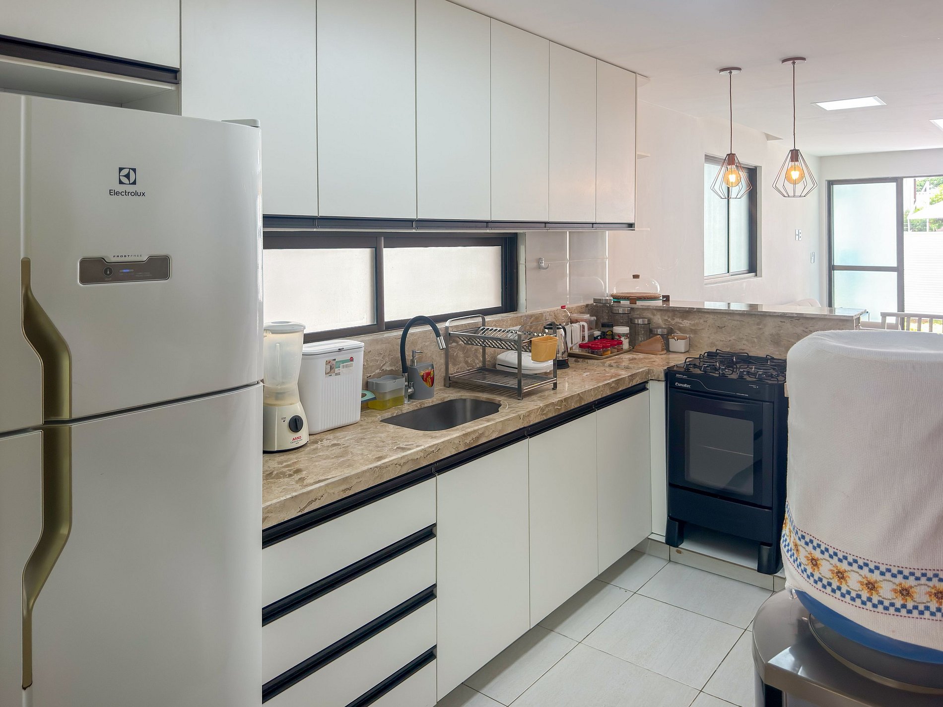 • Geladeira, forno e fogão a gás, airfryer, cafeteira, chaleira, liquidificador, sanduicheira, panelas, utensílios e louças.