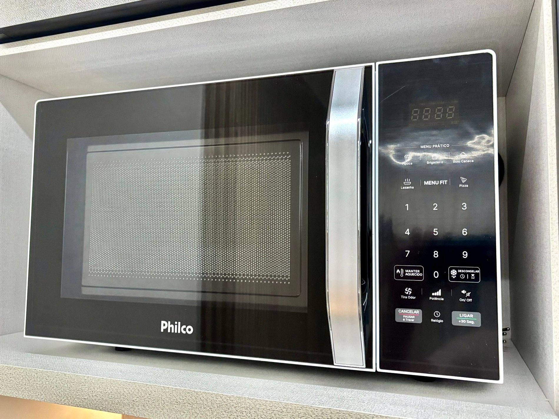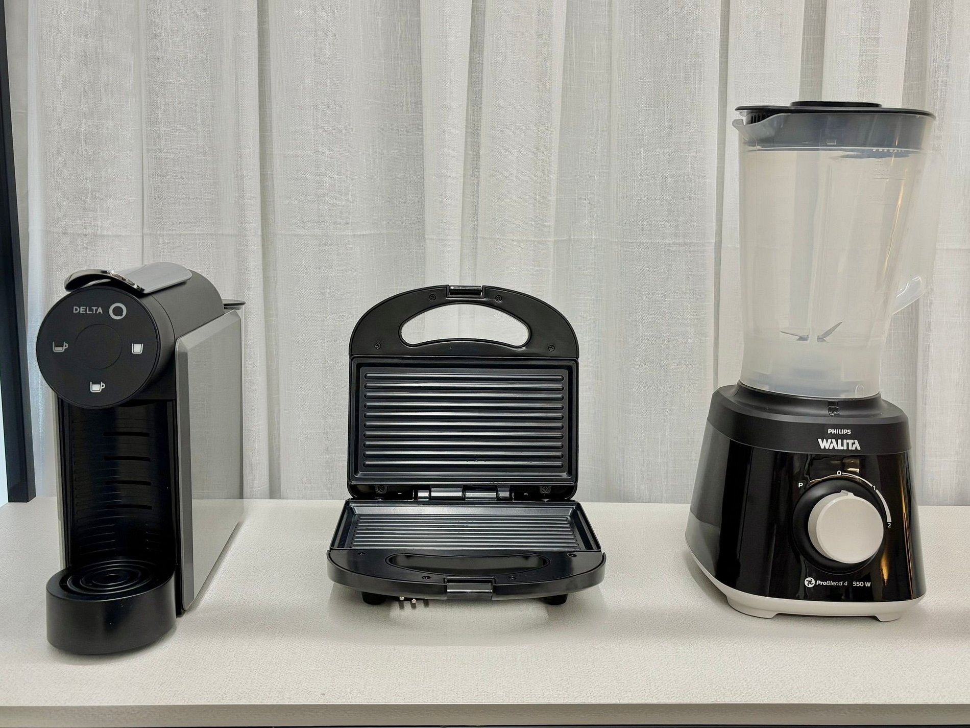 • Mini freezer, micro-ondas, fogão por indução, cafeteira, liquidificador, sanduicheira, panelas, utensílios e louças.
