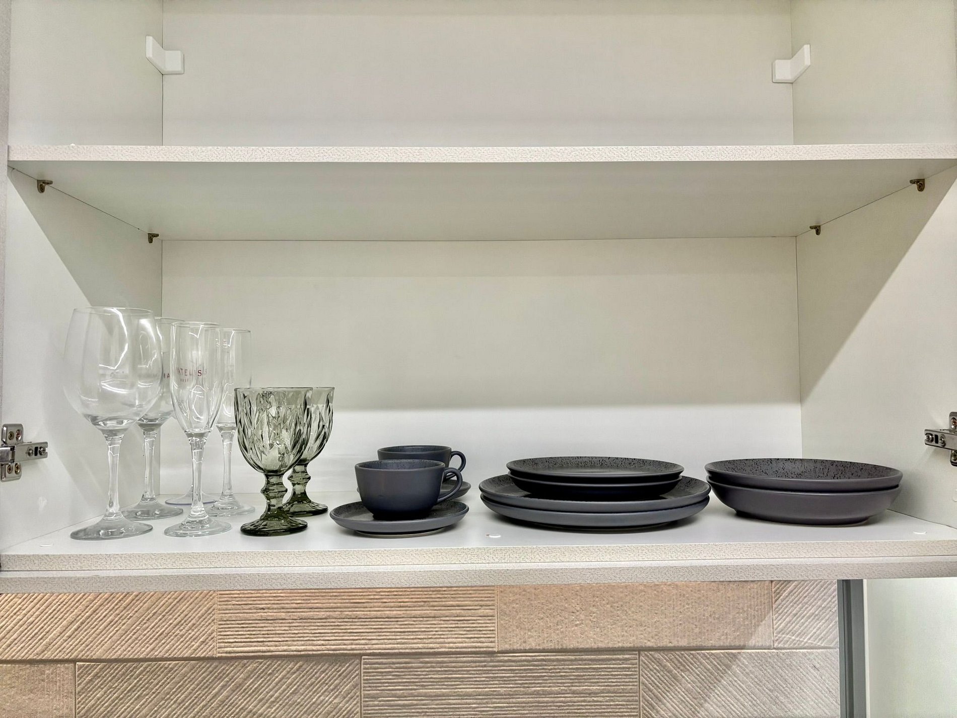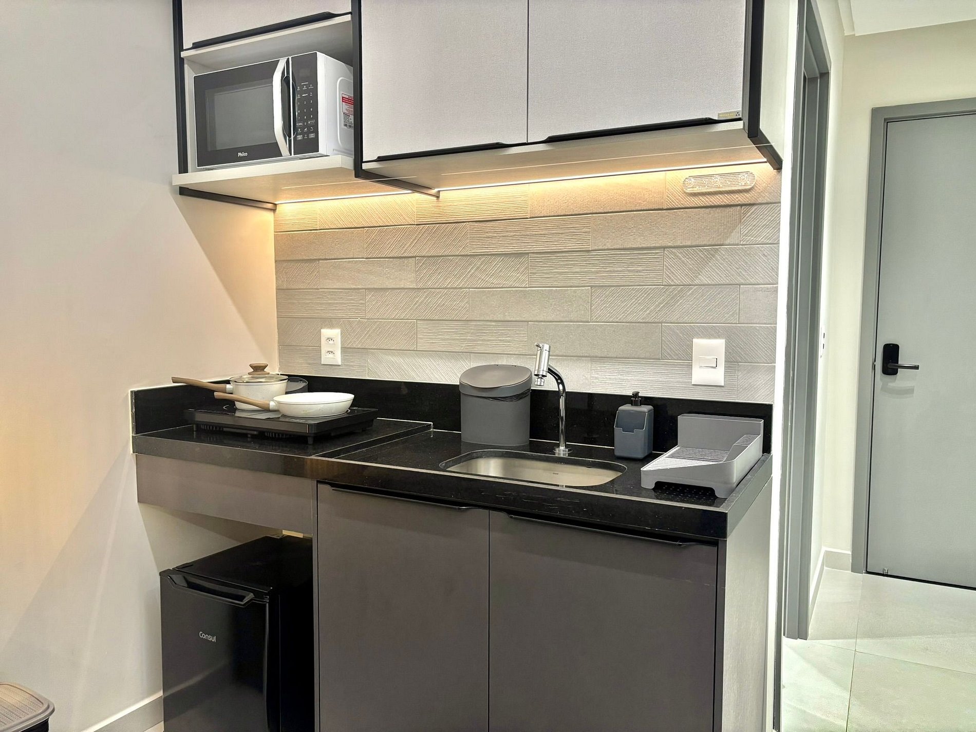 • Mini freezer, micro-ondas, fogão por indução, cafeteira, liquidificador, sanduicheira, panelas, utensílios e louças.