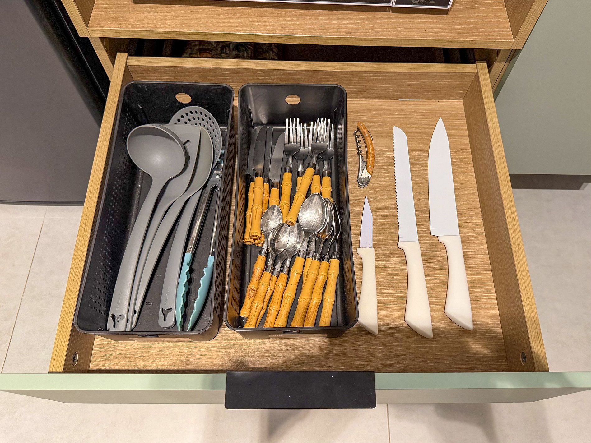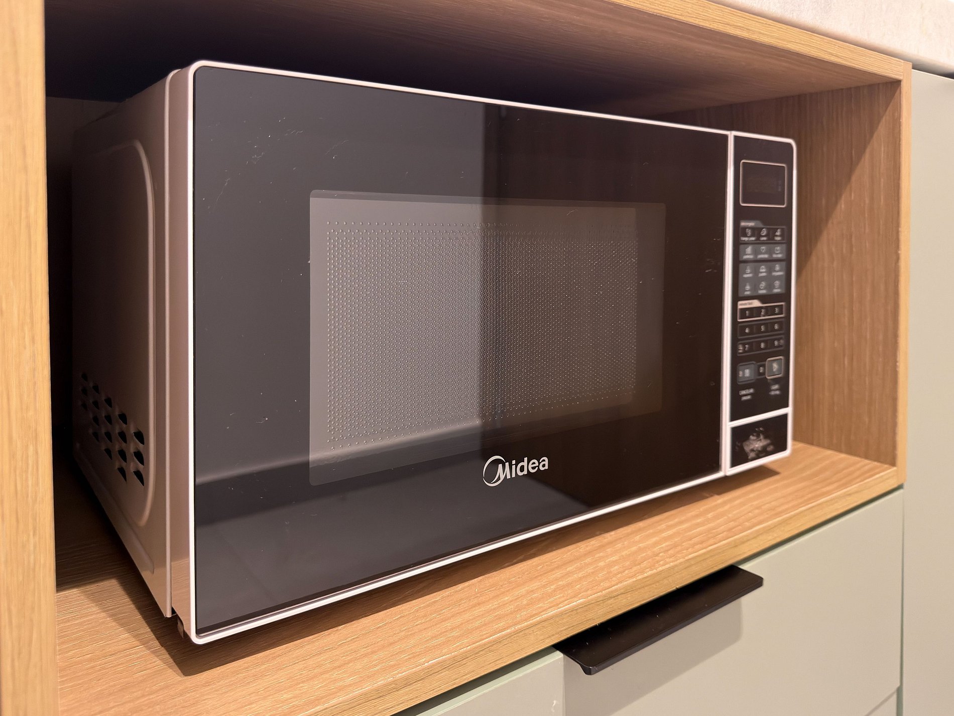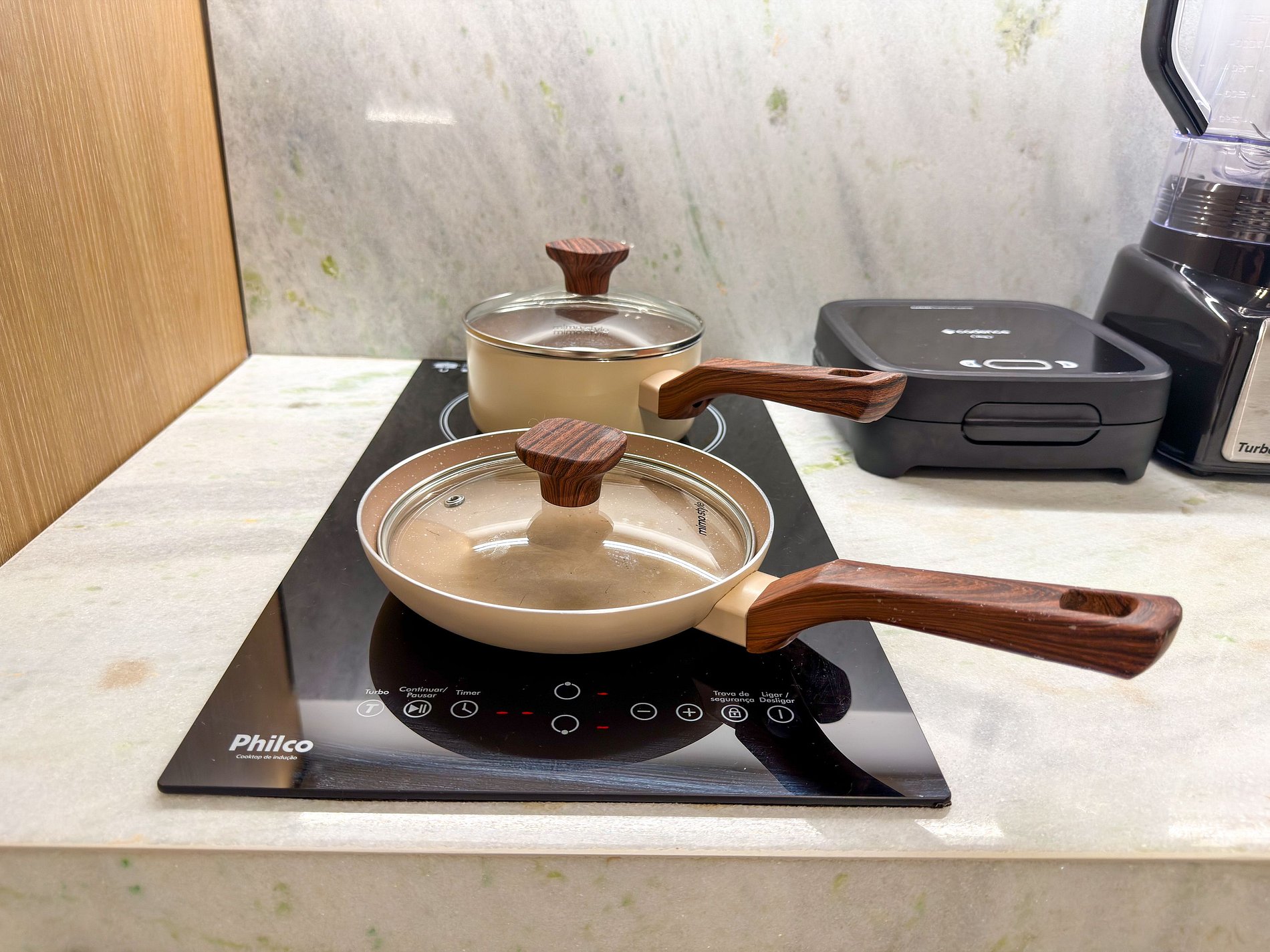 • Mini freezer, micro-ondas, fogão por indução portátil de 2 boca, cafeteira, liquidificador, sanduicheira, panelas, utensílios e louças.