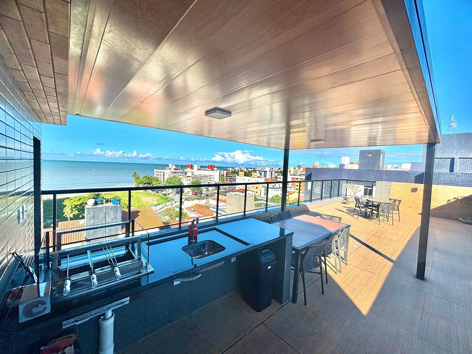 A infraestrutura do prédio inclui uma ampla área comum com churrasqueira e vista para o mar, ideal para momentos de lazer com amigos e família. No topo do edifício, você encontrará uma piscina na cobertura com vista deslumbrante do oceano, perfeita para relaxar após um dia na praia. O condomínio também conta com lavanderia coletiva, garantindo ainda mais praticidade durante sua hospedagem.